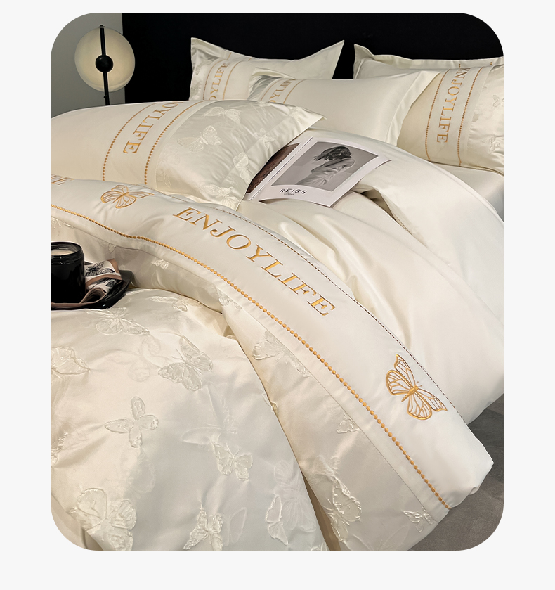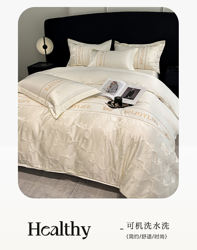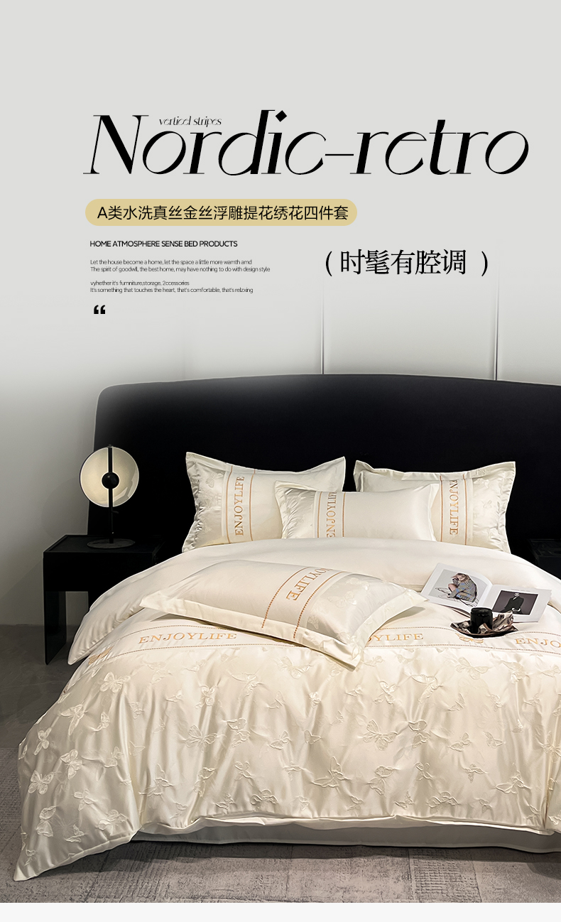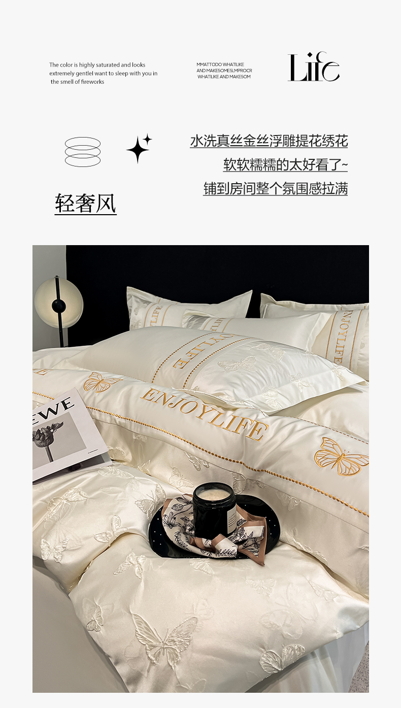 米彩家纺 2025新款A类水洗真丝金丝浮雕提花绣花四件套 富蝶-奶白