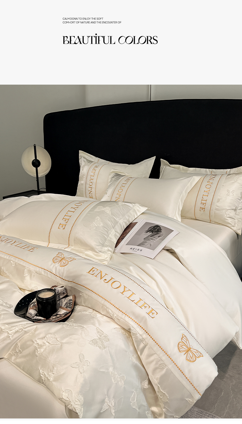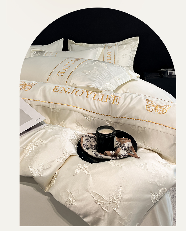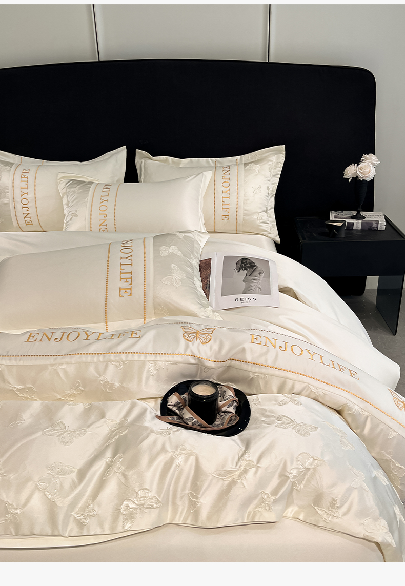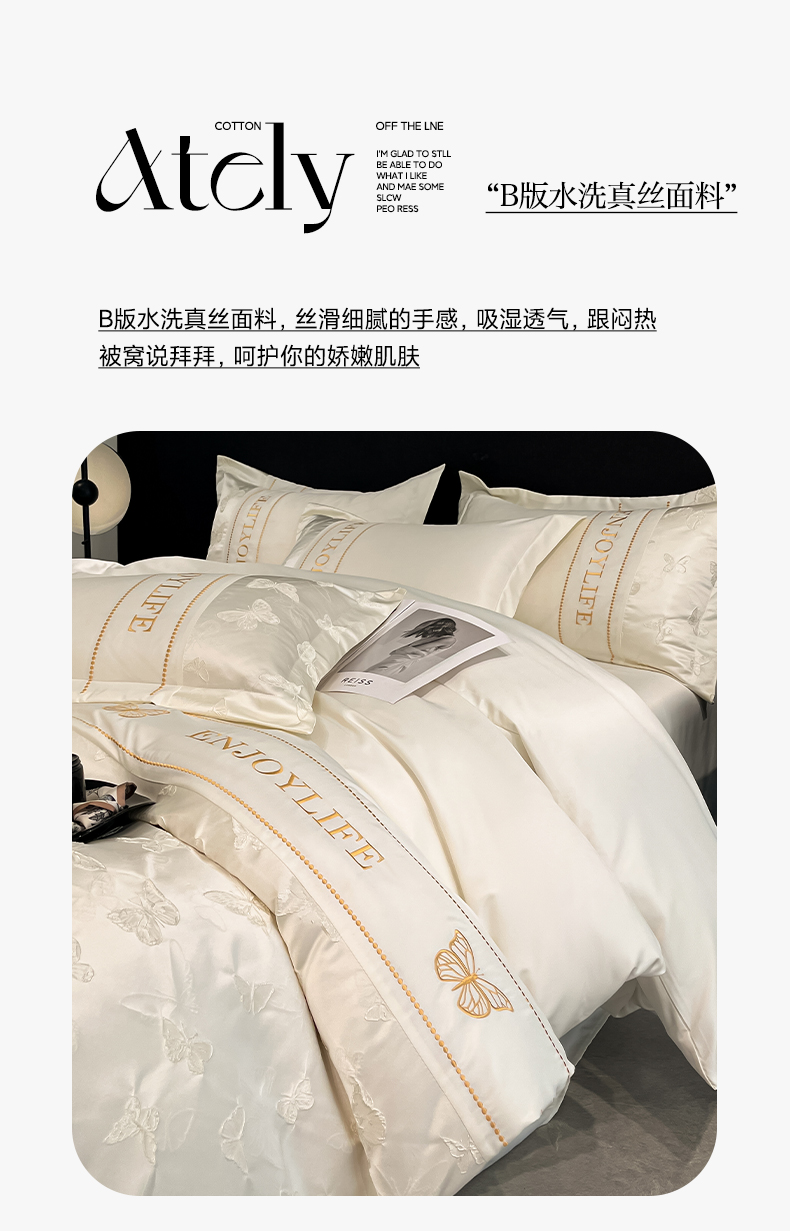 米彩家纺 2025新款A类水洗真丝金丝浮雕提花绣花四件套 富蝶-奶白