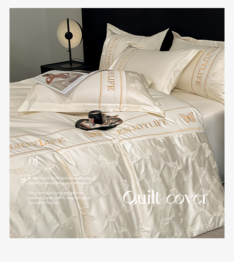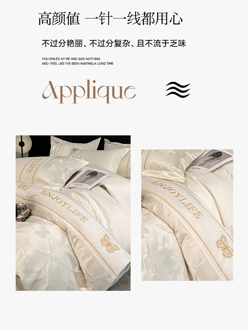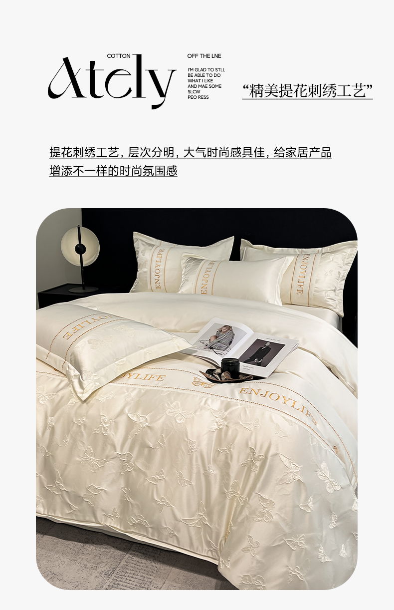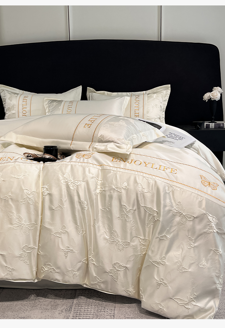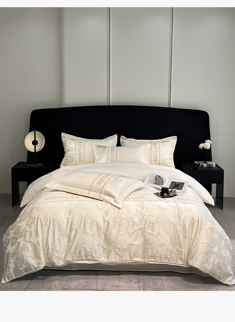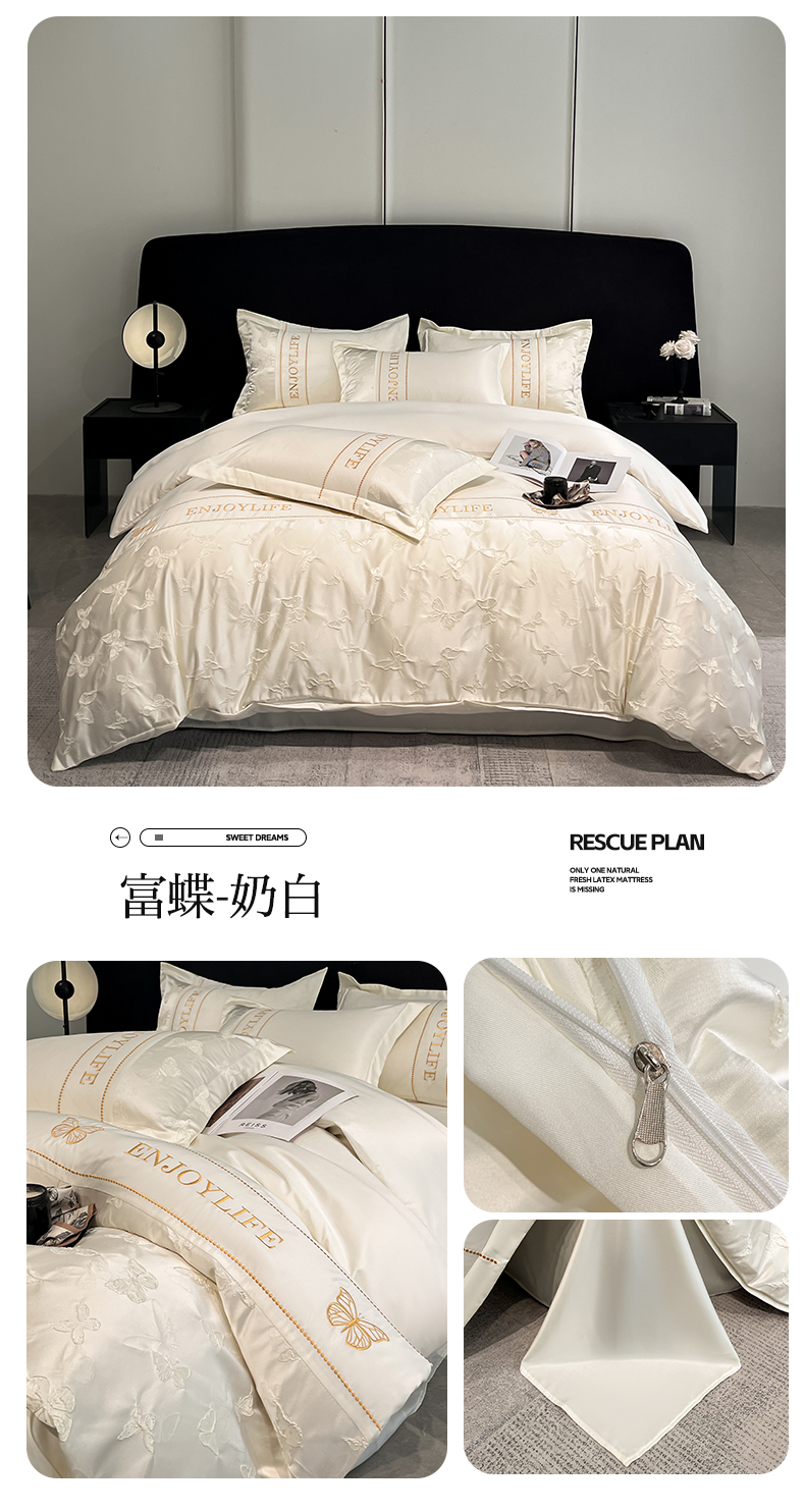 商品名称:米彩家纺 2025新款A类水洗真丝金丝浮雕提花绣花四件套 富蝶-奶白