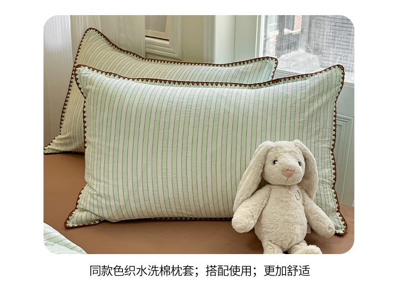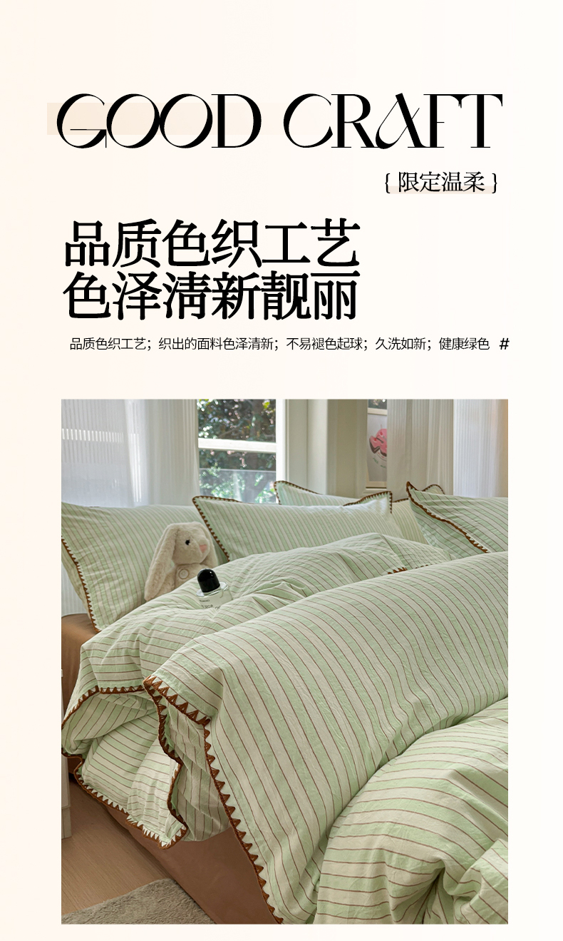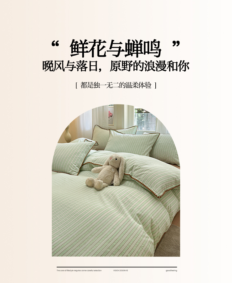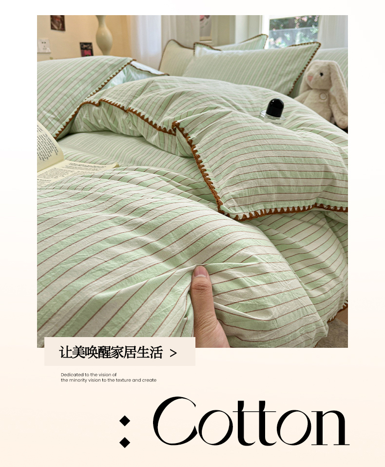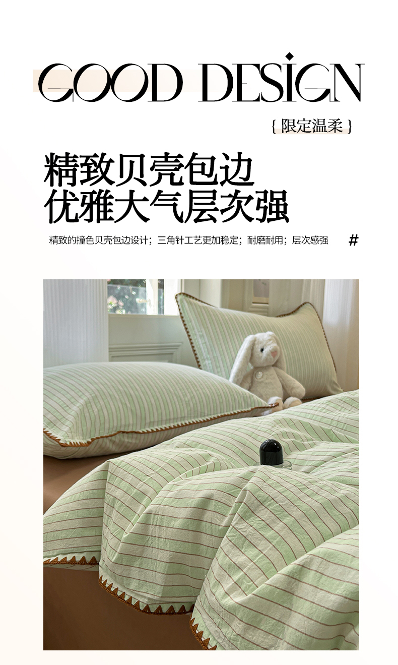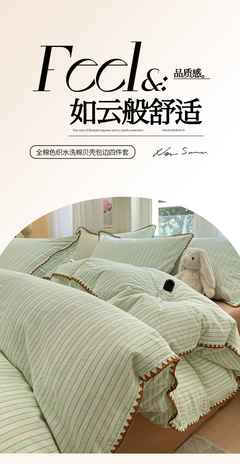 当前位置: 91家纺网 > 商品网购 > 床品套件 > 四件套 > 全棉活性四件套 > 莱茵家居 2025新款全棉色织水洗棉贝壳包边四件套生椰系列 茉莉青提