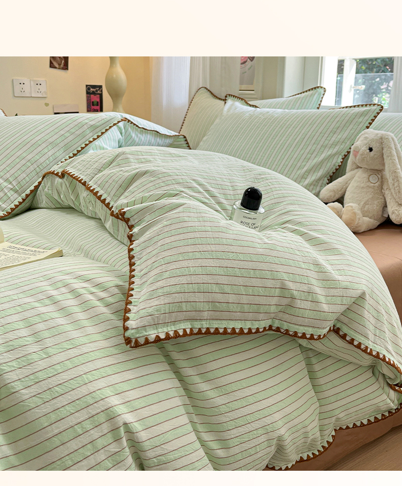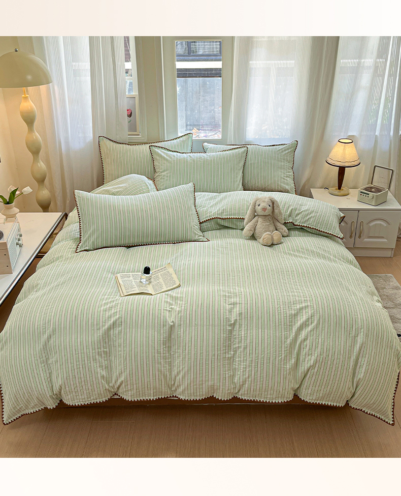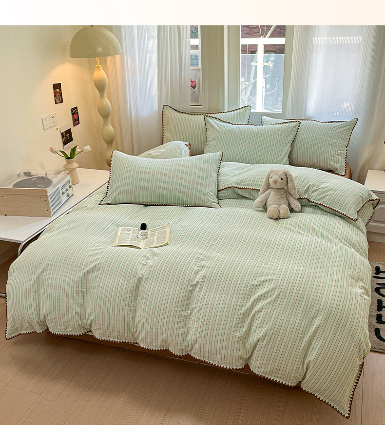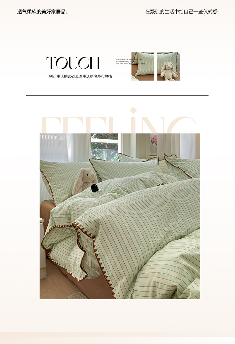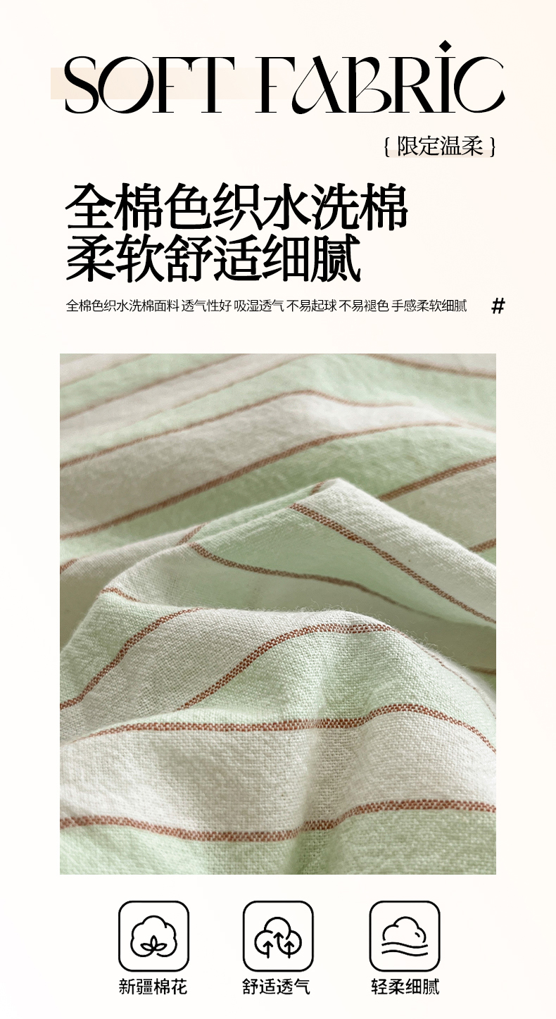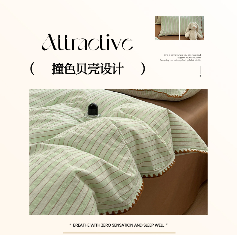 当前位置: 91家纺网 > 商品网购 > 床品套件 > 四件套 > 全棉活性四件套 > 莱茵家居 2025新款全棉色织水洗棉贝壳包边四件套生椰系列 茉莉青提