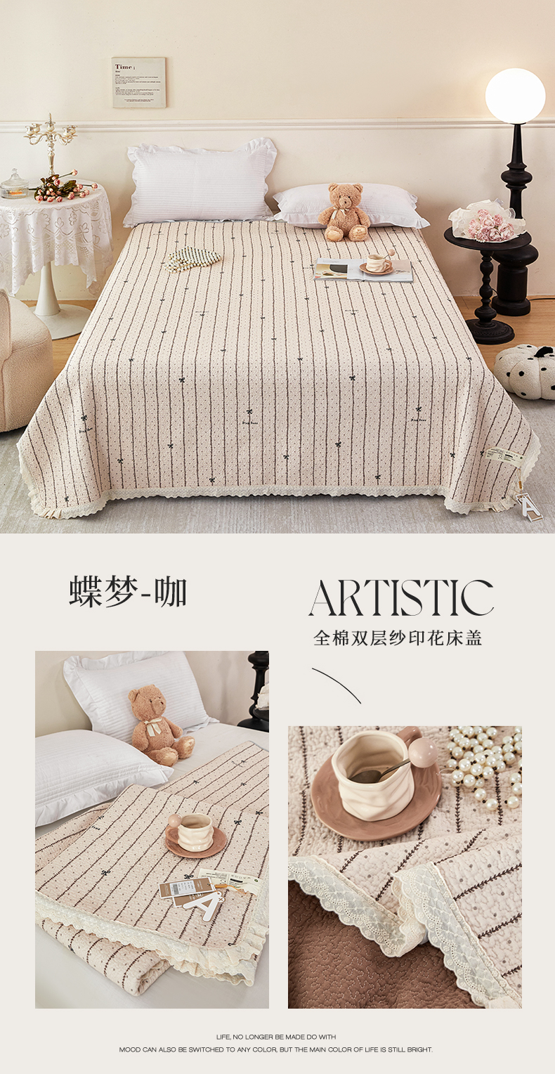 商品名称:瑞米家居 2025新款全棉双层纱印花床盖 蝶梦-咖