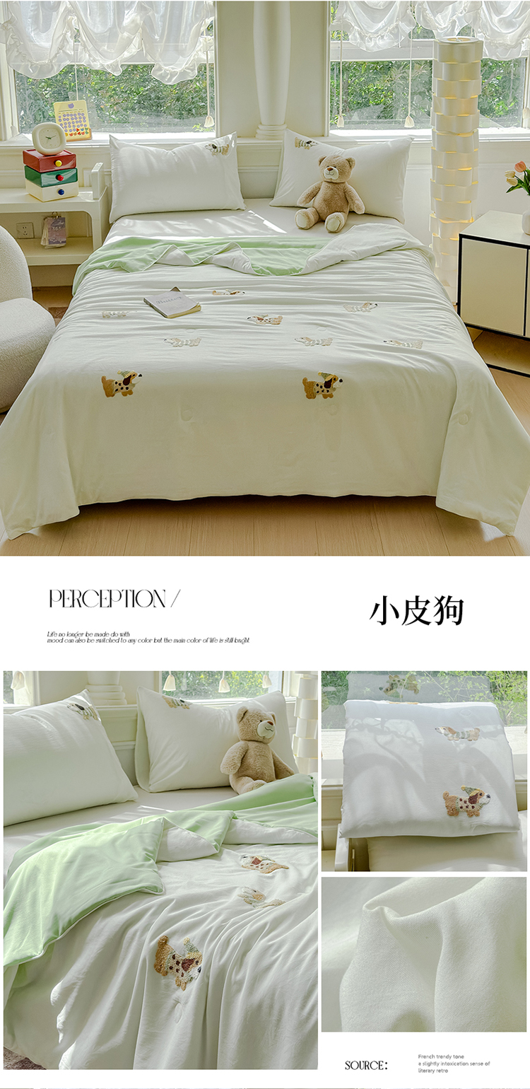 商品名称:2025新款水洗棉毛巾绣夏被卡通夏凉被薄被子 白绿-斑点狗