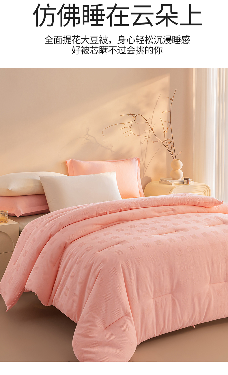 • 91家纺网 家纺一手货源 找家纺 (总)阳光被业 2025亚朵同款A类针织棉大豆被春秋被四季被A类针织棉芯秋冬保暖被子,柔云粉,深睡蓝,朦胧黄
