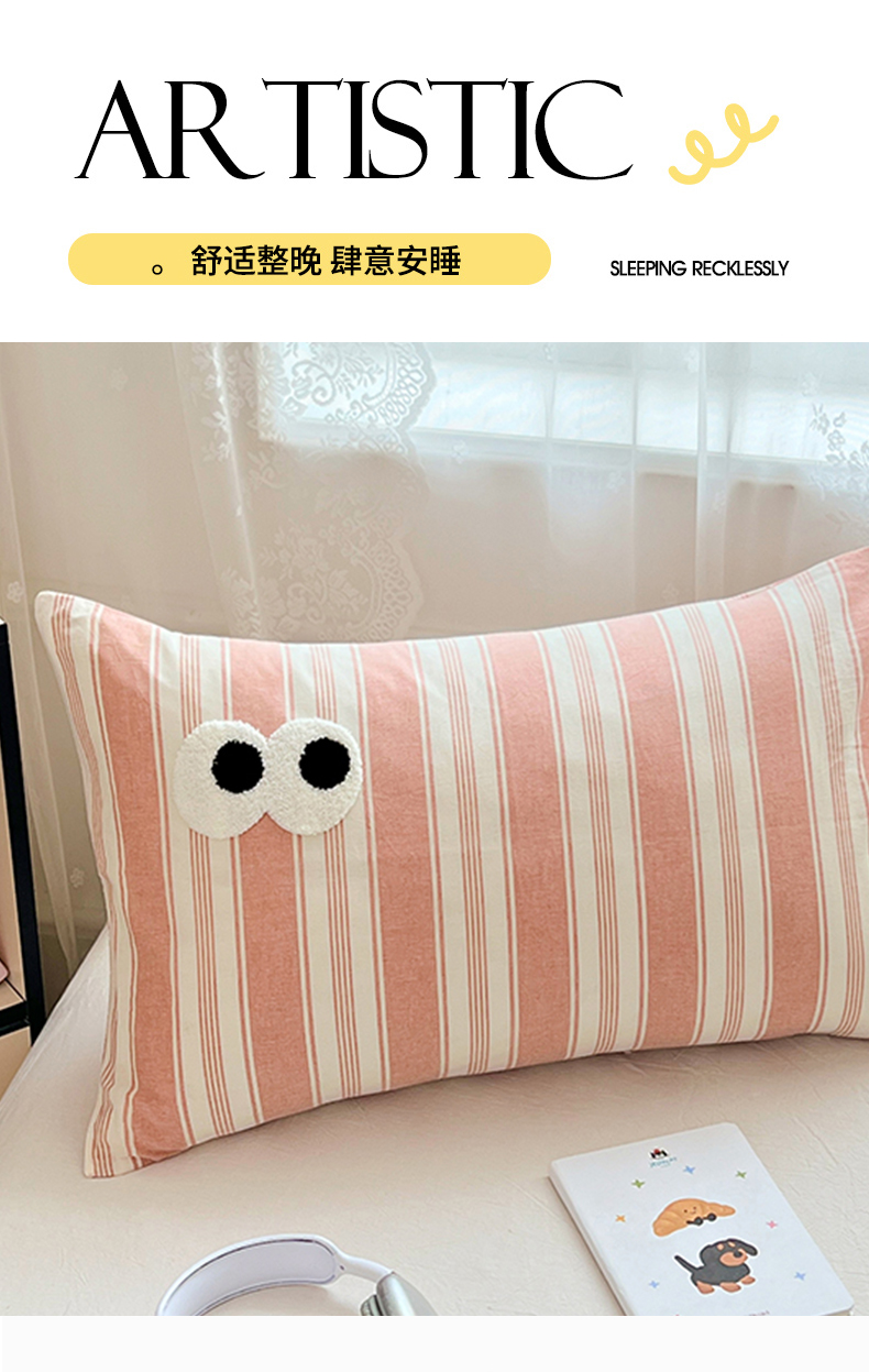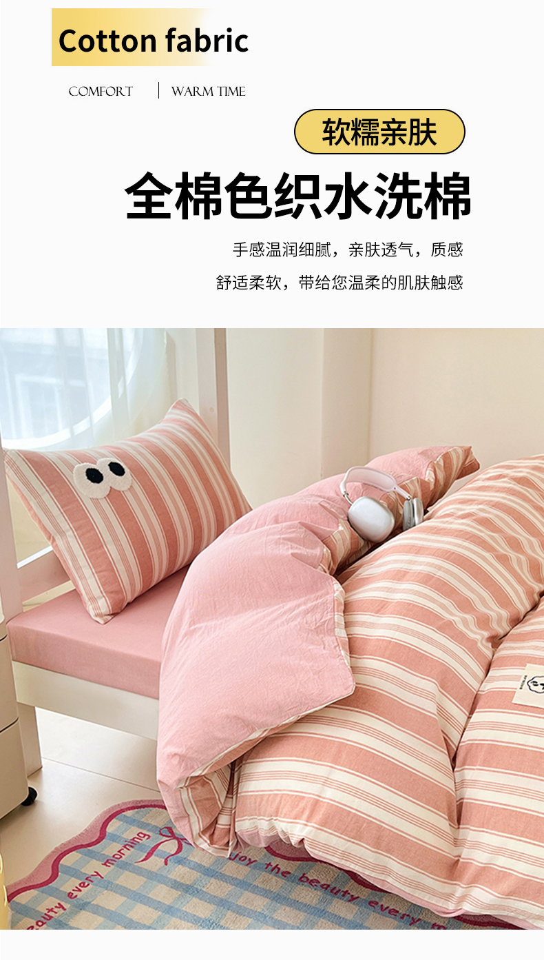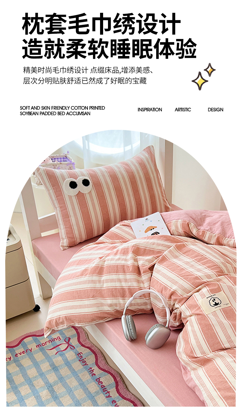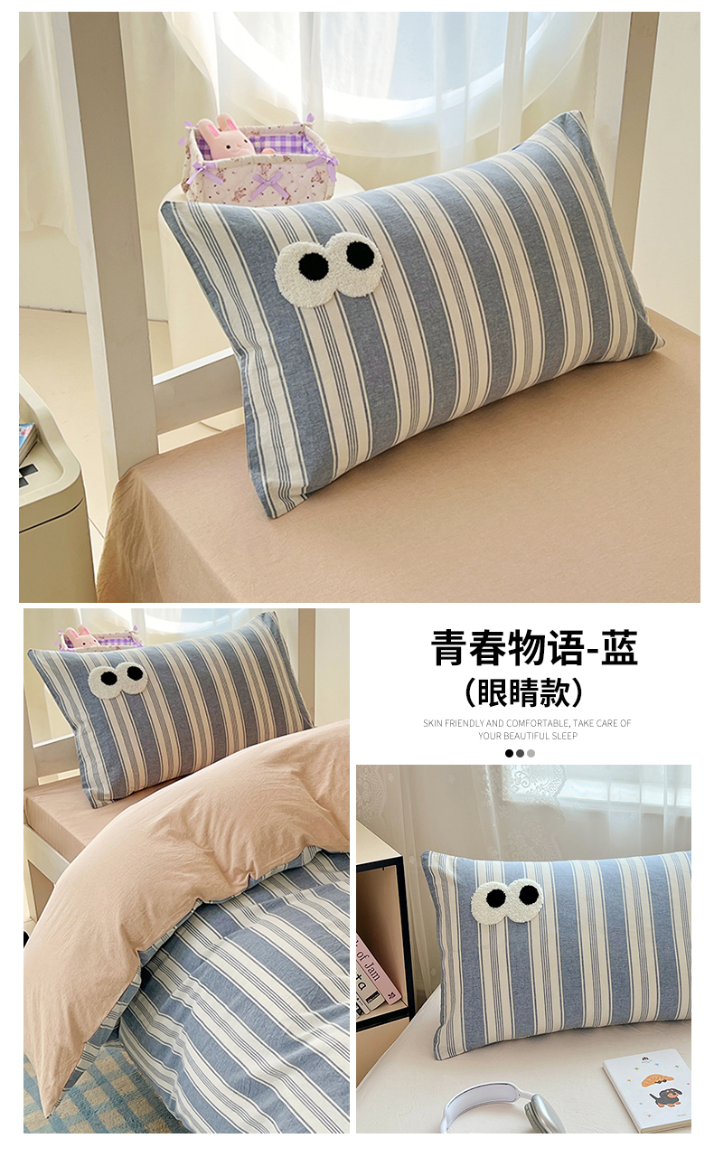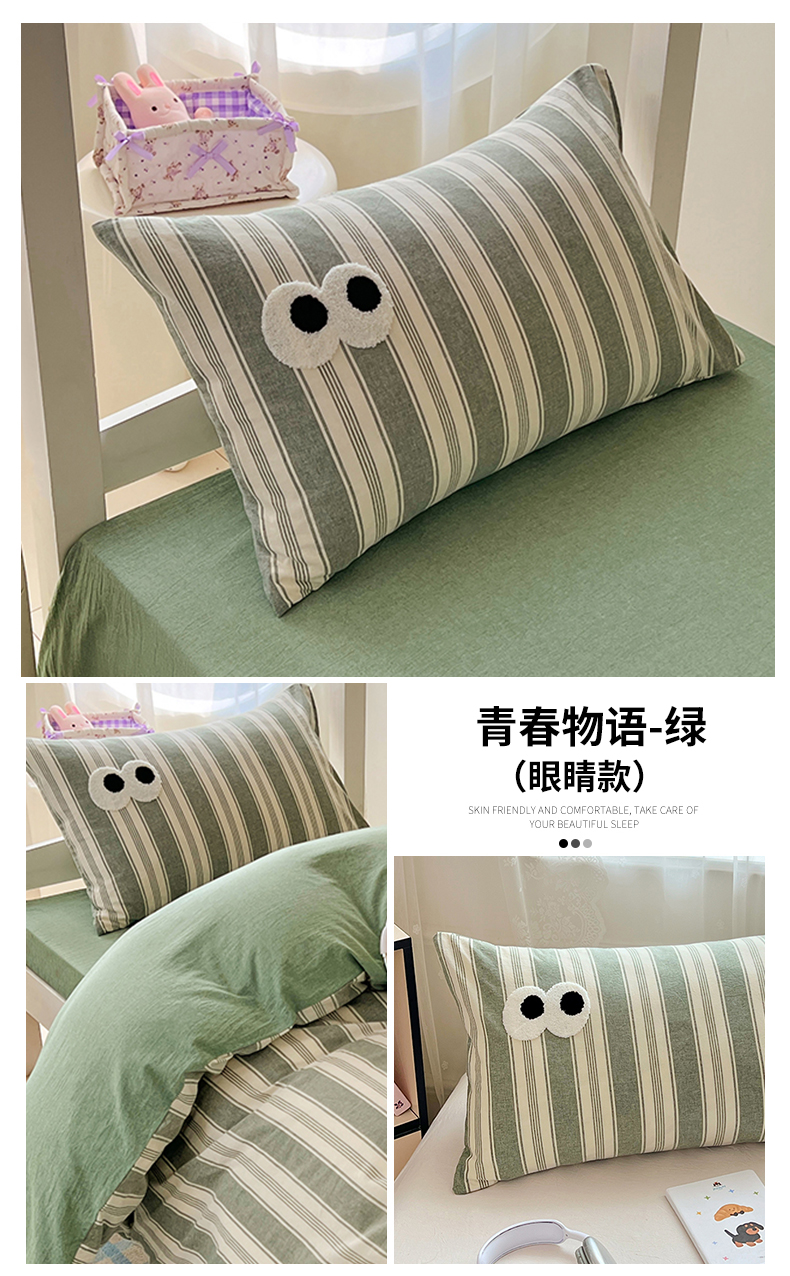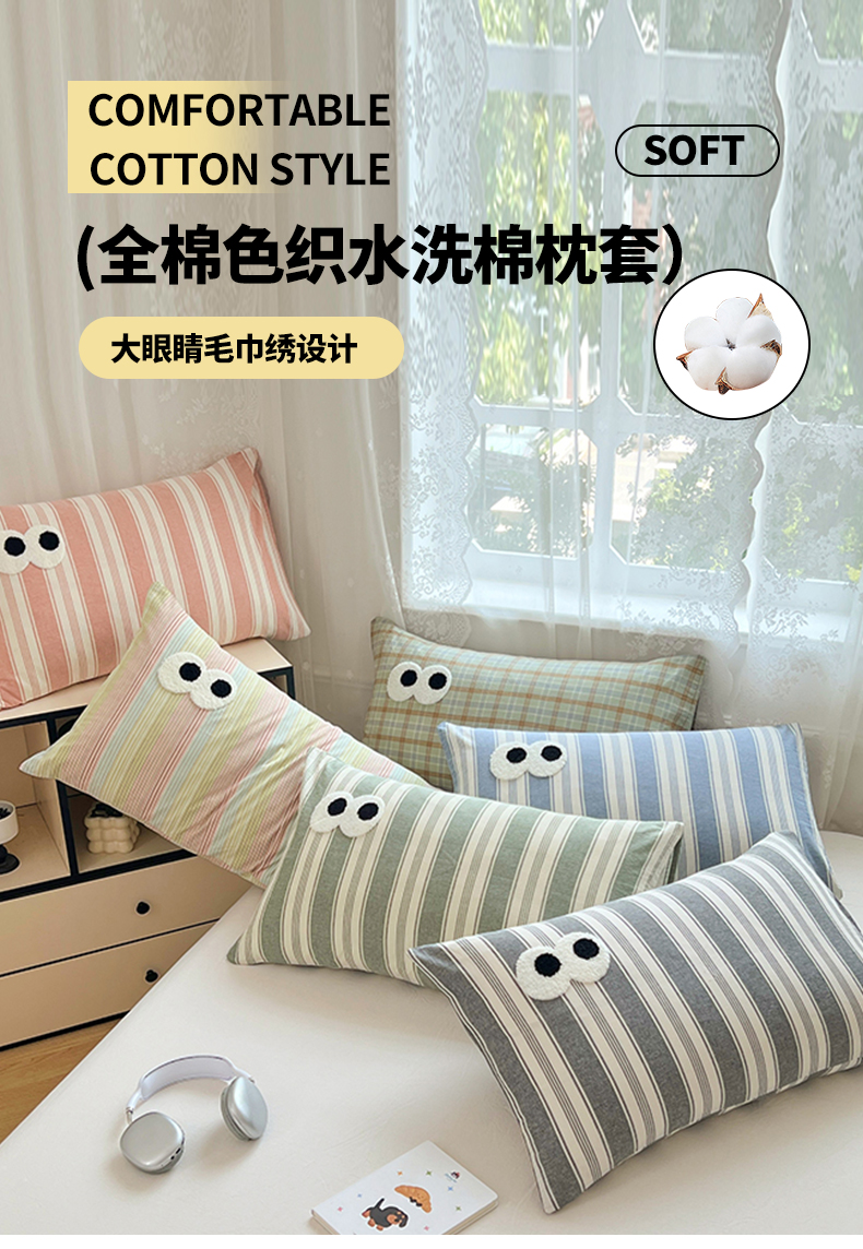 (总)(总)2025新款大眼睛毛巾绣色织全棉水洗棉日式复古学生三件套枕套单品系列四季款