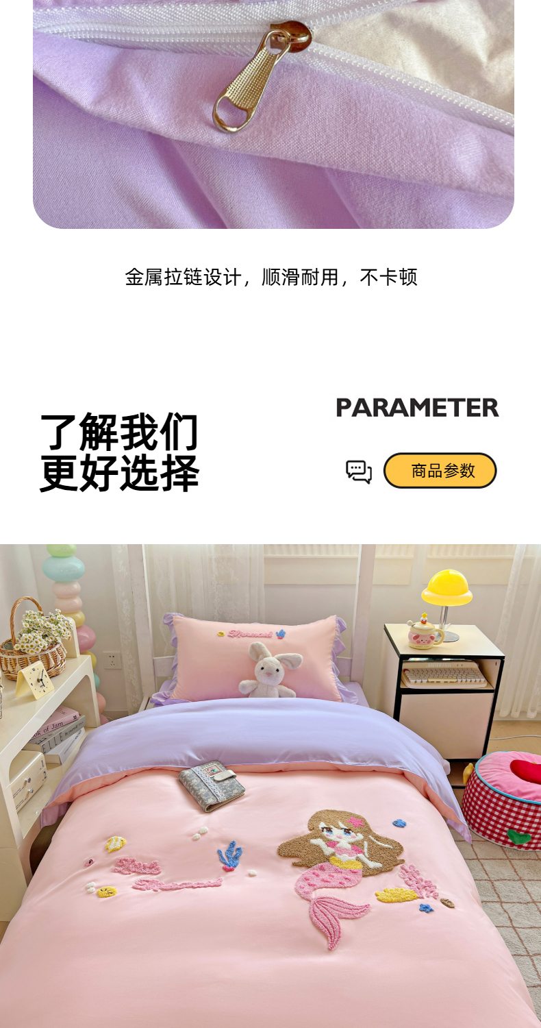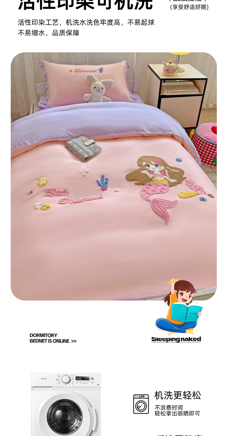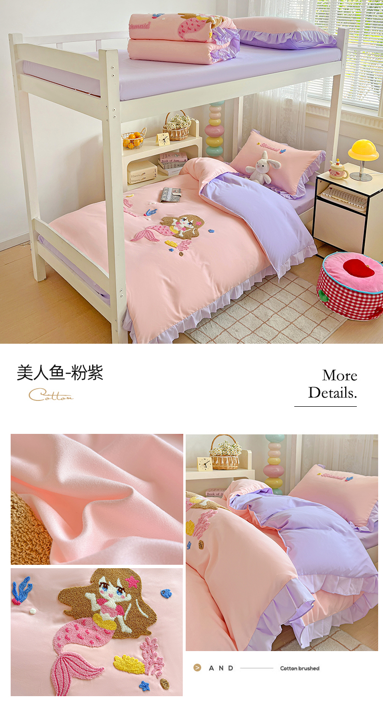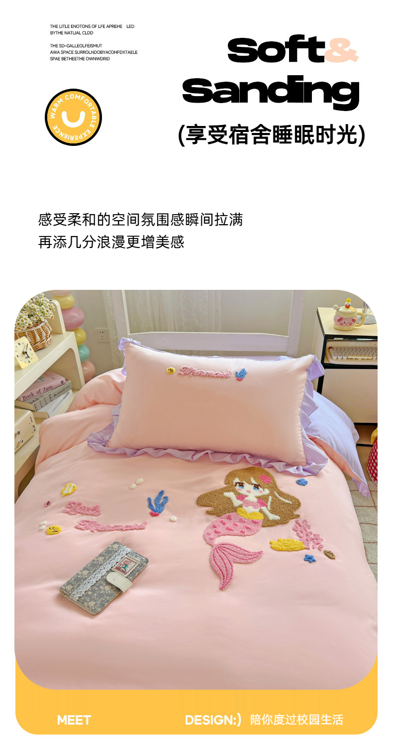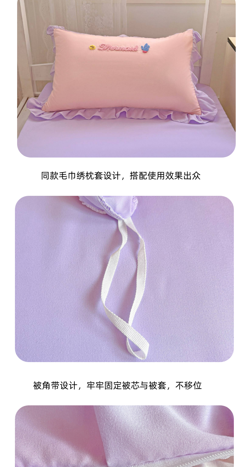 当前位置: 91家纺网 > 商品网购 > 床品套件 > 三件套 > 雨菲家纺 2025新款学生季水洗棉毛巾绣花荷叶花边三件套四件套床单床笠款 美人鱼粉紫