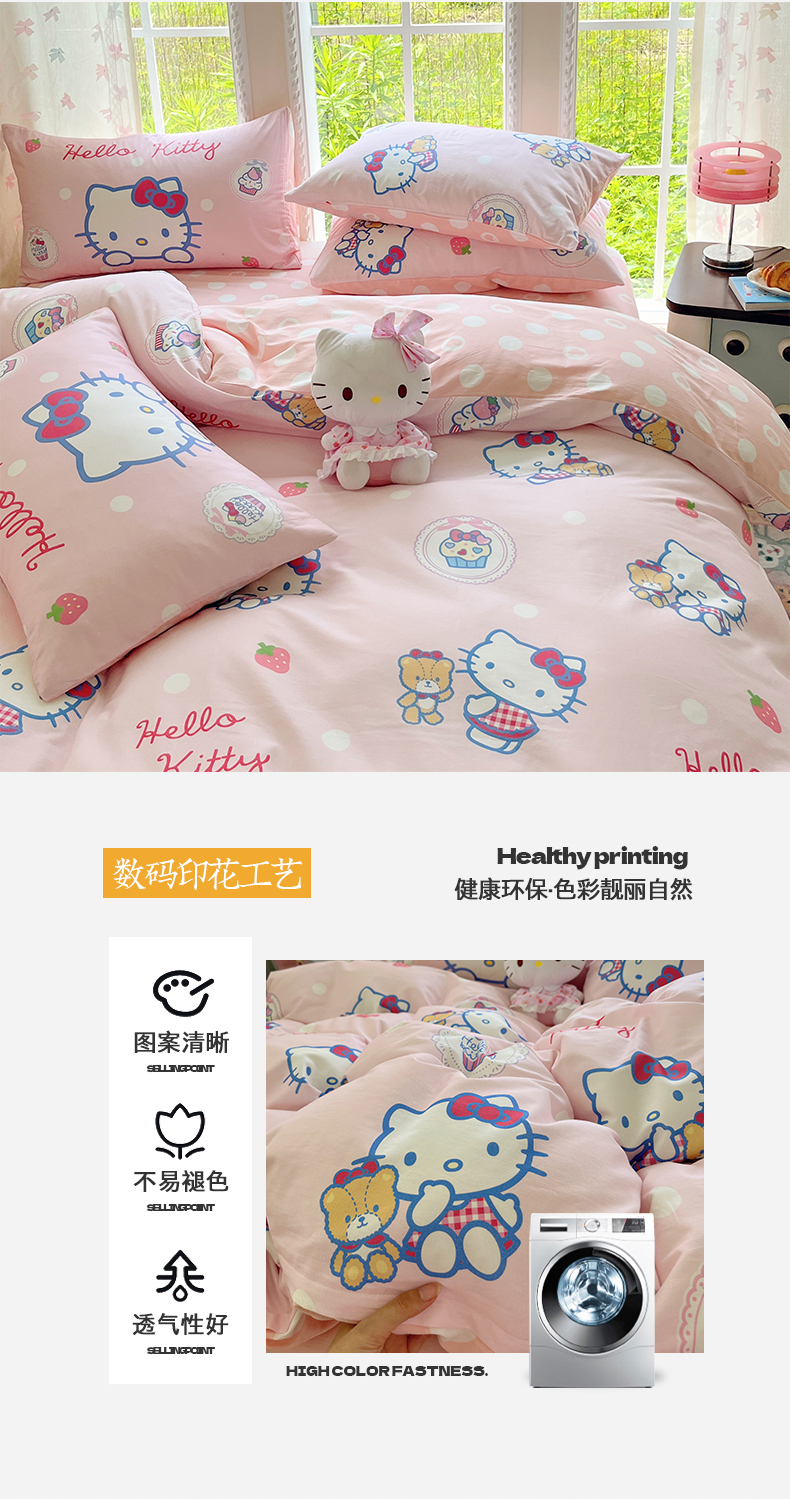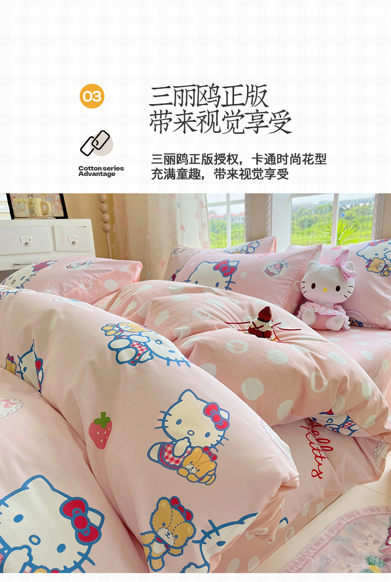 当前位置: 91家纺网 > 商品网购 > 床品套件 > 四件套 > 全棉普通四件套 > 桃子家居 2025新款三丽鸥正版授权卡通数码印花混搭纯棉印花系列四件套单品 棉三丽鸥-混搭kitty小熊粉