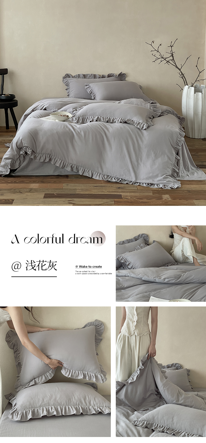 商品名称:三味舒屋2025新款花边美学-全棉双层纱四件套 浅花灰