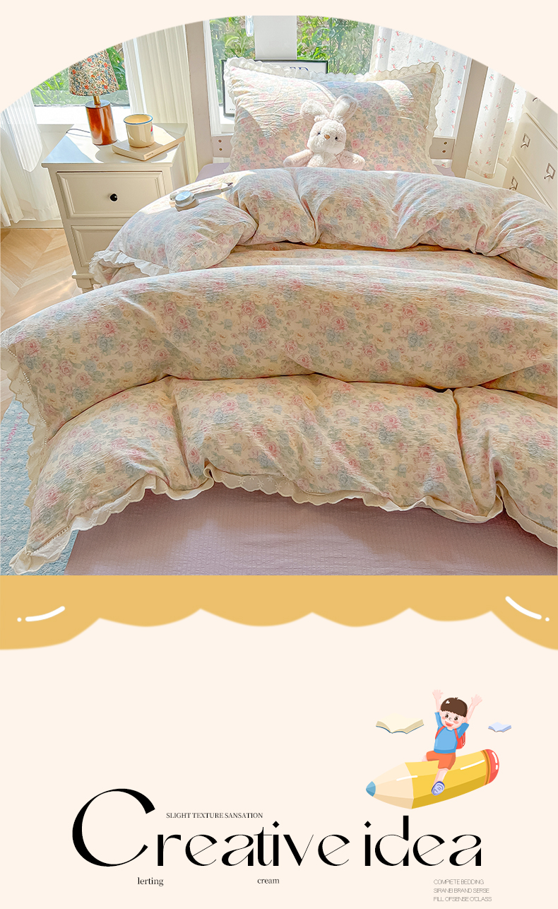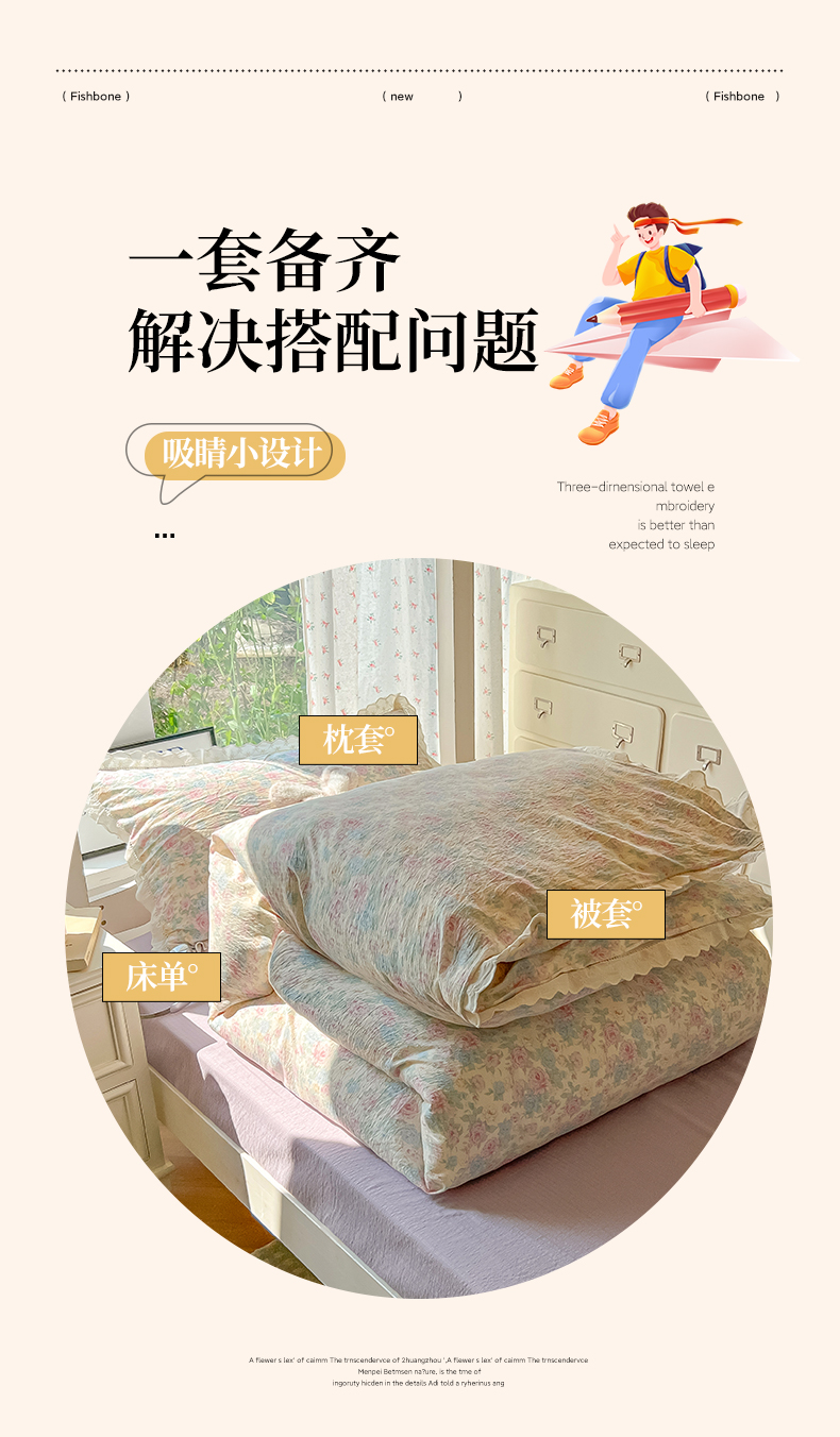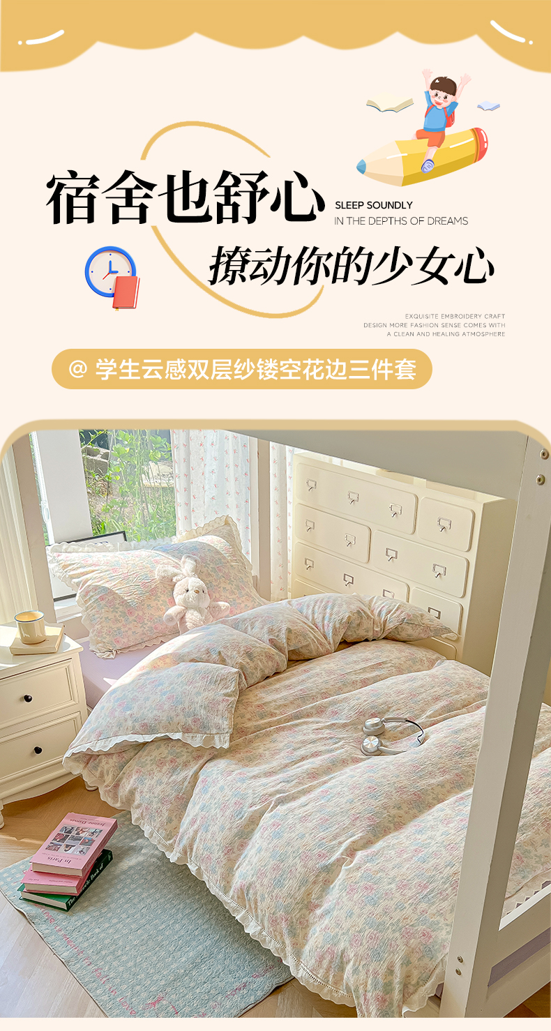当前位置: 91家纺网 > 商品网购 > 床品套件 > 三件套 > 韩巢家纺 2025新款学生宿舍三件套上下铺学生季开学季床品 镂空花边款-童话花岛