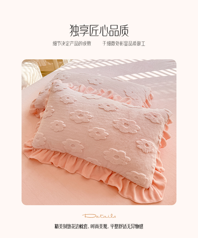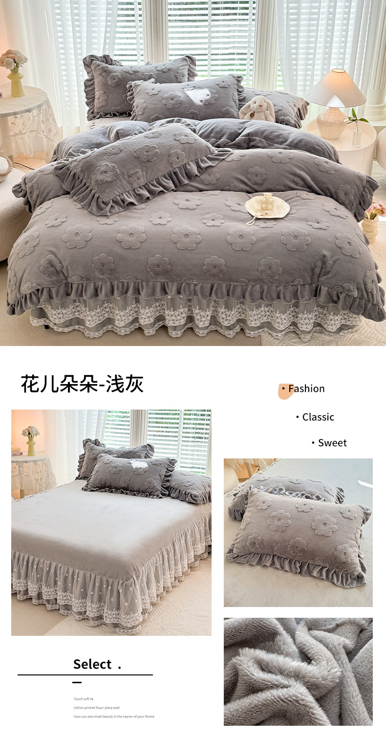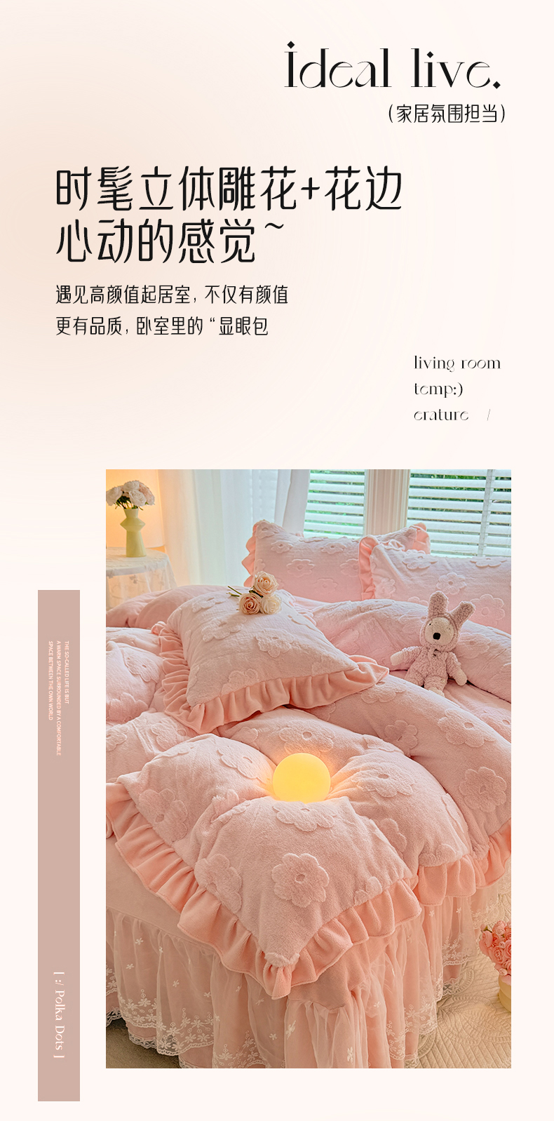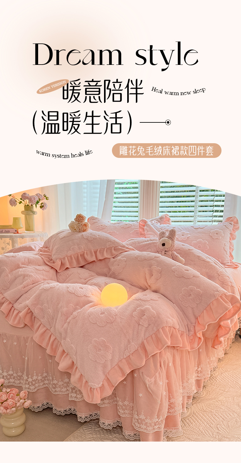 商品名称:唐人居 2025新款雕花花边兔毛绒床裙四件套 花儿朵朵-浅粉