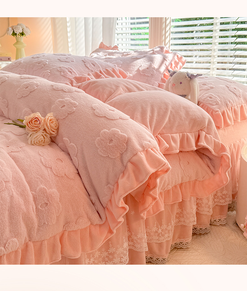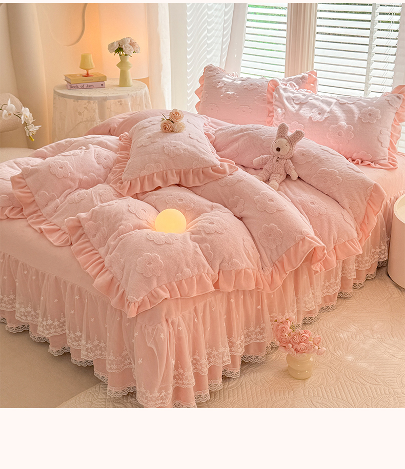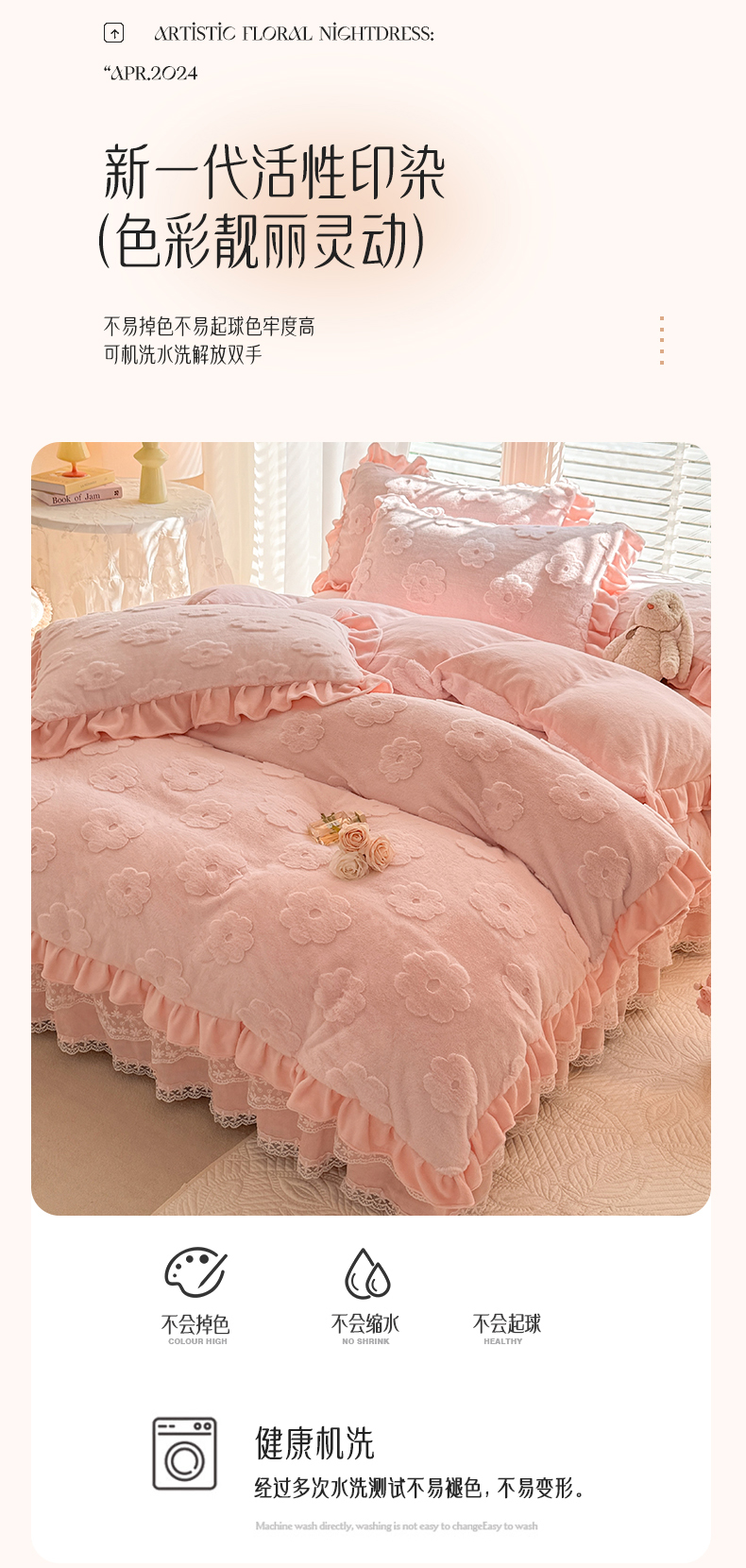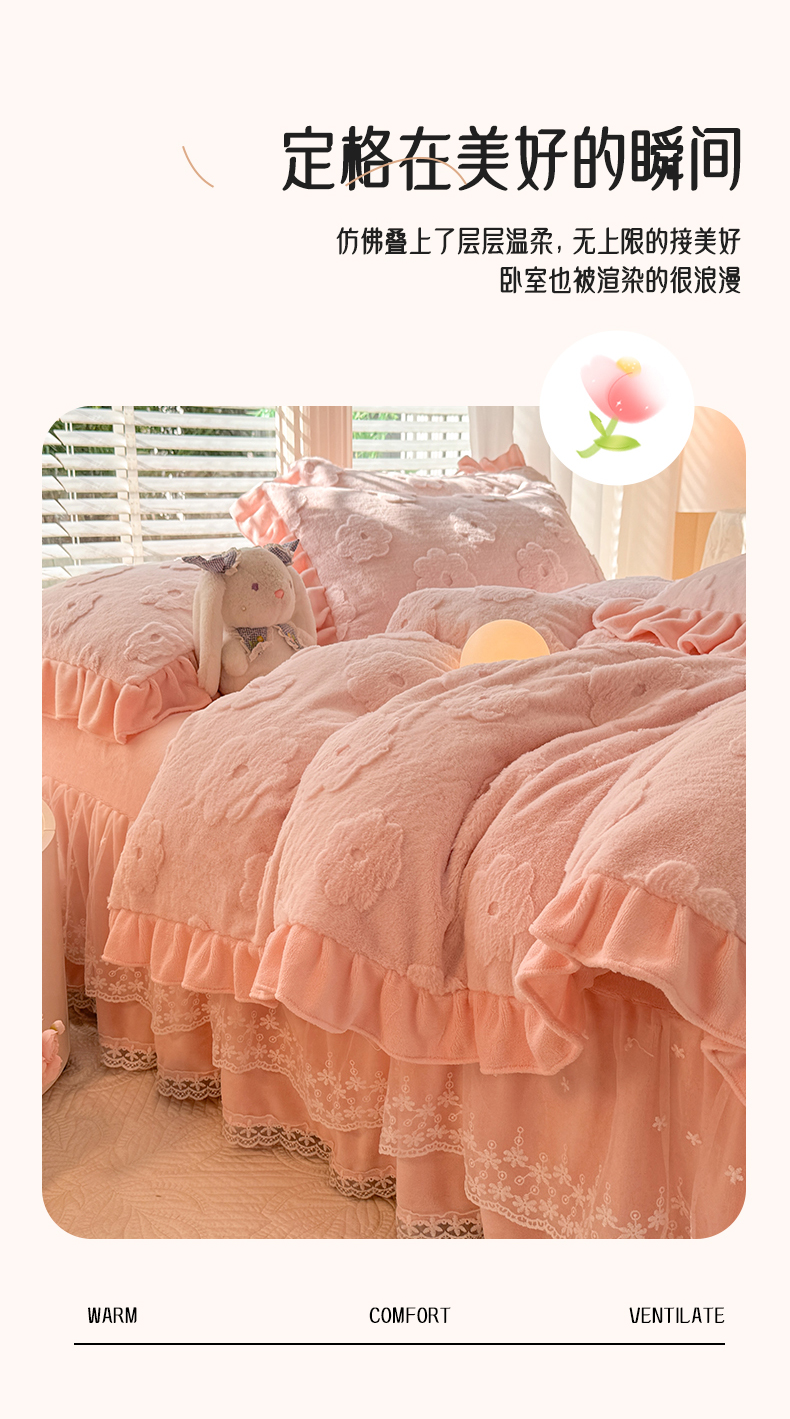 唐人居 2025新款雕花花边兔毛绒床裙四件套 花儿朵朵-浅粉