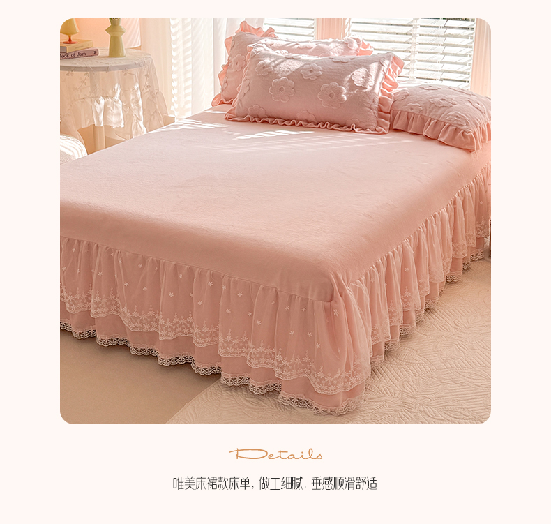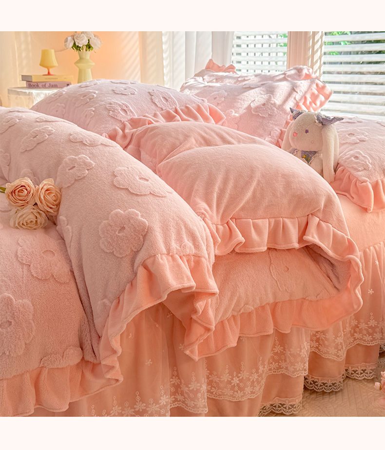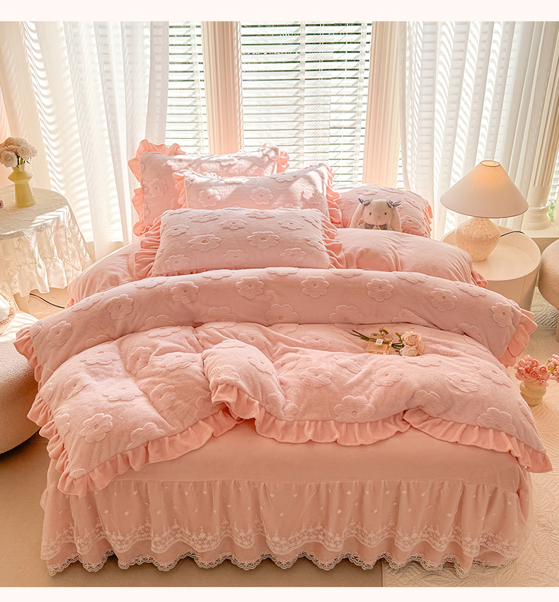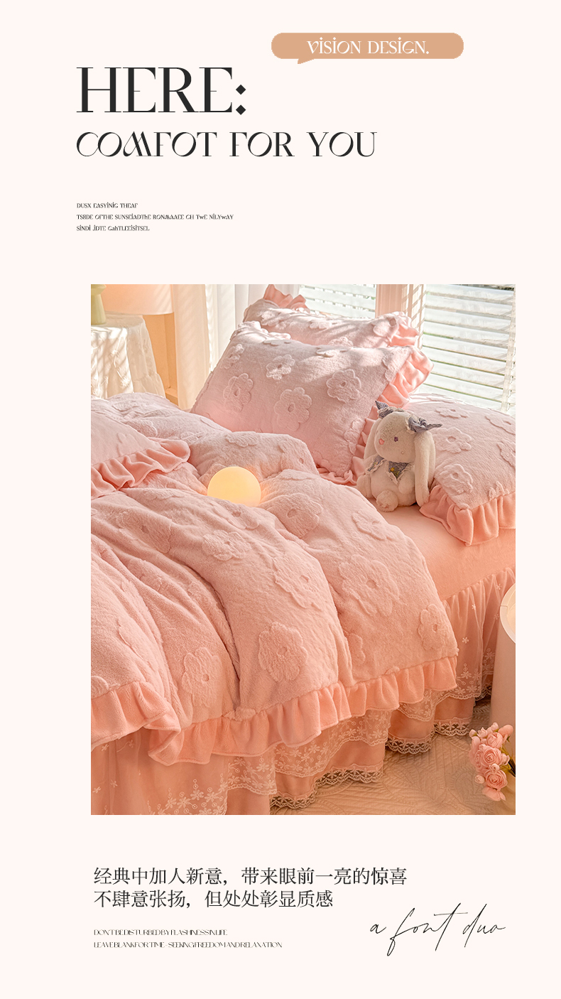 唐人居 2025新款雕花花边兔毛绒床裙四件套 花儿朵朵-浅粉