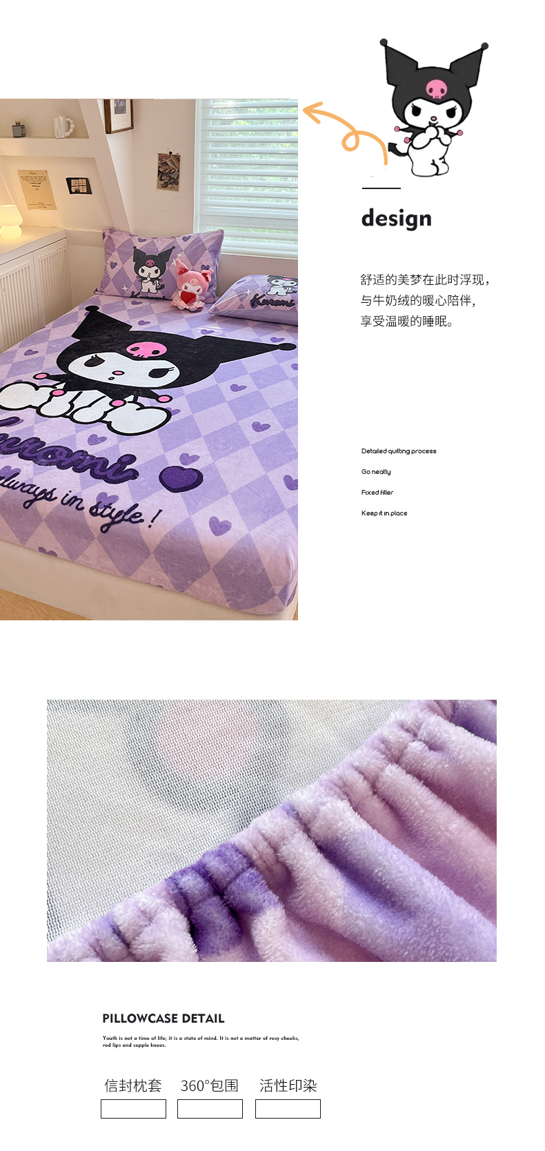 • 91家纺网 家纺一手货源 找家纺 金爱家 2025新款高克重牛奶绒单品系列保暖床单床笠单件 绒-D桃心美美库洛米