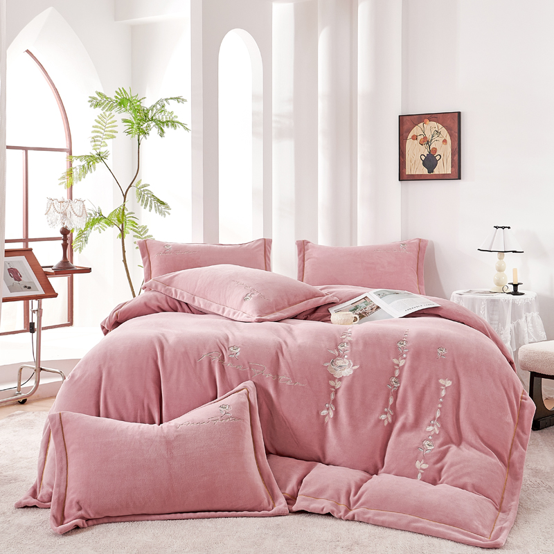 慕克斯 2025直播新款高克重8.5斤纯色刺绣牛奶绒四件套 朝花夕拾-寐粉,朝花夕拾-寐粉