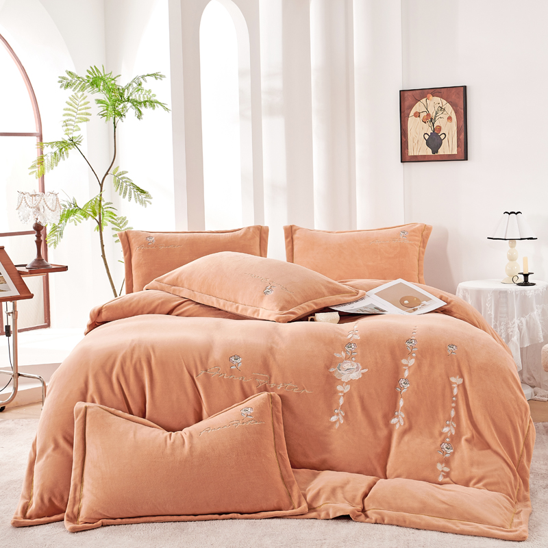 慕克斯 2025直播新款高克重8.5斤纯色刺绣牛奶绒四件套 朝花夕拾-浅橘,朝花夕拾-浅橘