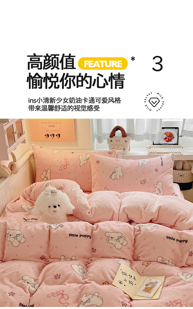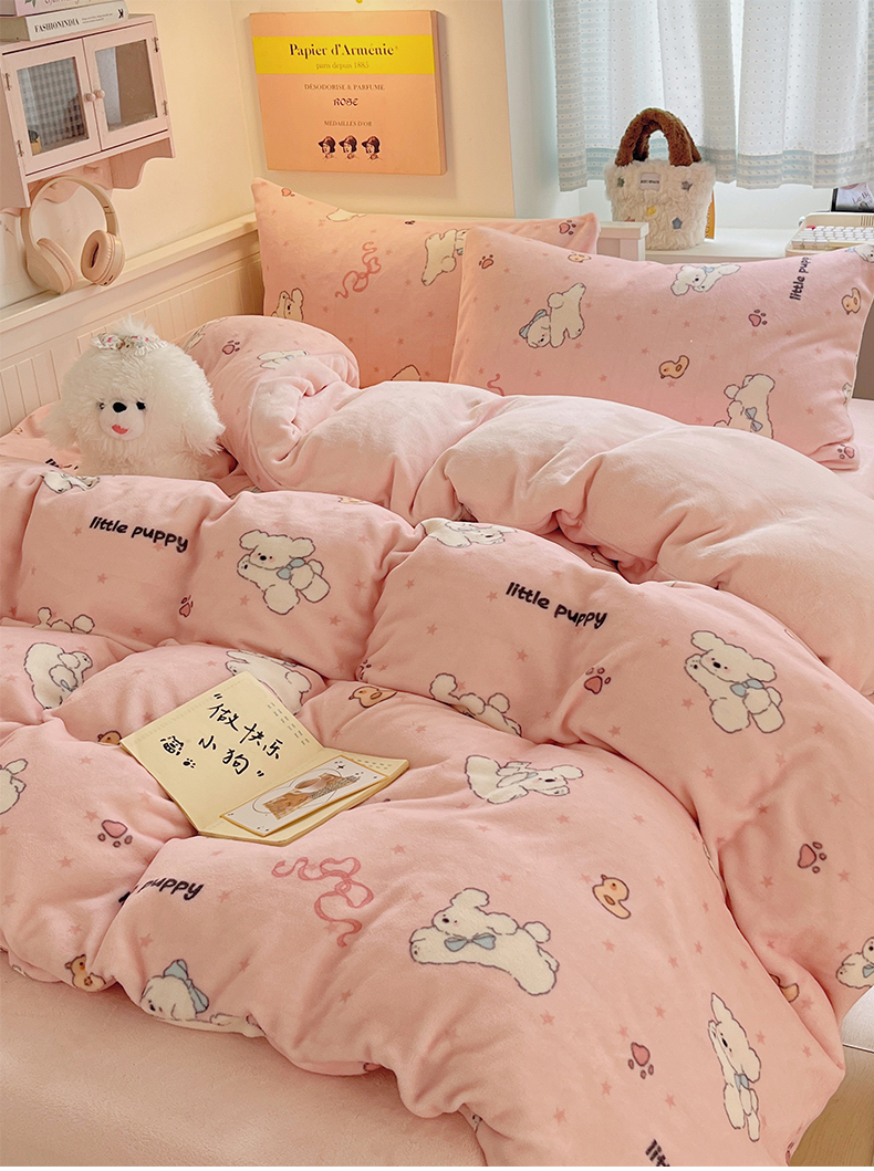 桃子家居 2025新款A类ins小清新少女奶油卡通可爱加厚牛奶绒四件套 绒-粉小狗