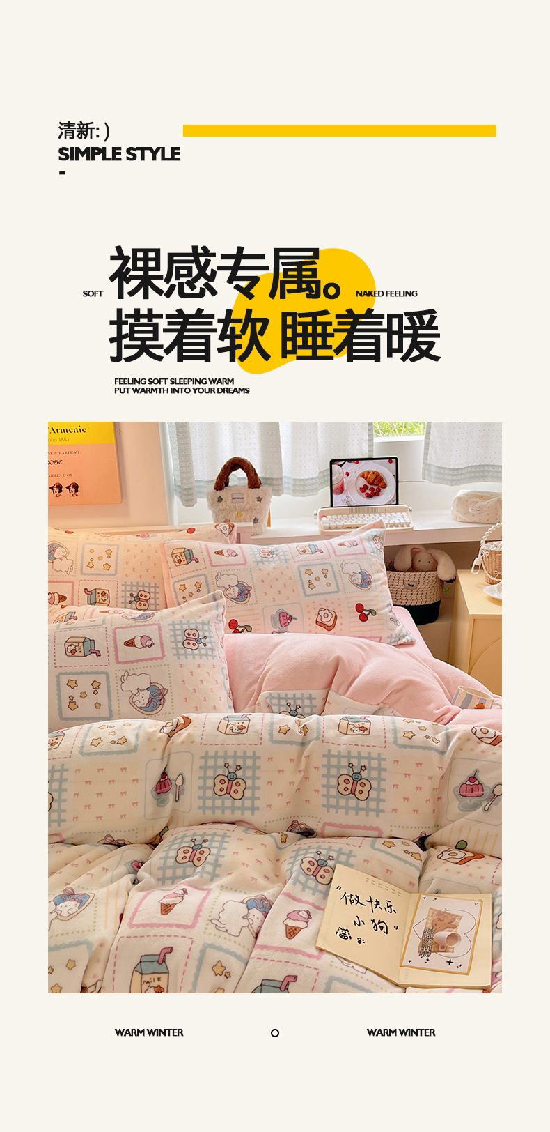 桃子家居 2025新款A类ins小清新少女奶油卡通可爱加厚牛奶绒四件套 绒-糖果屋