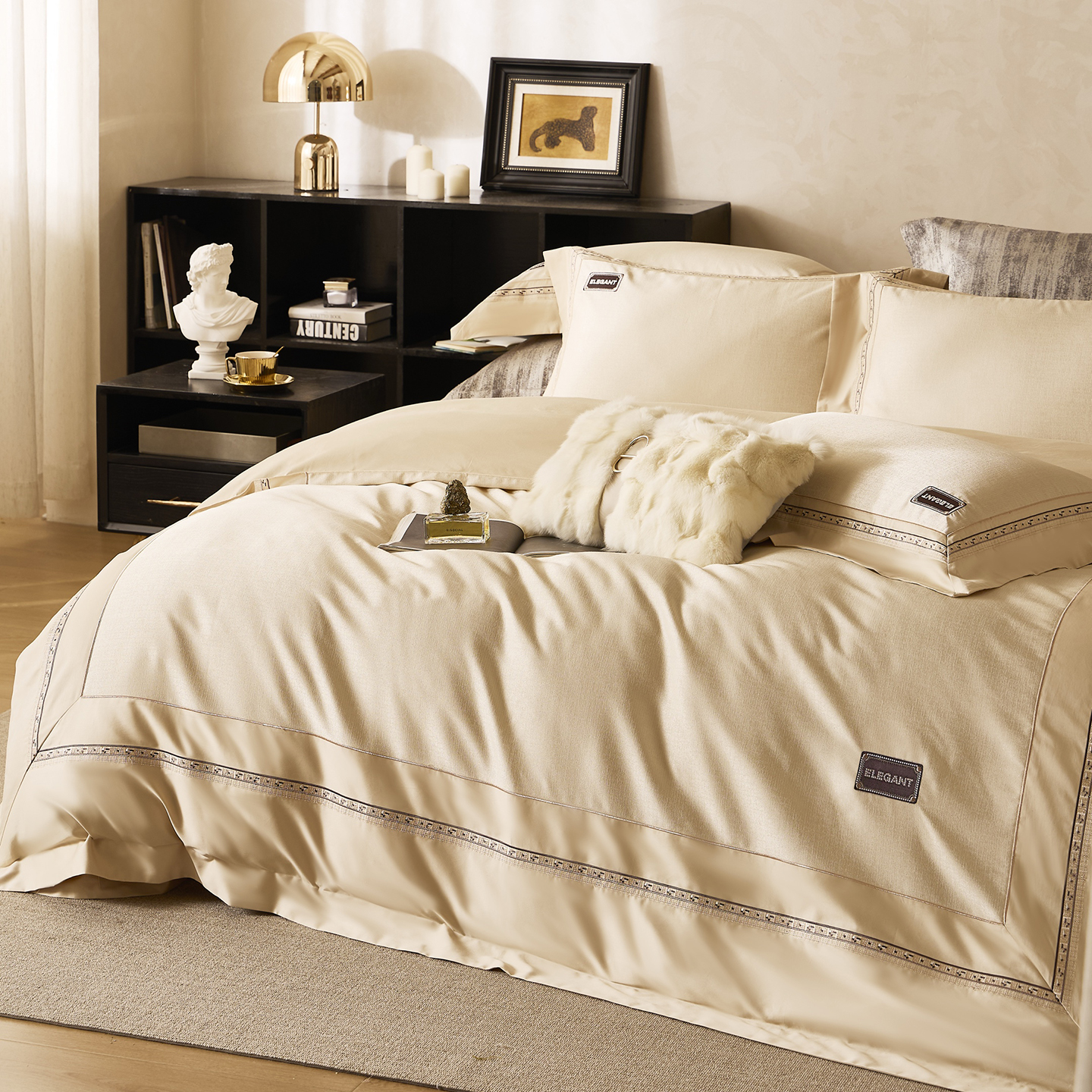 商品名称:玖玖爱家纺 2025新款千纱臻品金银丝真丝缎四件套-香奈 香奈-香槟