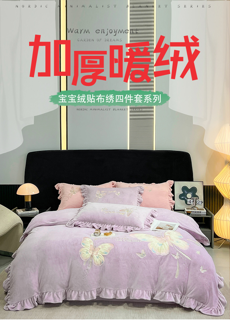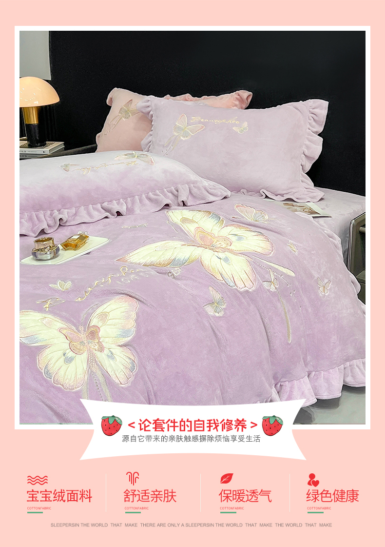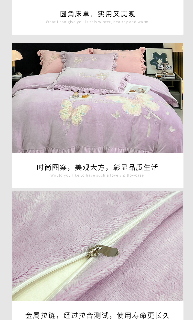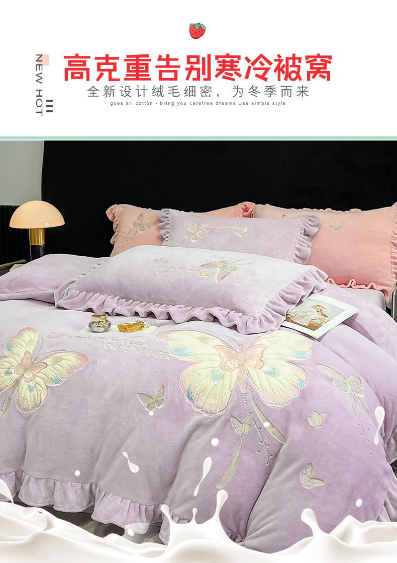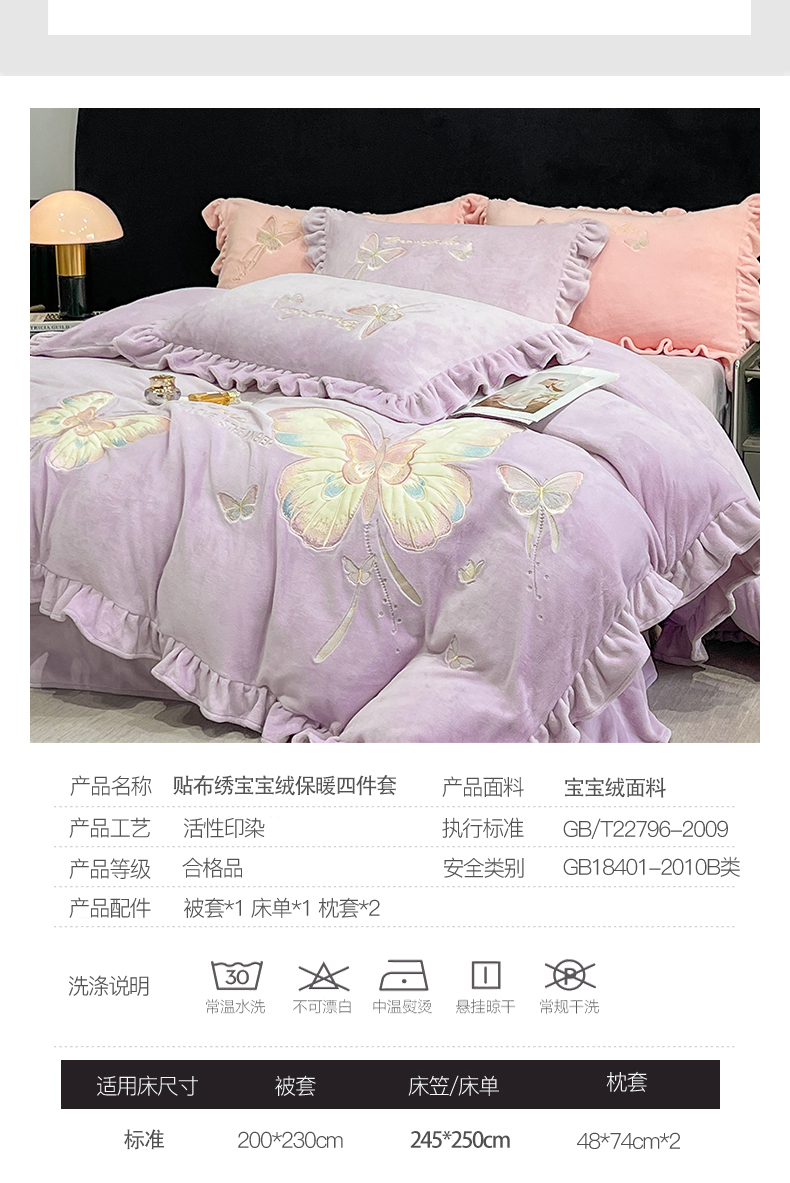 商品名称:悦织湾家纺 2025新款230克9.5斤重牛奶绒宝宝绒贴布绣四件套蝴蝶款高密保暖轻奢时尚床上用品四件套 蝴蝶-丁香紫