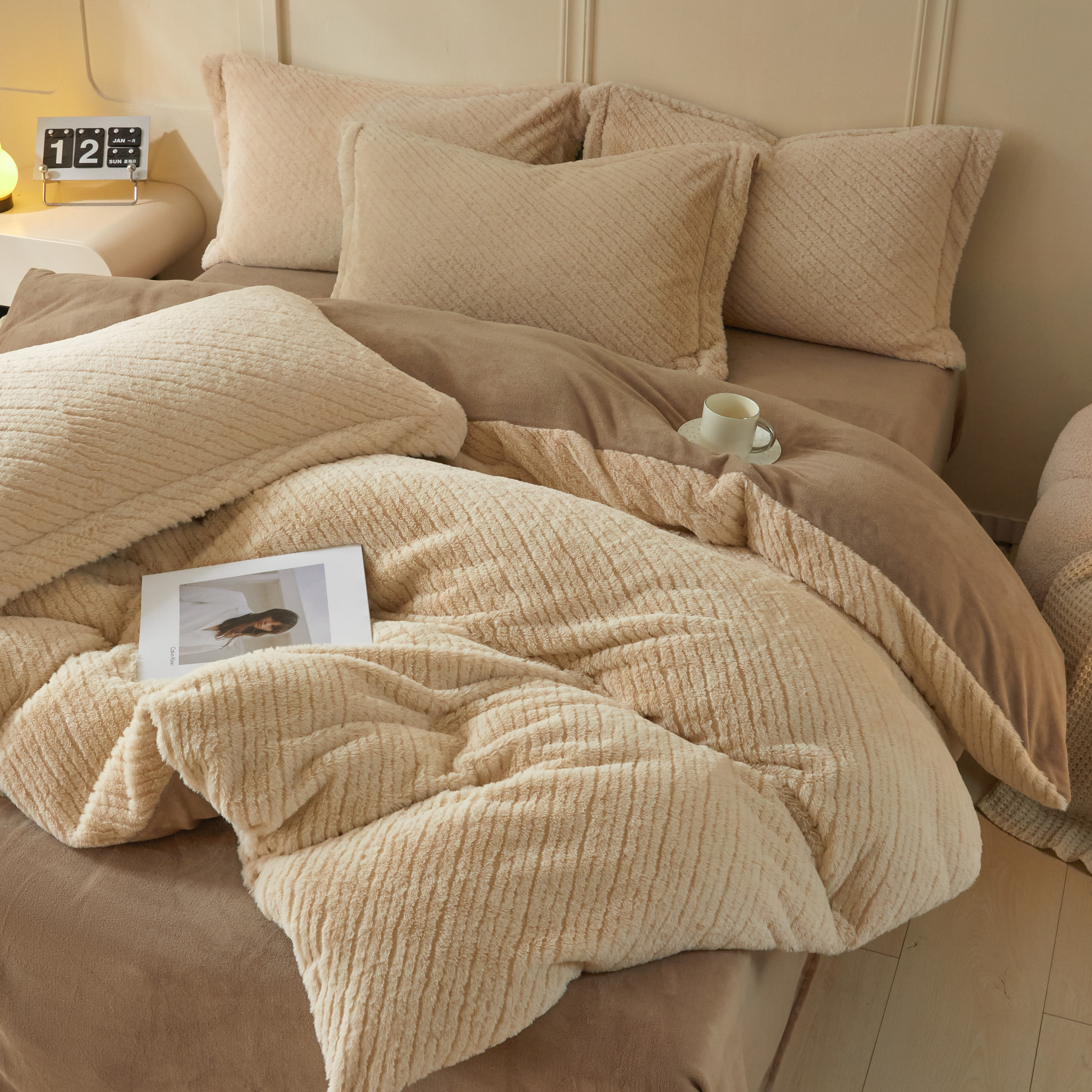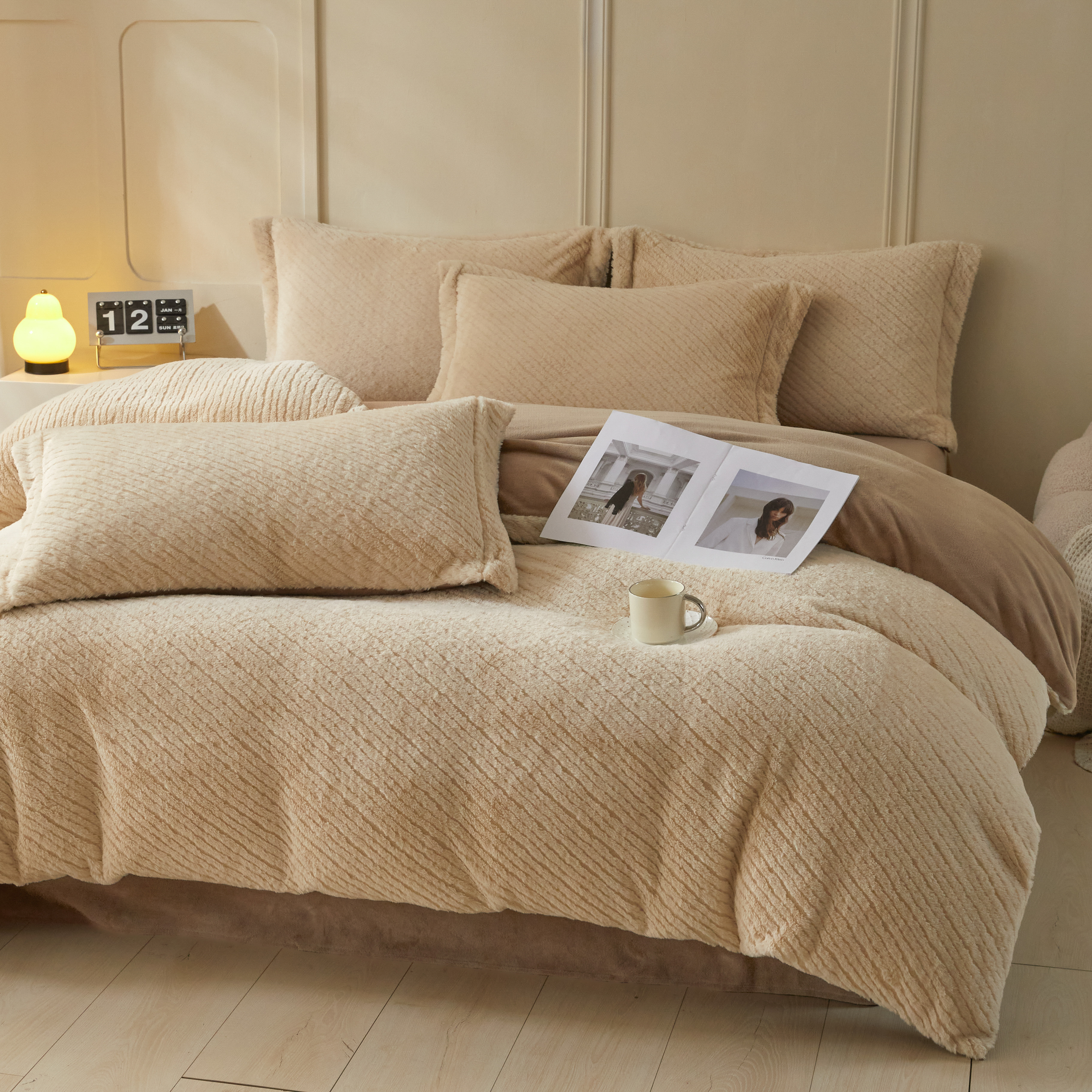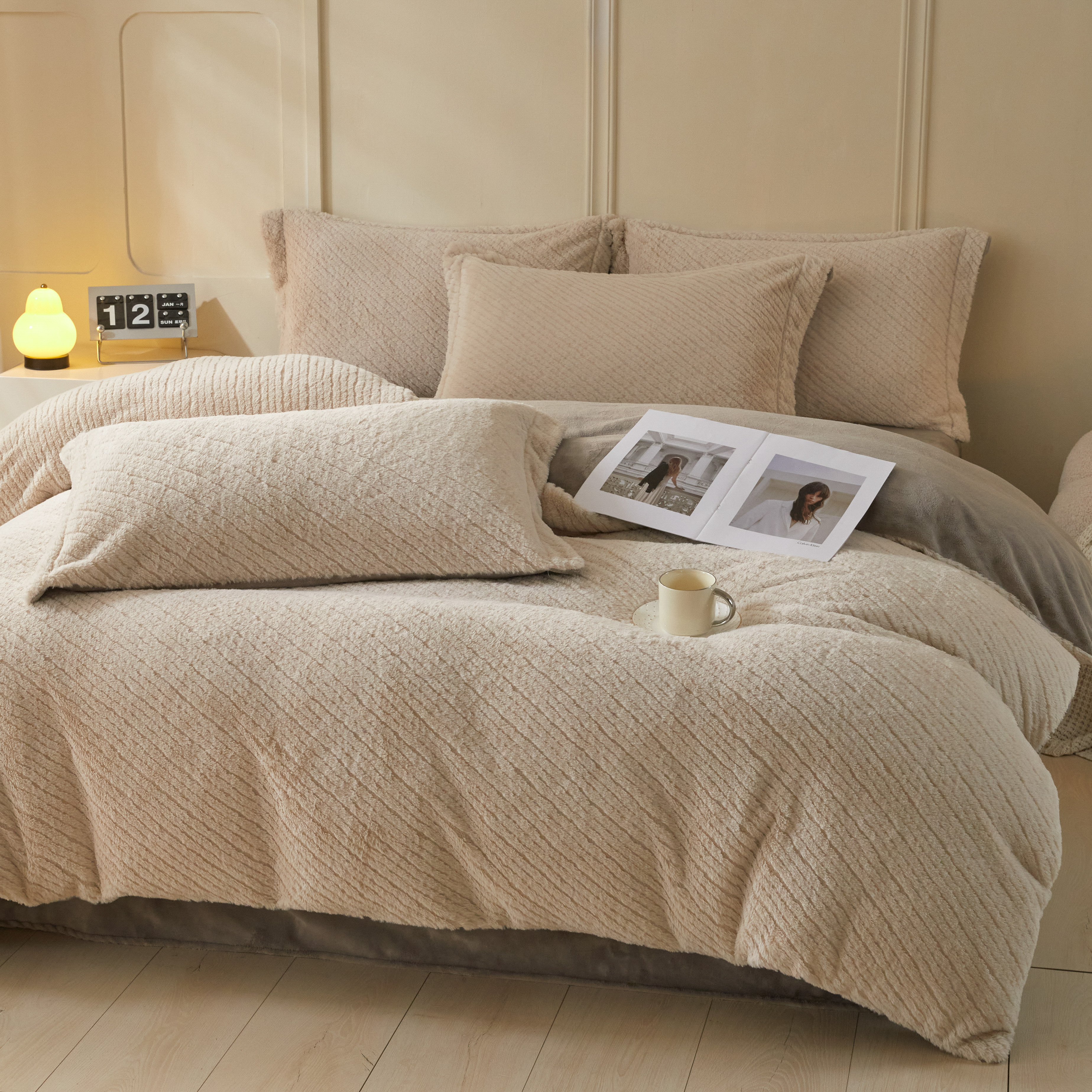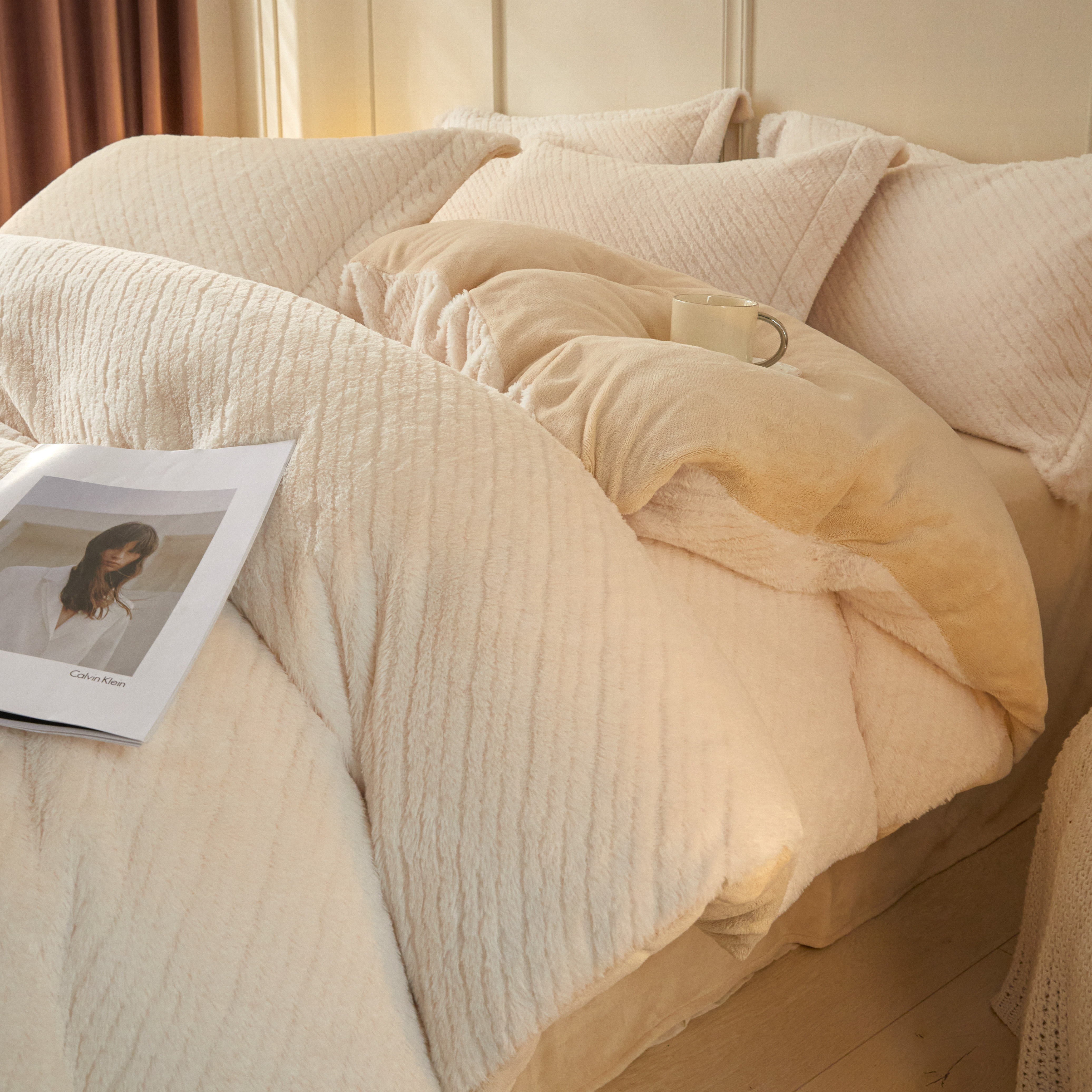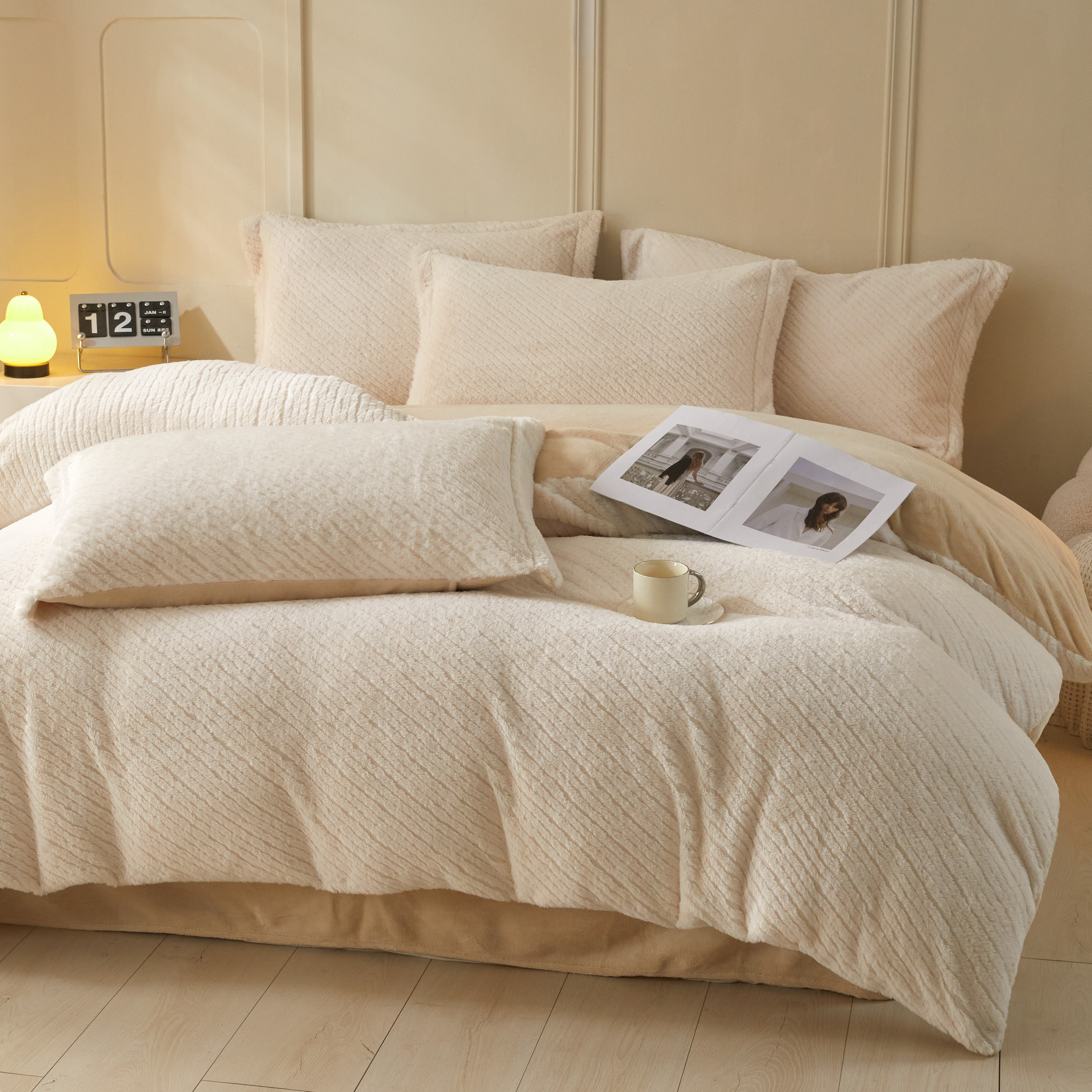 商品名称:凯罗 2025新款高克重兔绒四件套A类牛奶绒四件套 简约轻奢兔绒四件套 亚薇拉-奶昔白