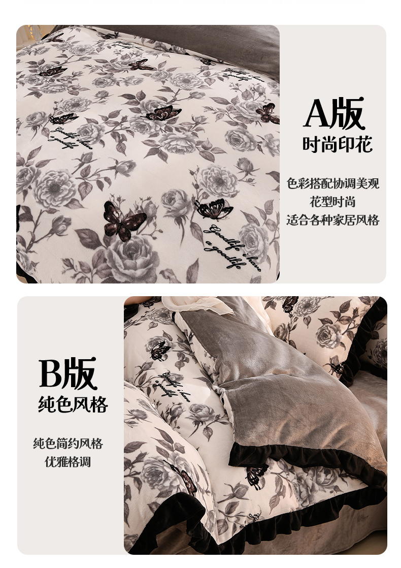 (总)紫月轩家纺 2025新款韩版牛奶绒花边款四件套,蝴蝶梦,浪漫花卉,蓝庭序,蝶舞,墨兔葡园,芳华,粉边樱桃,粉黛华庭,咖色玫瑰,童梦世界,碎花轻语,花墨纹,素枝,粉花猫语,复古叶影,花枝招展,紫金花朵,绿野花卉,紫梦纱