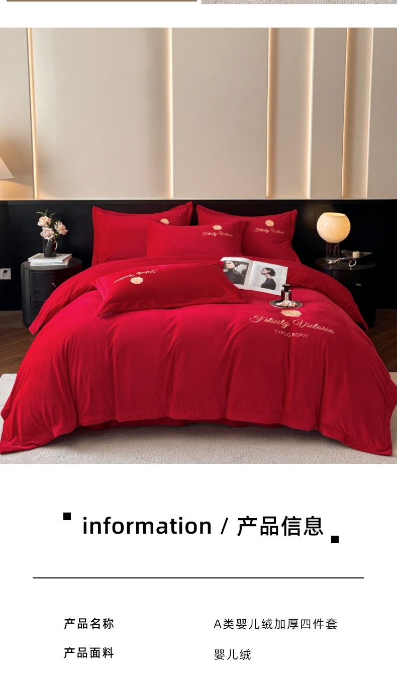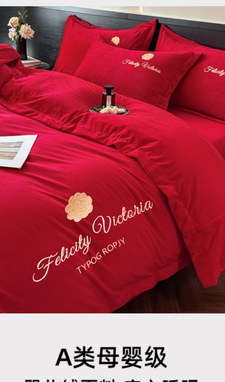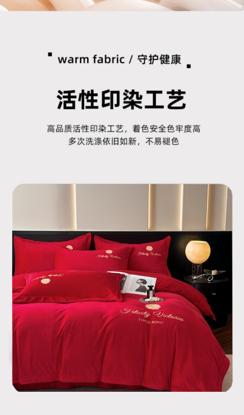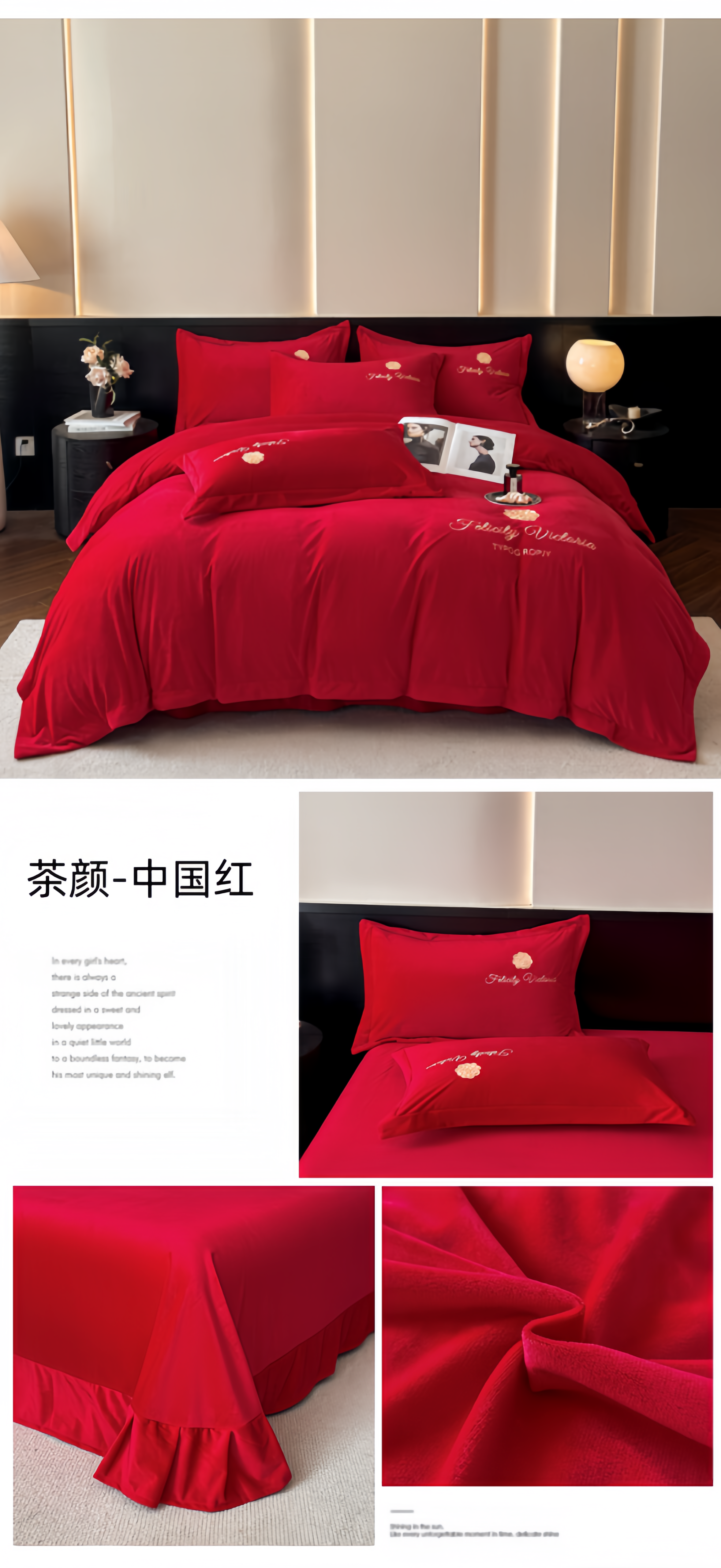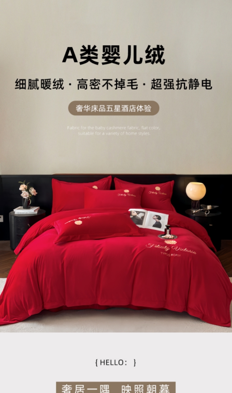 商品名称:鸿织源2025新款-茶颜系列 宝宝绒宽边四件套 茶颜-中国红
