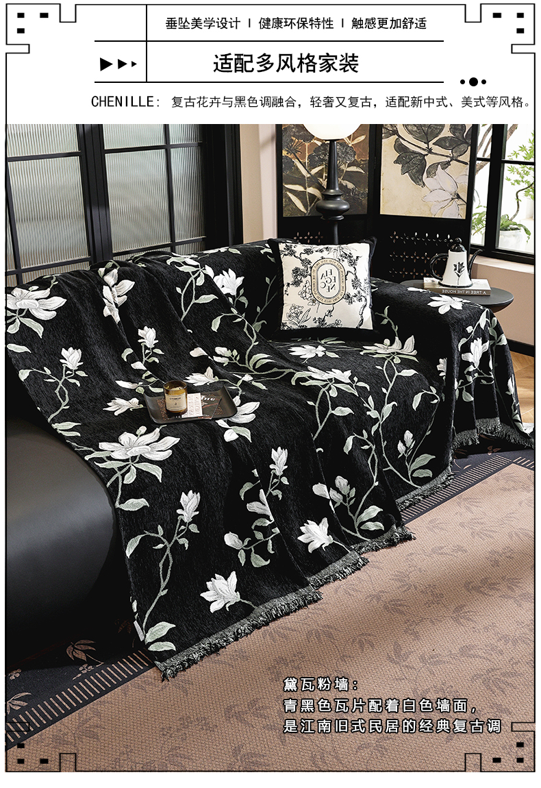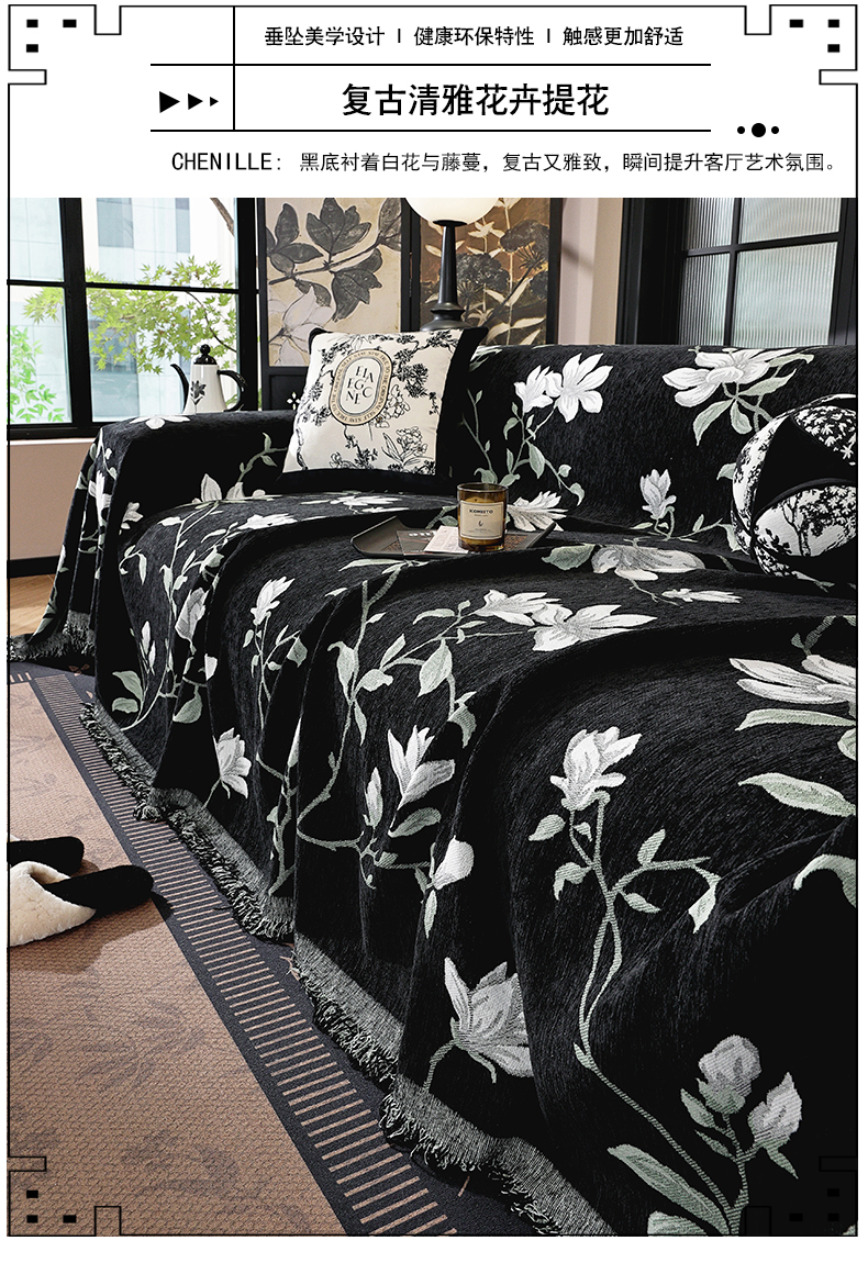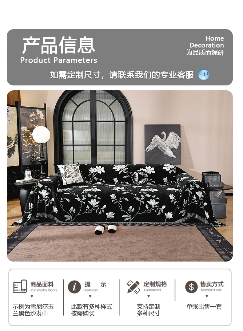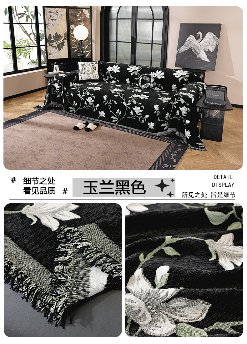 当前位置: 91家纺网 > 商品网购 > 居家布艺 > 防尘保护罩 > 其它罩类/套类 > 共鸣沙发垫 2025新款亲肤舒适雪尼尔玉兰黑色沙发巾 玉兰黑色 180x130cm沙发巾