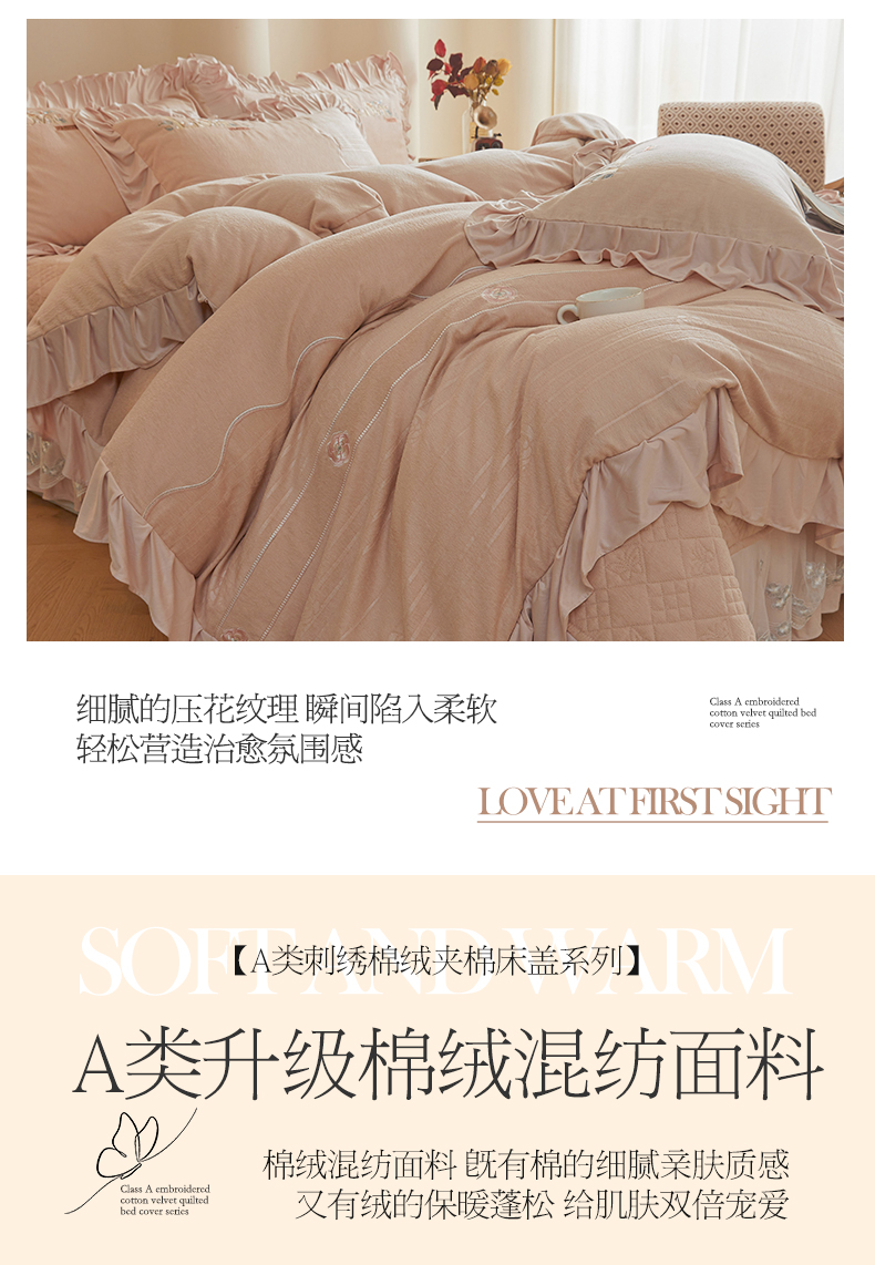 (总)宜凡家纺 2025新款兔绒提花牛奶绒夹棉床裙四件套,爱心 少女粉,爱心 粉紫,爱心 驼色,蝶舞 大红,蝶舞 米色,蝶舞 浅紫,蝶舞 玉色,简爱 苍青,简爱 豆沙紫,简爱 玉色,樱桃 苍青,樱桃 豆沙紫,樱桃 奶油白