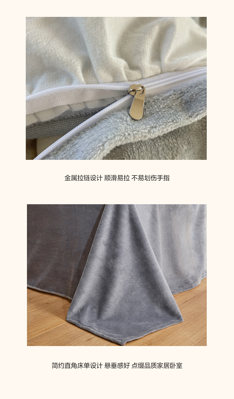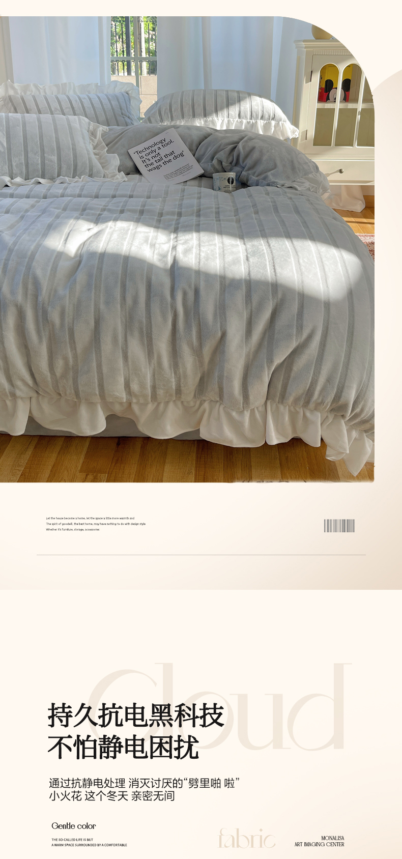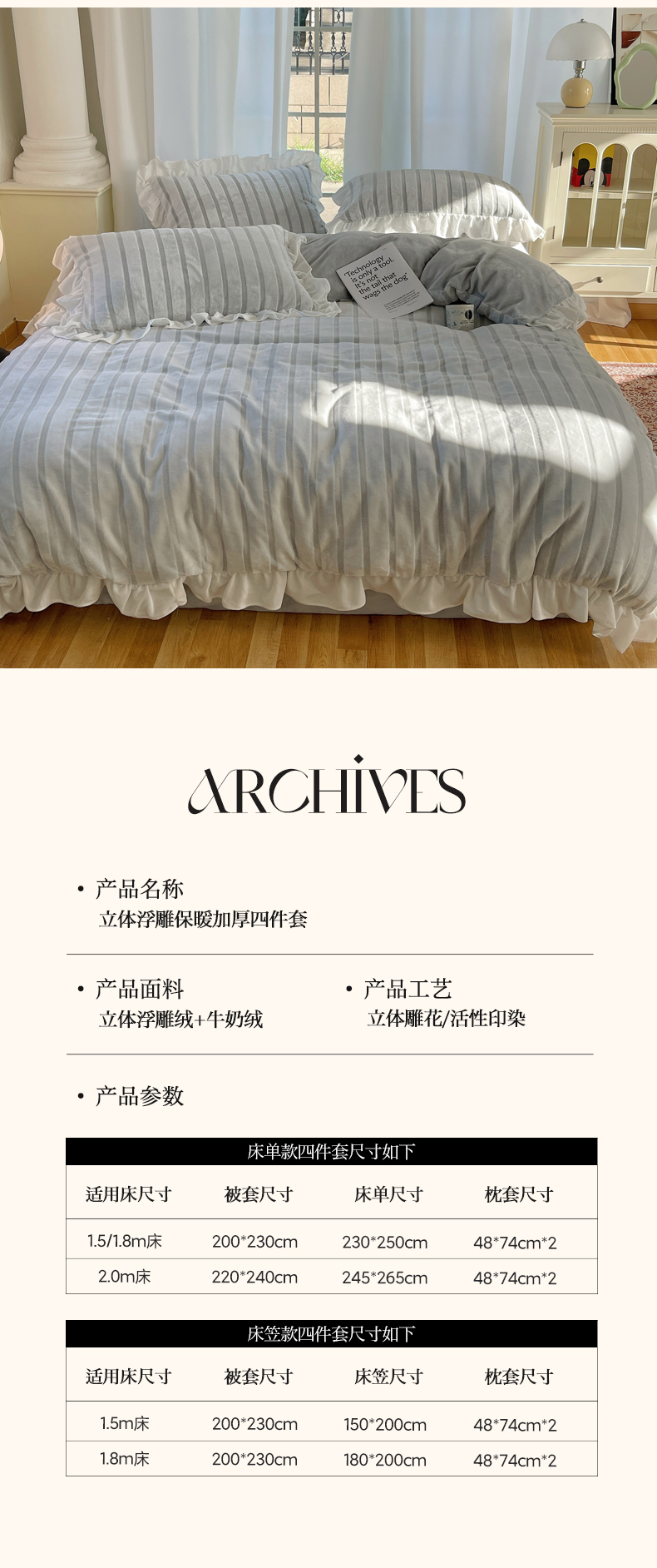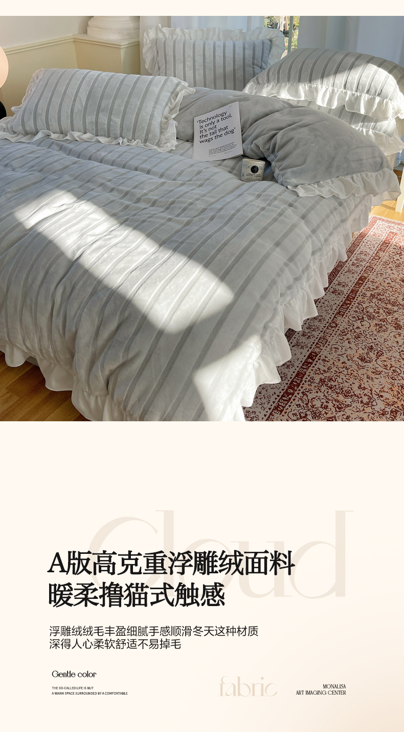 当前位置: 91家纺网 > 商品网购 > 床品套件 > 四件套 > 牛奶绒四件套 > 三朵家纺 2025新款3D立体加厚雕花绒牛奶绒花边款四件套 花边宽条-灰色