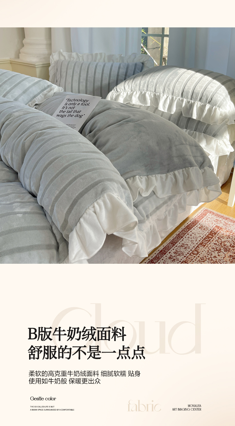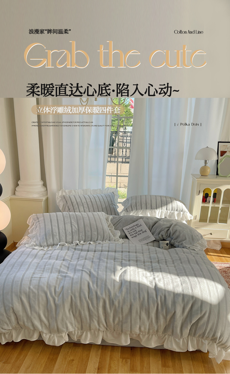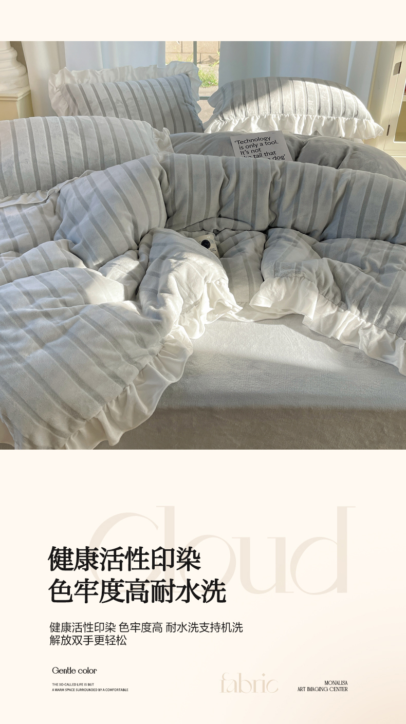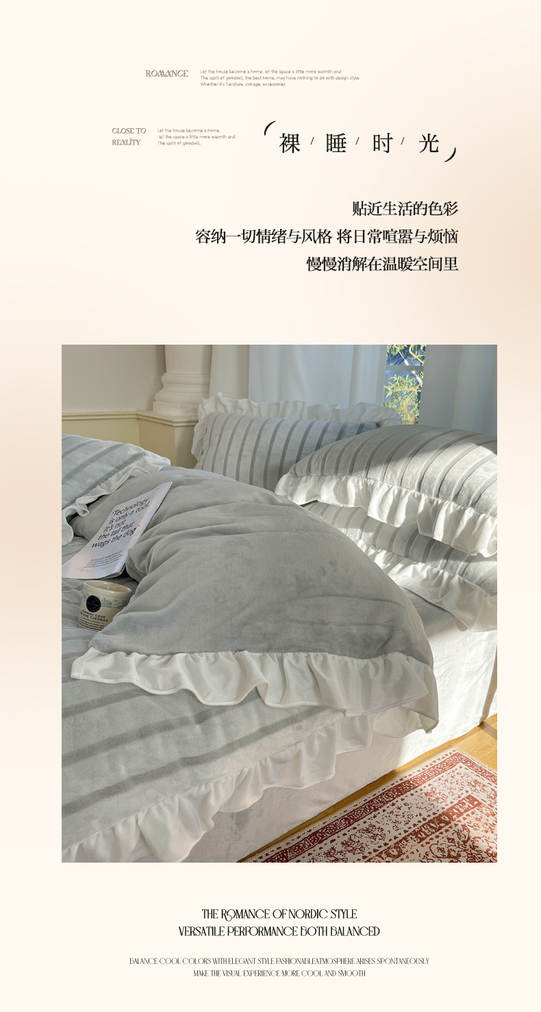 当前位置: 91家纺网 > 商品网购 > 床品套件 > 四件套 > 牛奶绒四件套 > 三朵家纺 2025新款3D立体加厚雕花绒牛奶绒花边款四件套 花边宽条-灰色