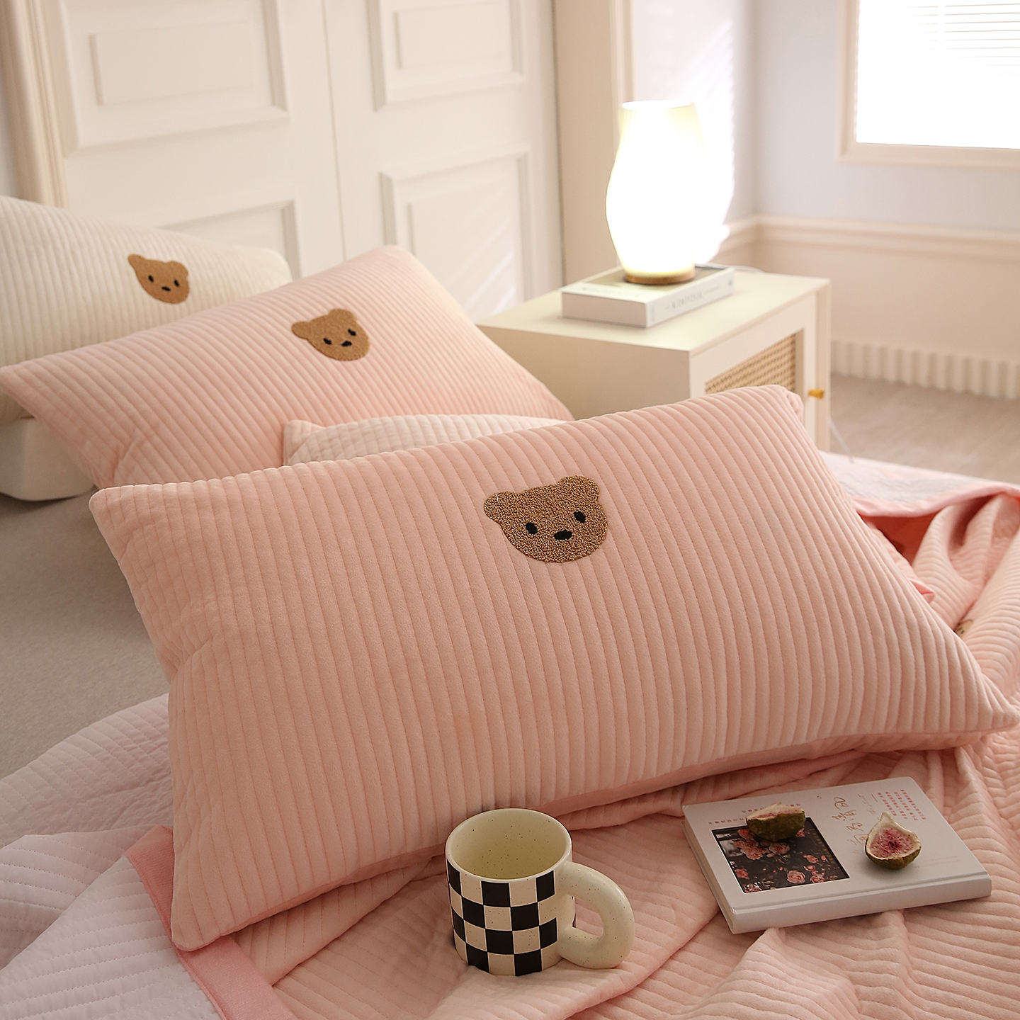 (总)期遇家居 2025新款夹棉绗缝绒枕套毛巾绣绒小熊枕套,绒小熊白,绒小熊灰,绒小熊玉,绒小熊咖