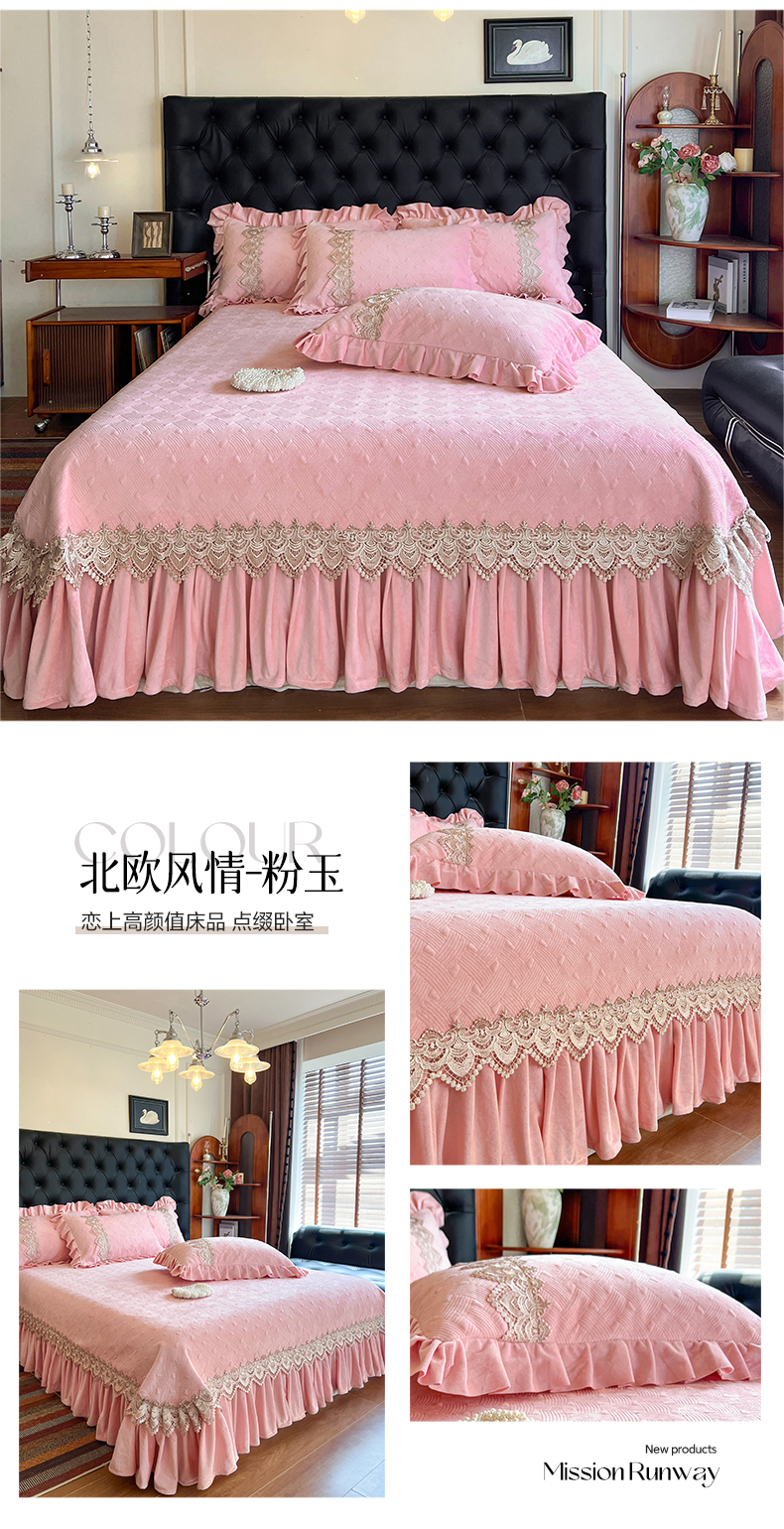 • 91家纺网 家纺一手货源 找家纺 (总)瑞宝 2025新款雕花牛奶绒花边夹棉床盖四件套-莫妮卡,奶昔白,抹茶绿,奶茶咖,少女粉,雾蓝