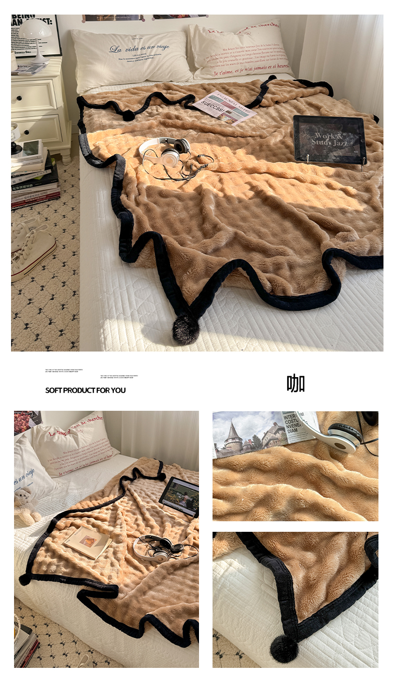 小叮当家纺仓储工厂店 2025新款简约泡泡绒黑球包边毛毯毯子午睡毯 泡泡-蓝