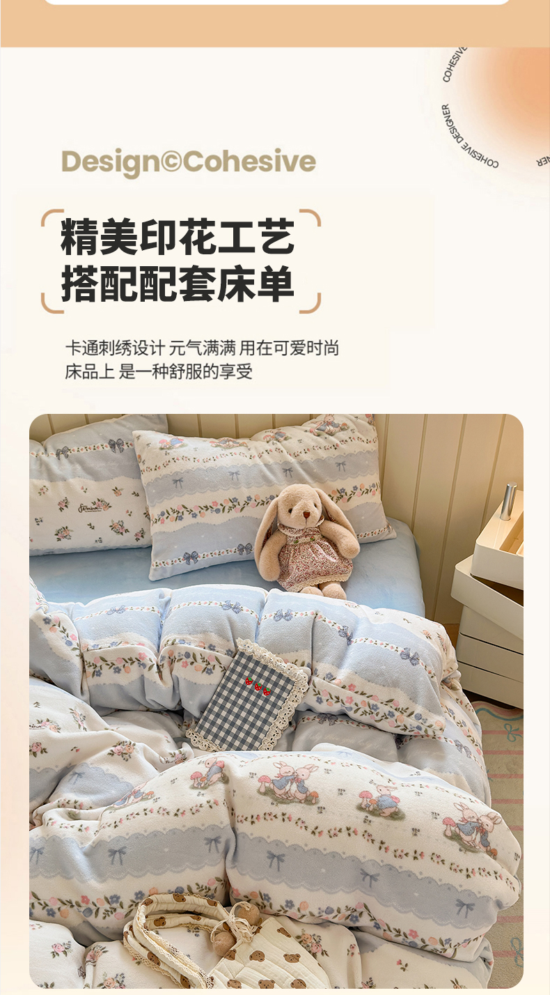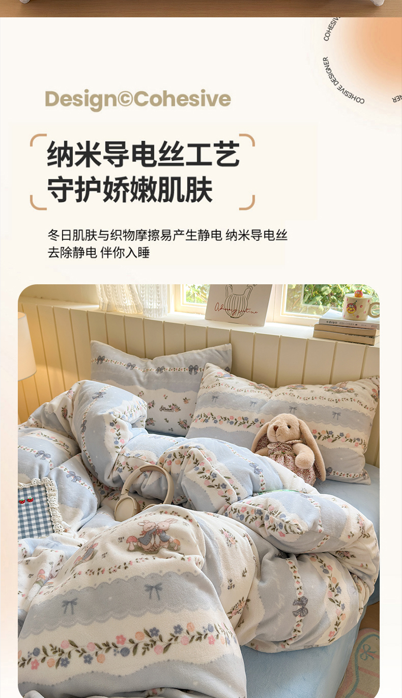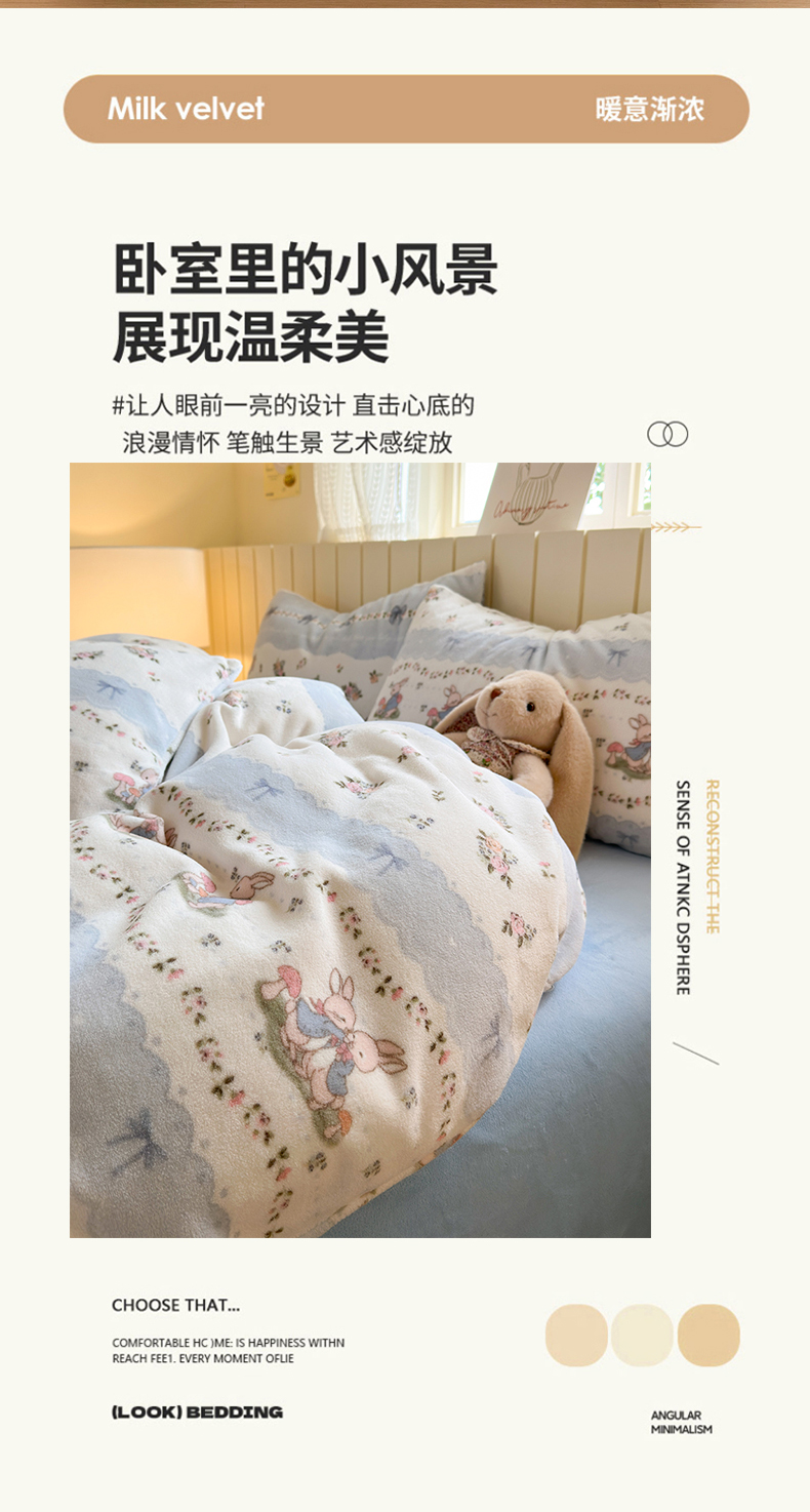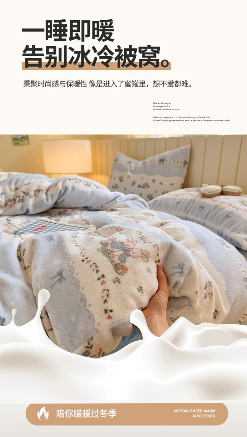 当前位置: 91家纺网 > 商品网购 > 床品套件 > 四件套 > 牛奶绒四件套 > 丽美人家纺 2025新款小版印花牛奶绒四件套 花边小兔