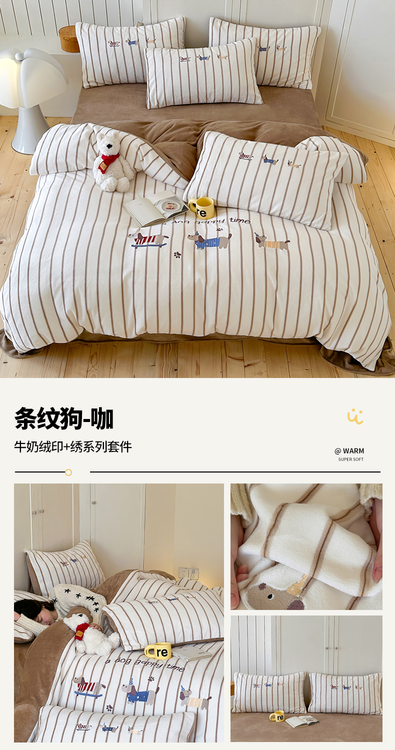 (总)优悦生活馆 2025新款牛奶绒卡通印花刺绣四件套系列,波点猫-白+粉,波点猫-蓝,格子熊-豆沙,格子熊-灰,格子熊-咖,条纹狗-咖,条纹狗-蓝,条纹狗-绿