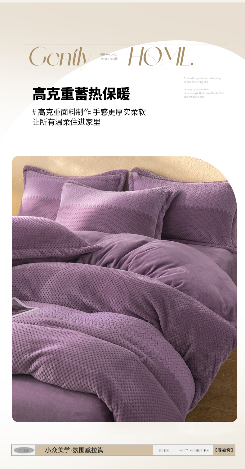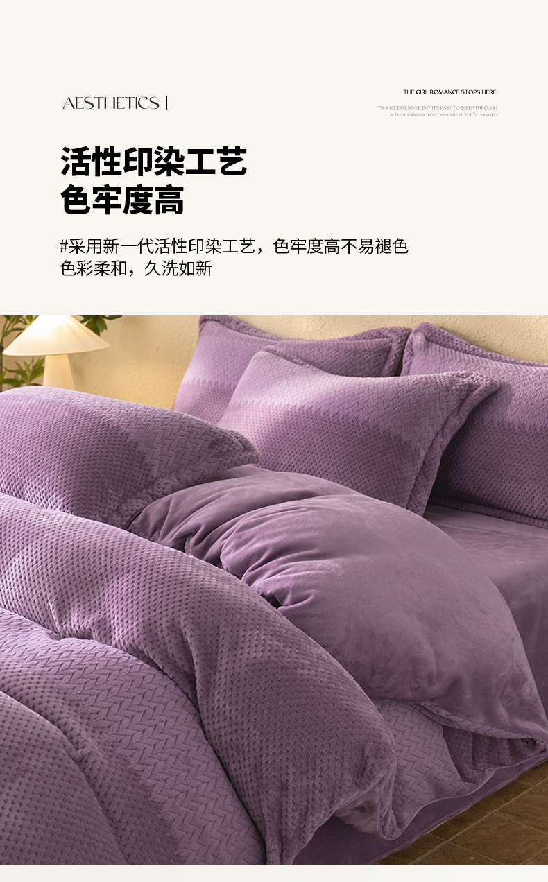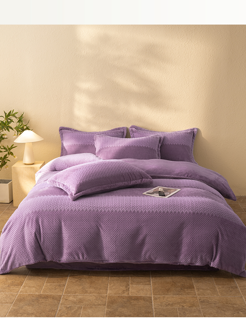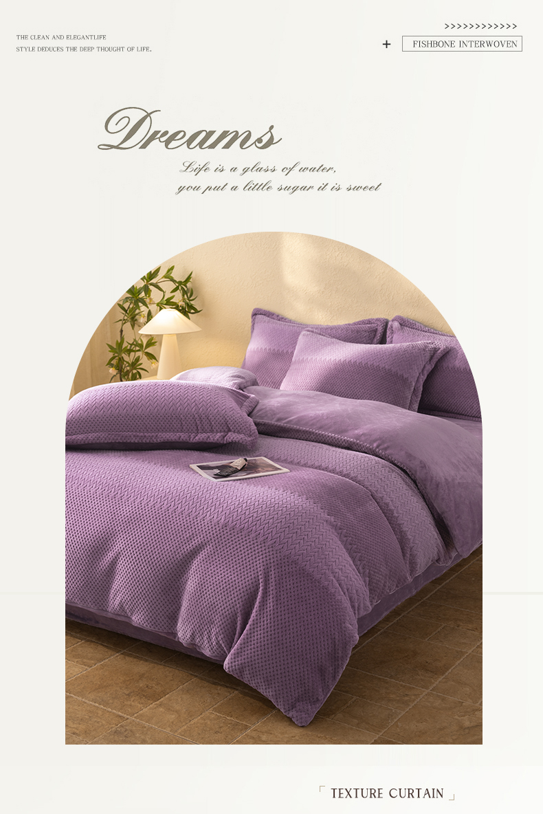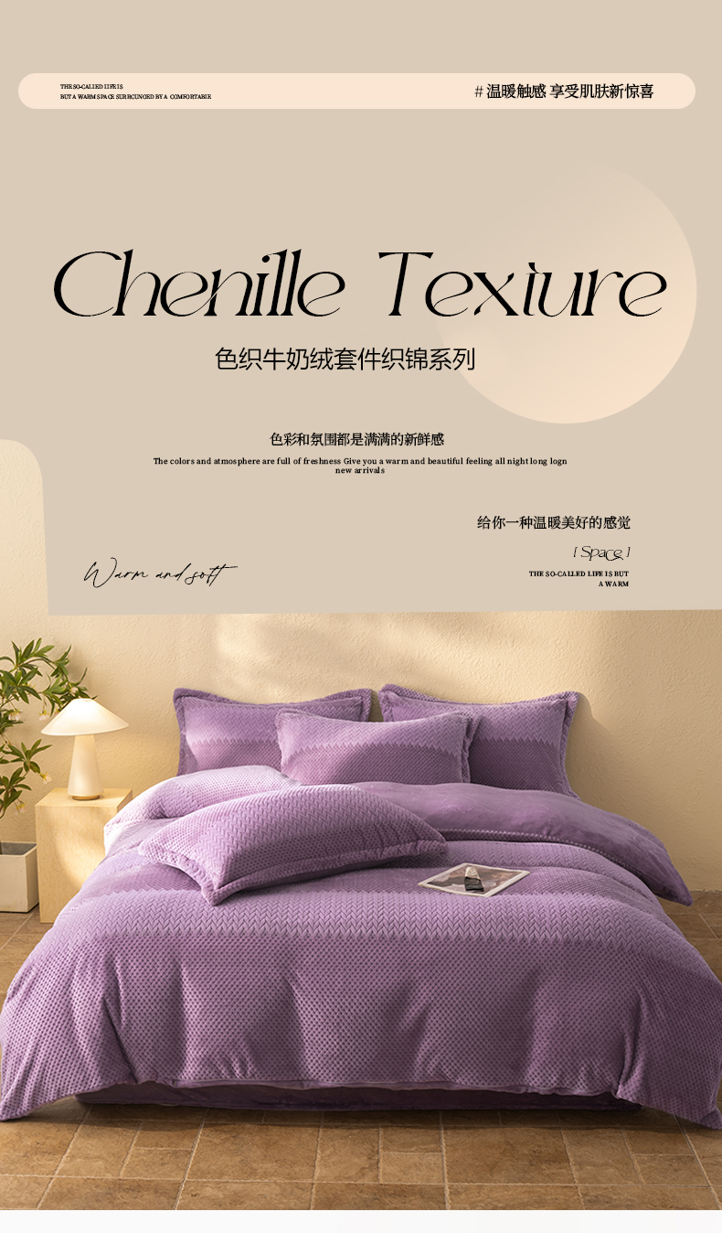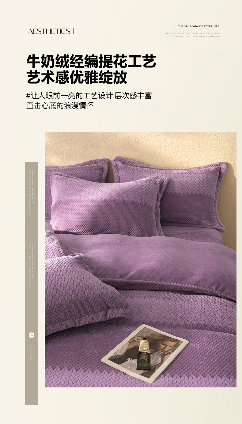 当前位置: 91家纺网 > 商品网购 > 床品套件 > 四件套 > 牛奶绒四件套 > 源舍家纺 2025新款色织拼色编织提花轻奢牛奶绒四件套(场景二) 织锦-紫菱