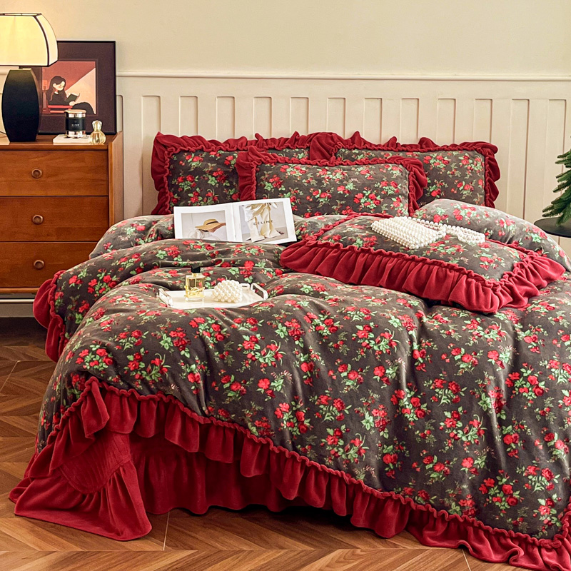 商品名称:尚美 2025新款法式复古风大花边绒床盖被套四件套(花边随机) 复古风花妖