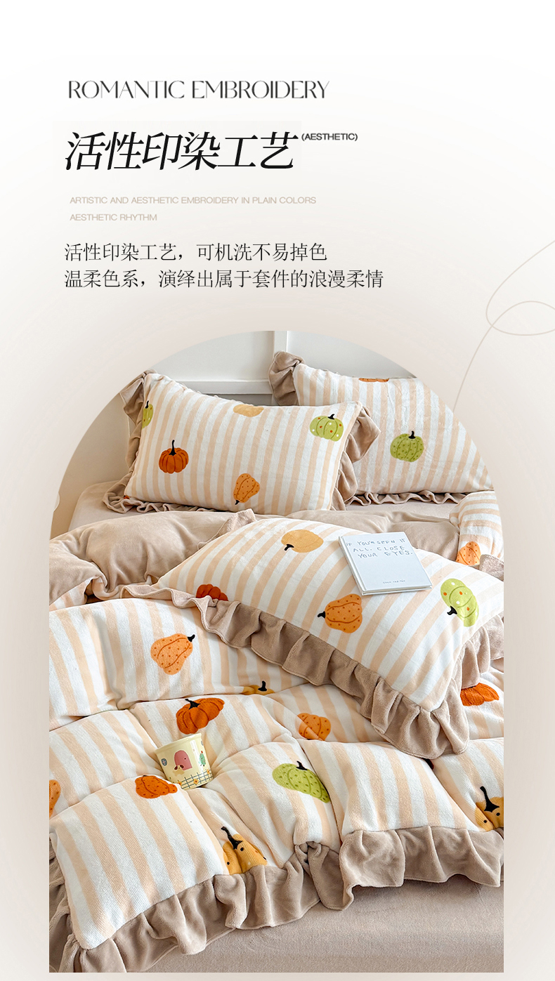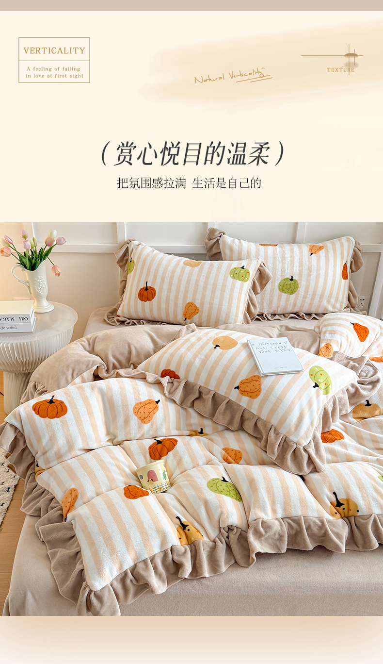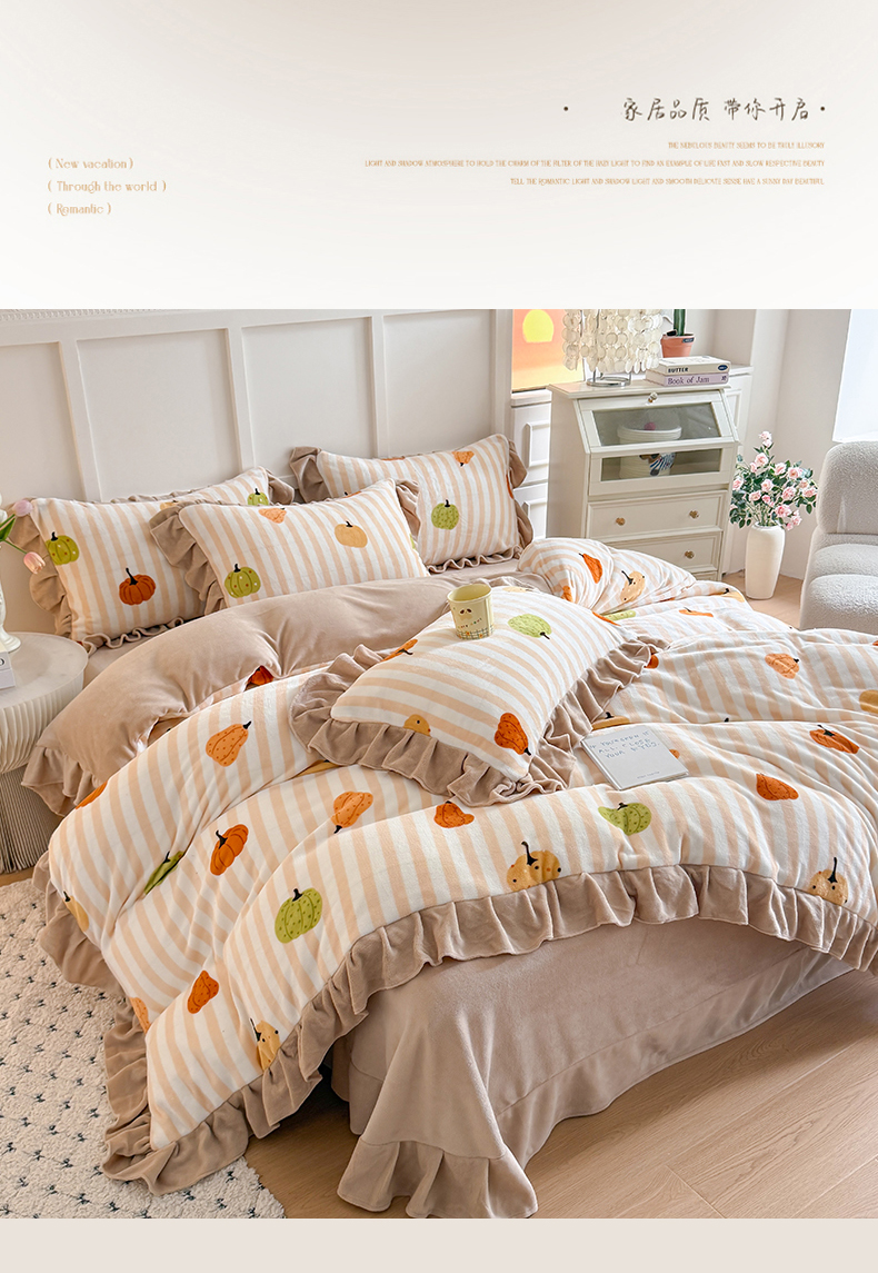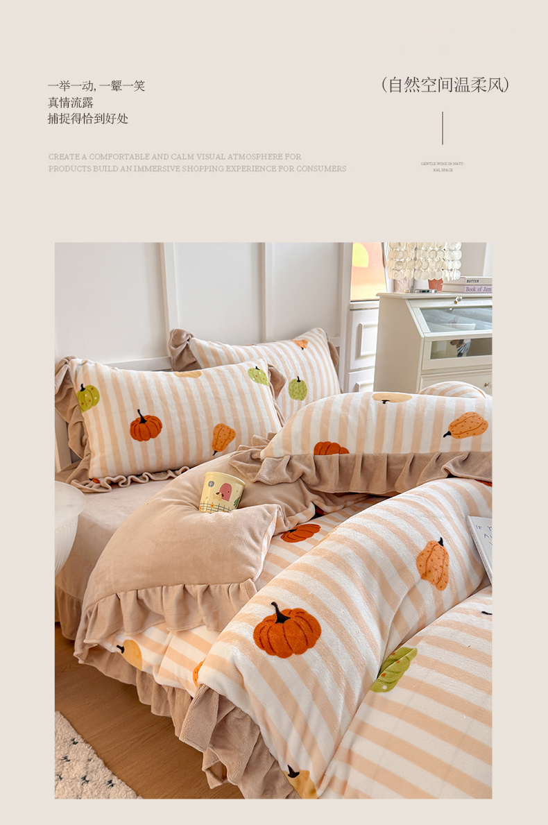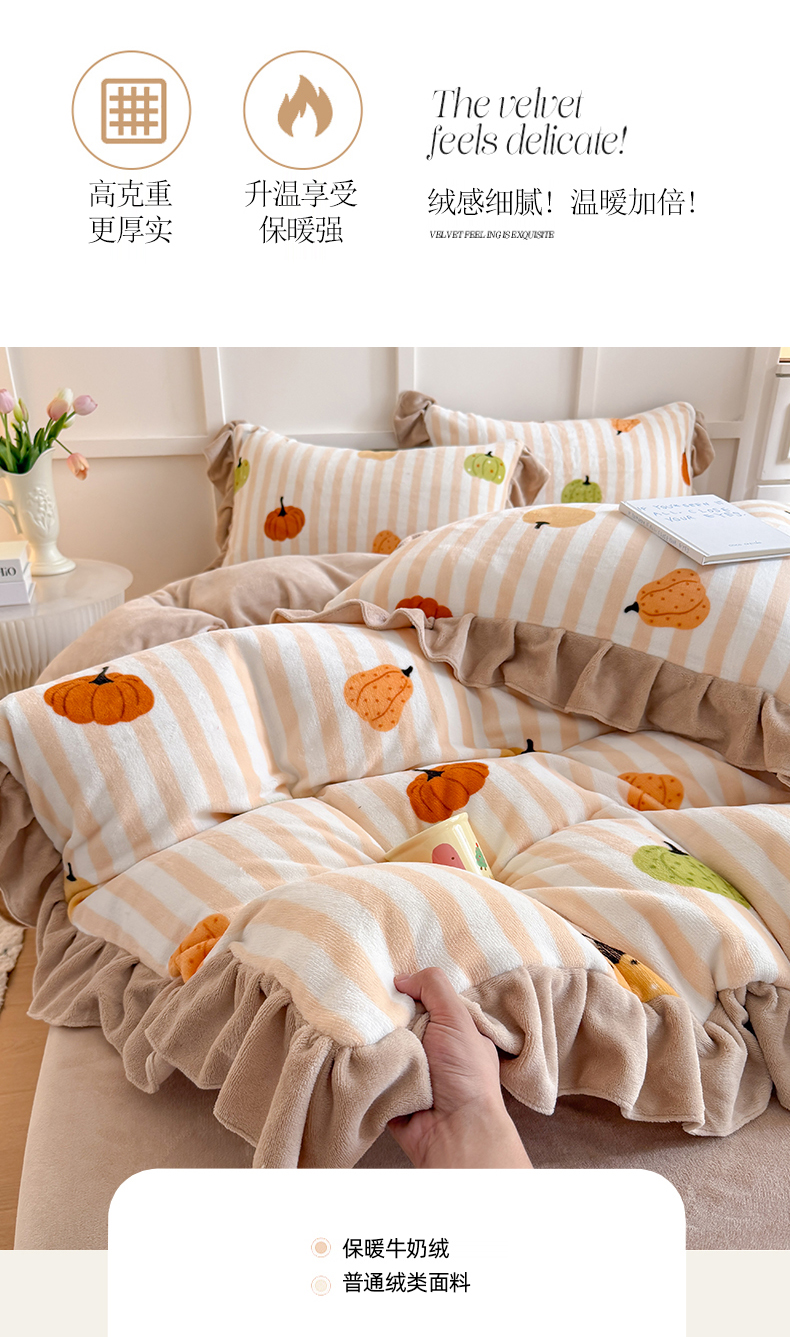 当前位置: 91家纺网 > 商品网购 > 床品套件 > 四件套 > 牛奶绒四件套 > 艾特你 2025新款200g全工艺牛奶绒花边款四件套吊边床单 花边绒-条纹南瓜