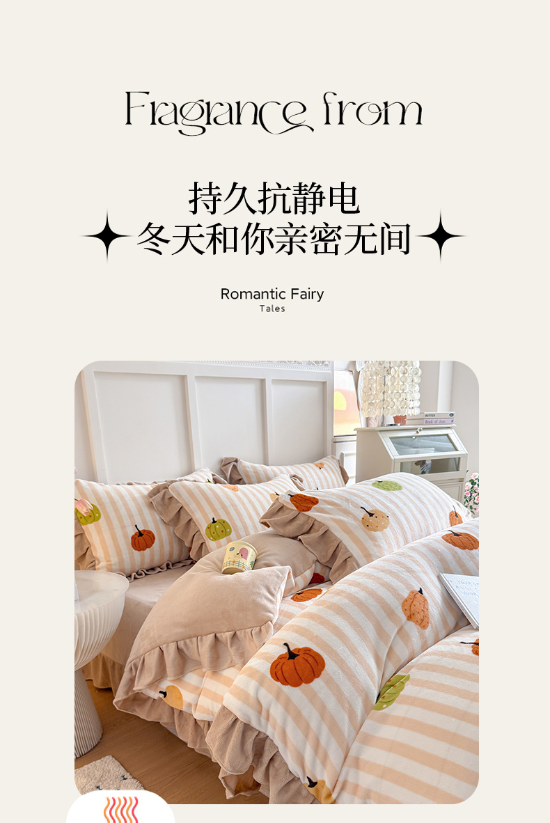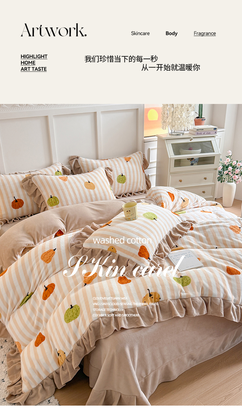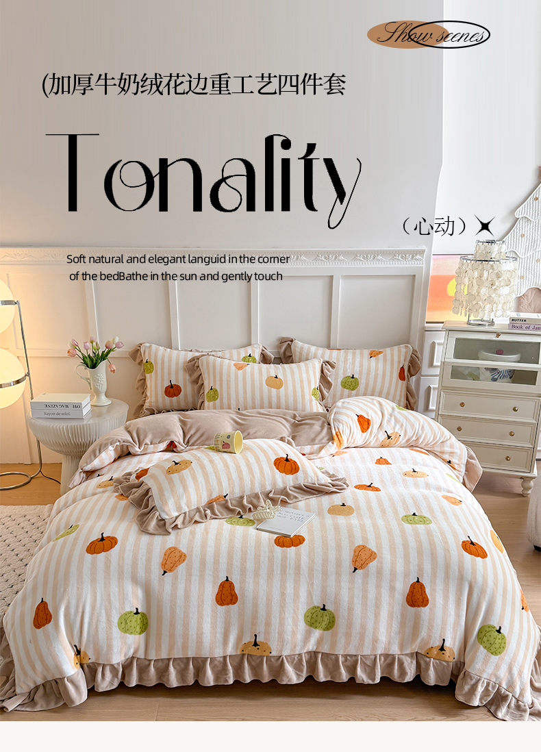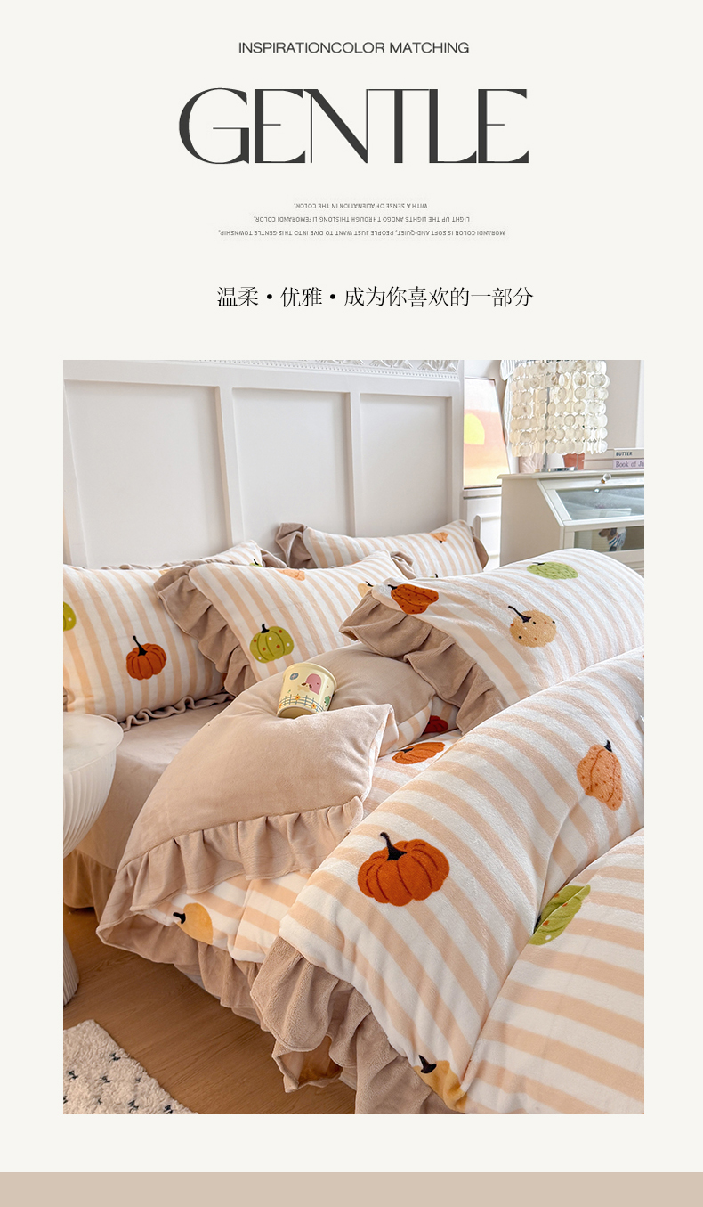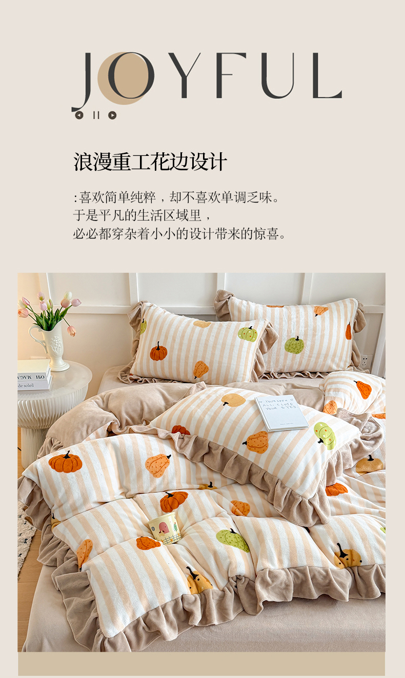 当前位置: 91家纺网 > 商品网购 > 床品套件 > 四件套 > 牛奶绒四件套 > 艾特你 2025新款200g全工艺牛奶绒花边款四件套吊边床单 花边绒-条纹南瓜