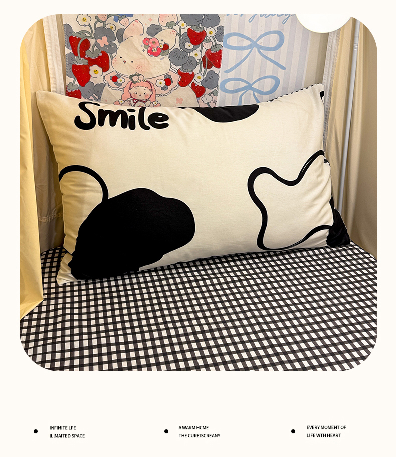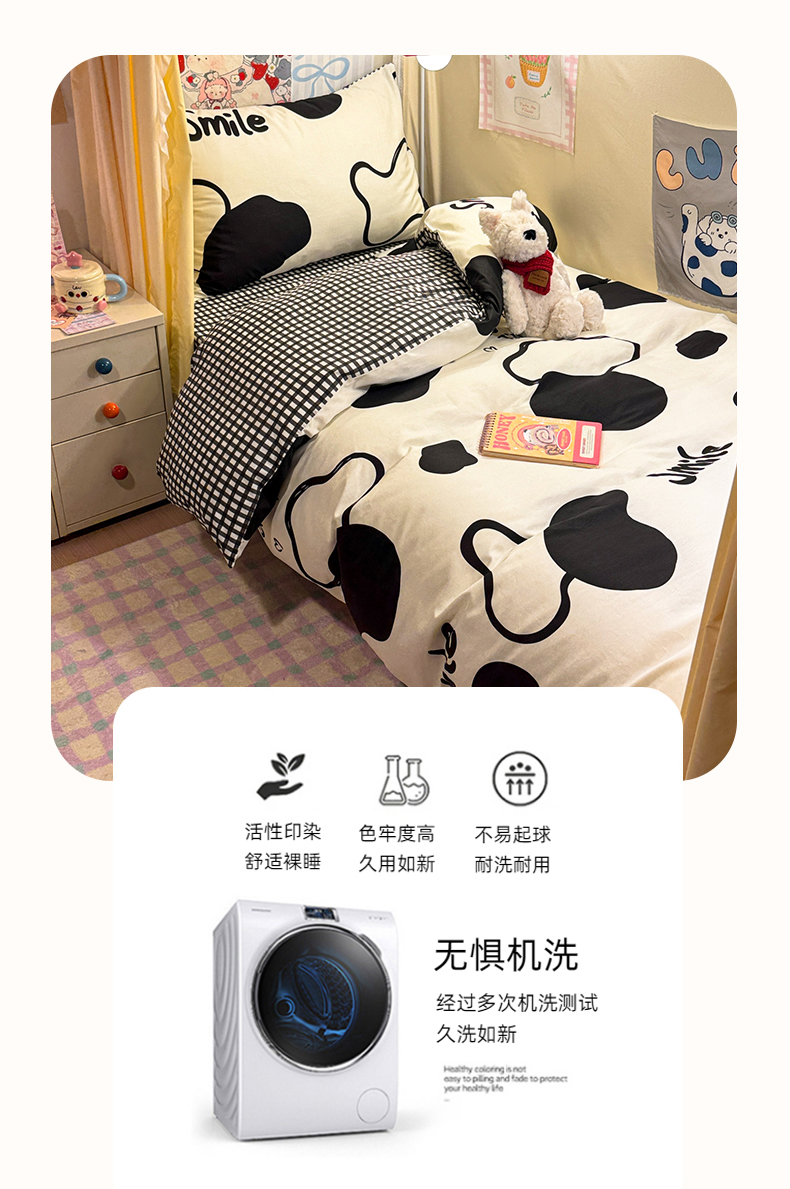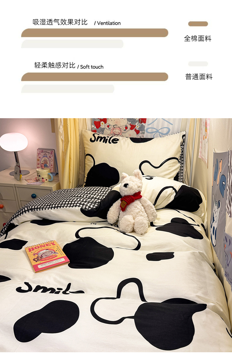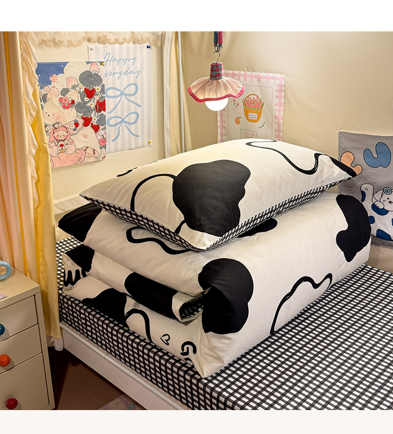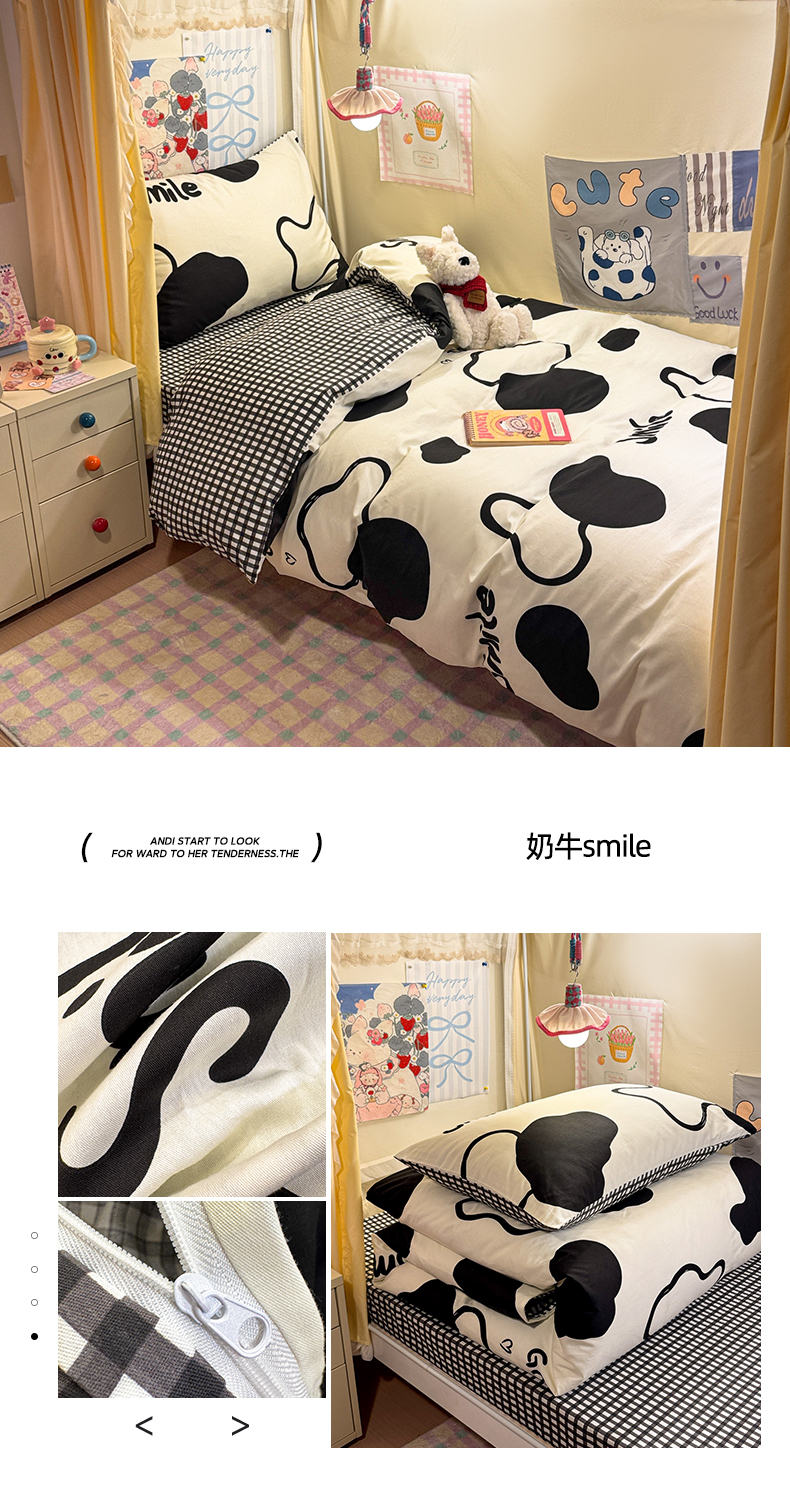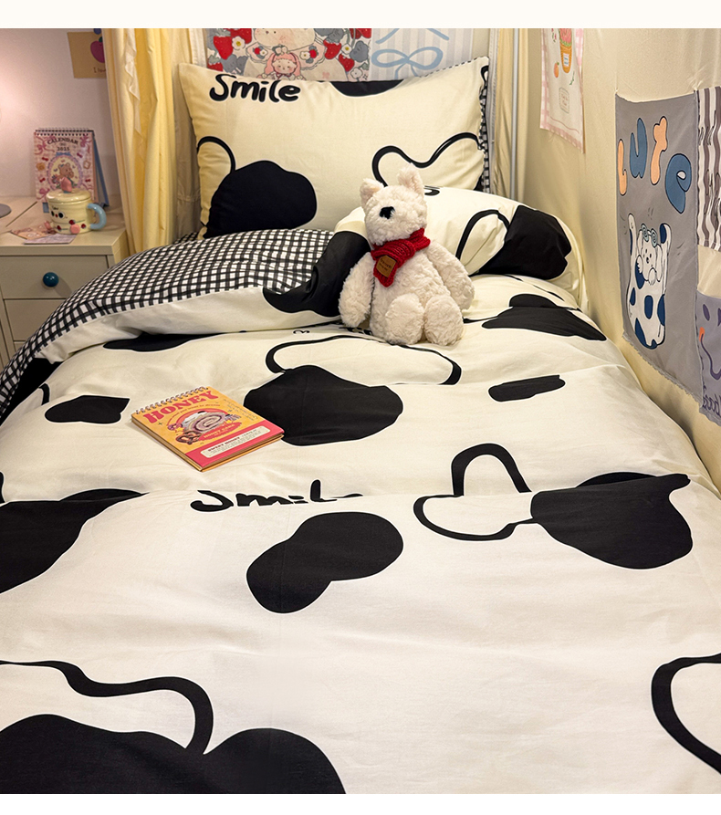 当前位置: 91家纺网 > 商品网购 > 床品套件 > 三件套 > 简宜家居(朝初家纺) 2025新款全棉12868斜纹卡通花卉学生三件套四件套 奶牛smile