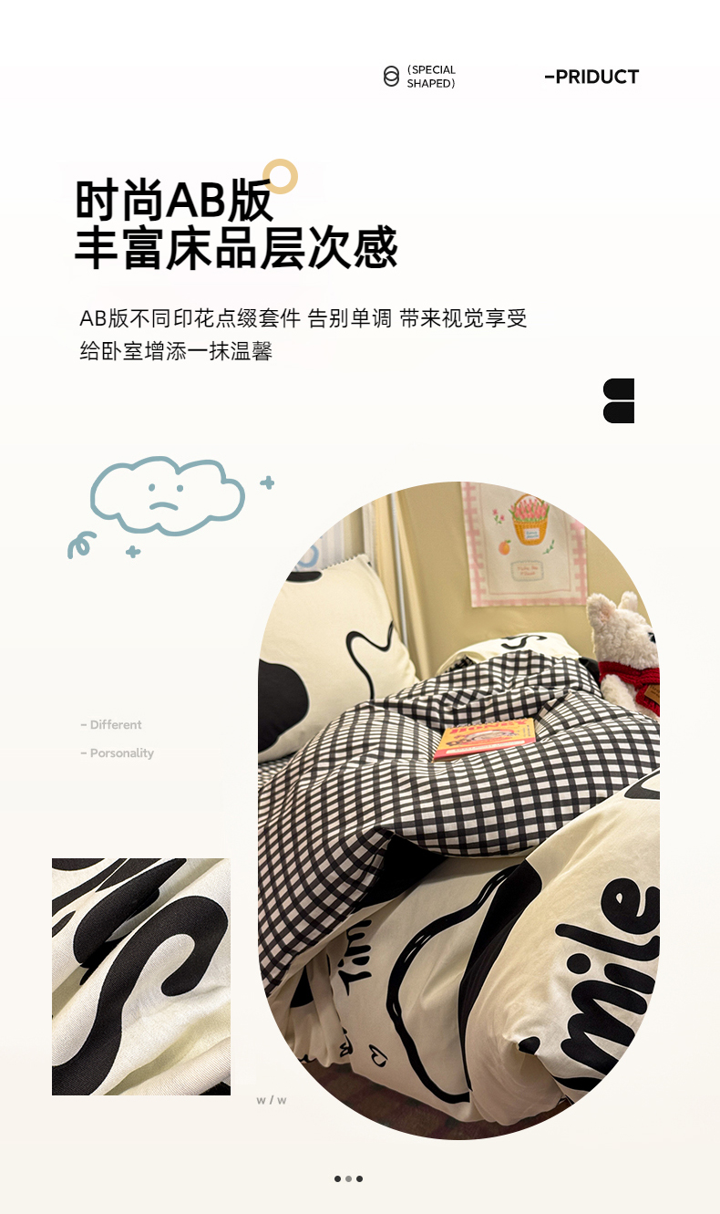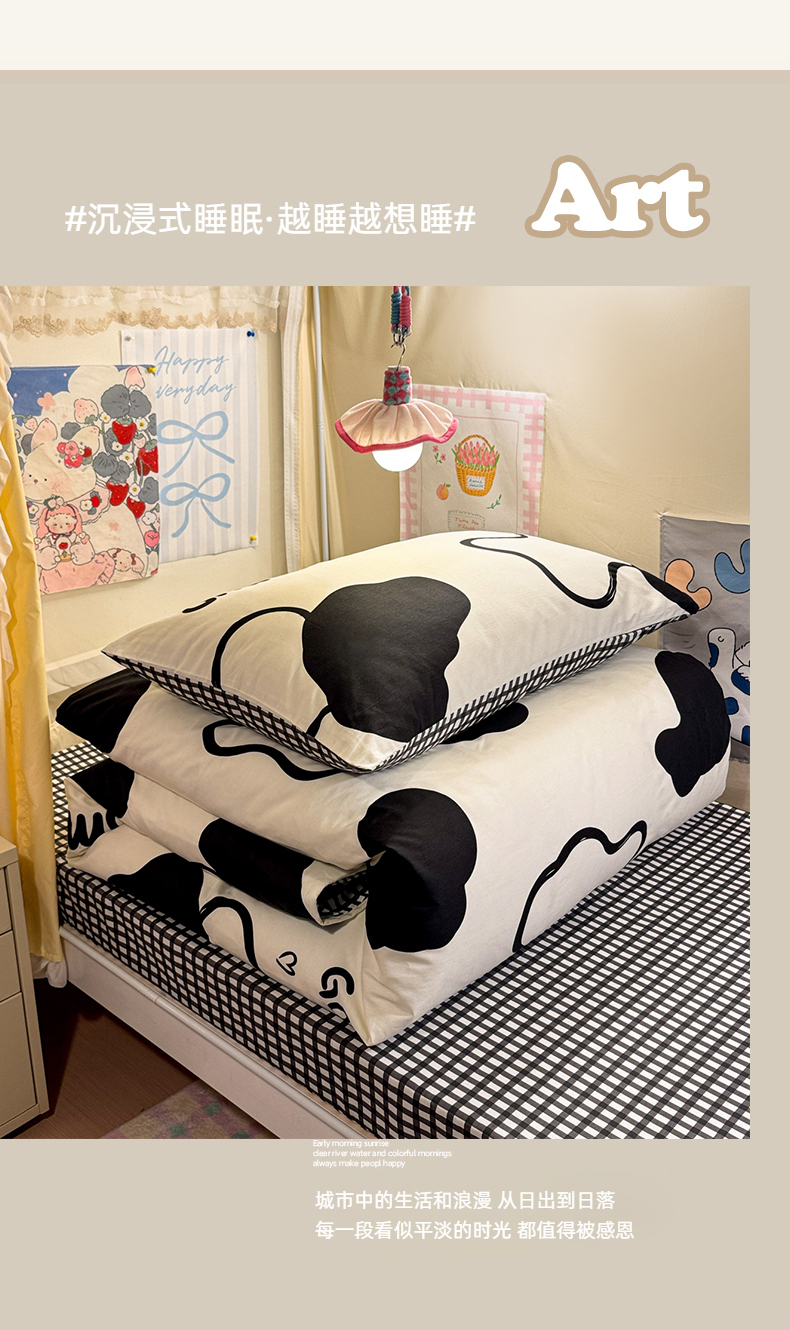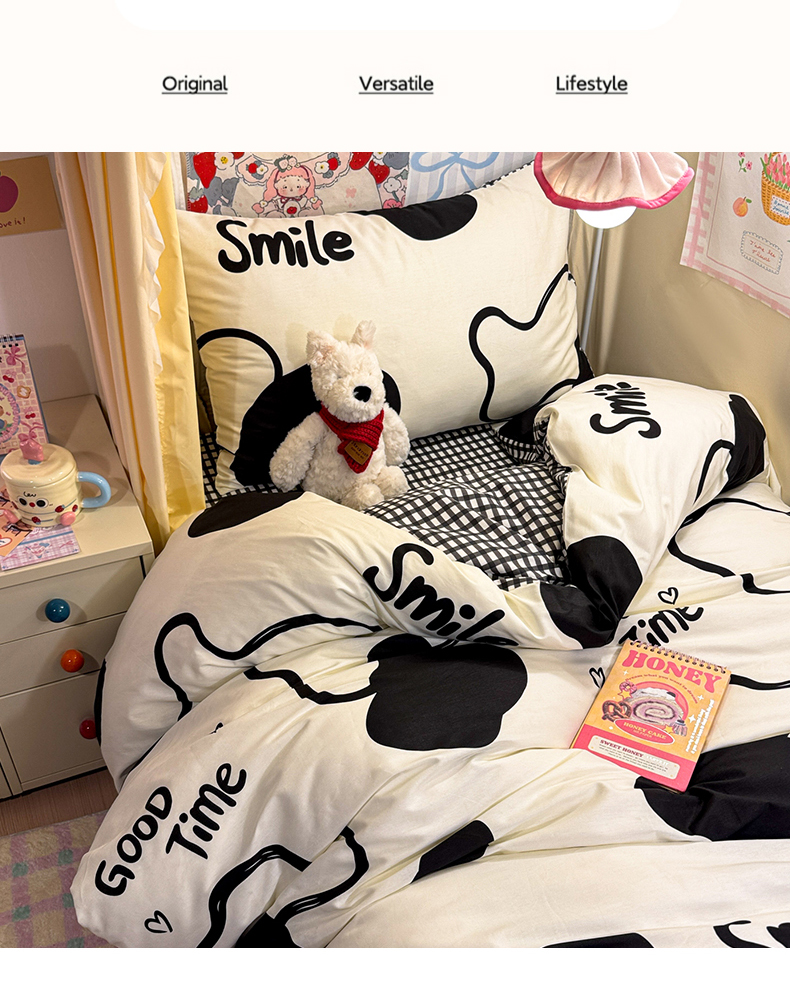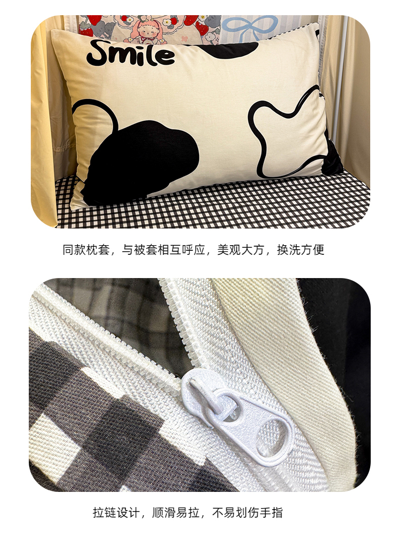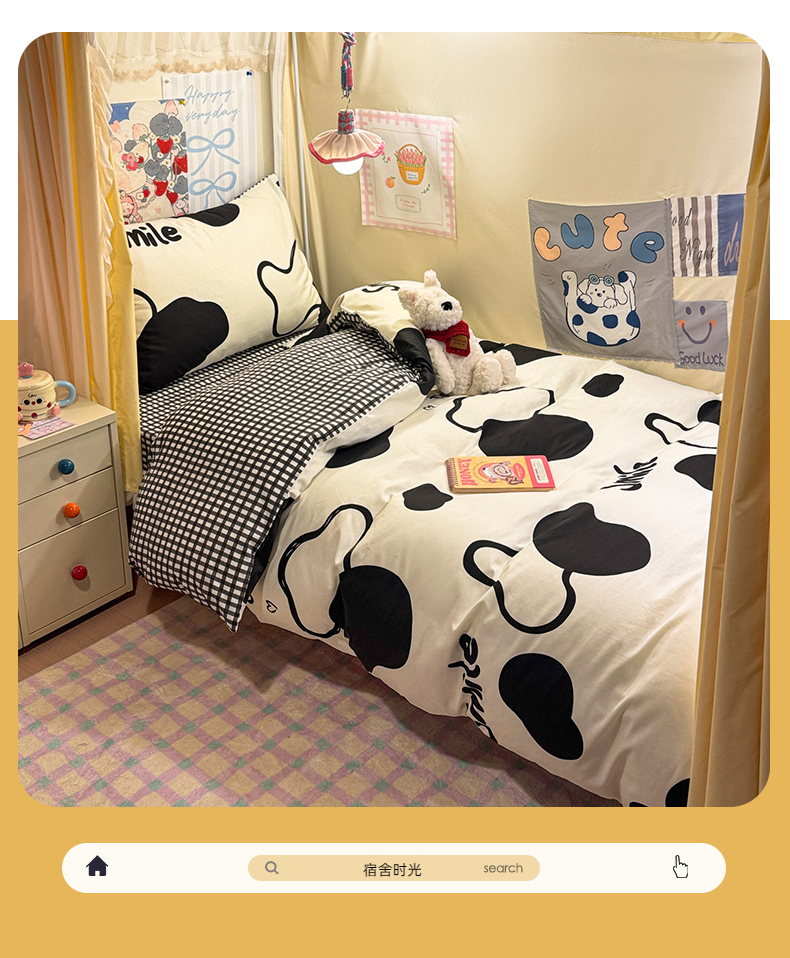 当前位置: 91家纺网 > 商品网购 > 床品套件 > 三件套 > 简宜家居(朝初家纺) 2025新款全棉12868斜纹卡通花卉学生三件套四件套 奶牛smile