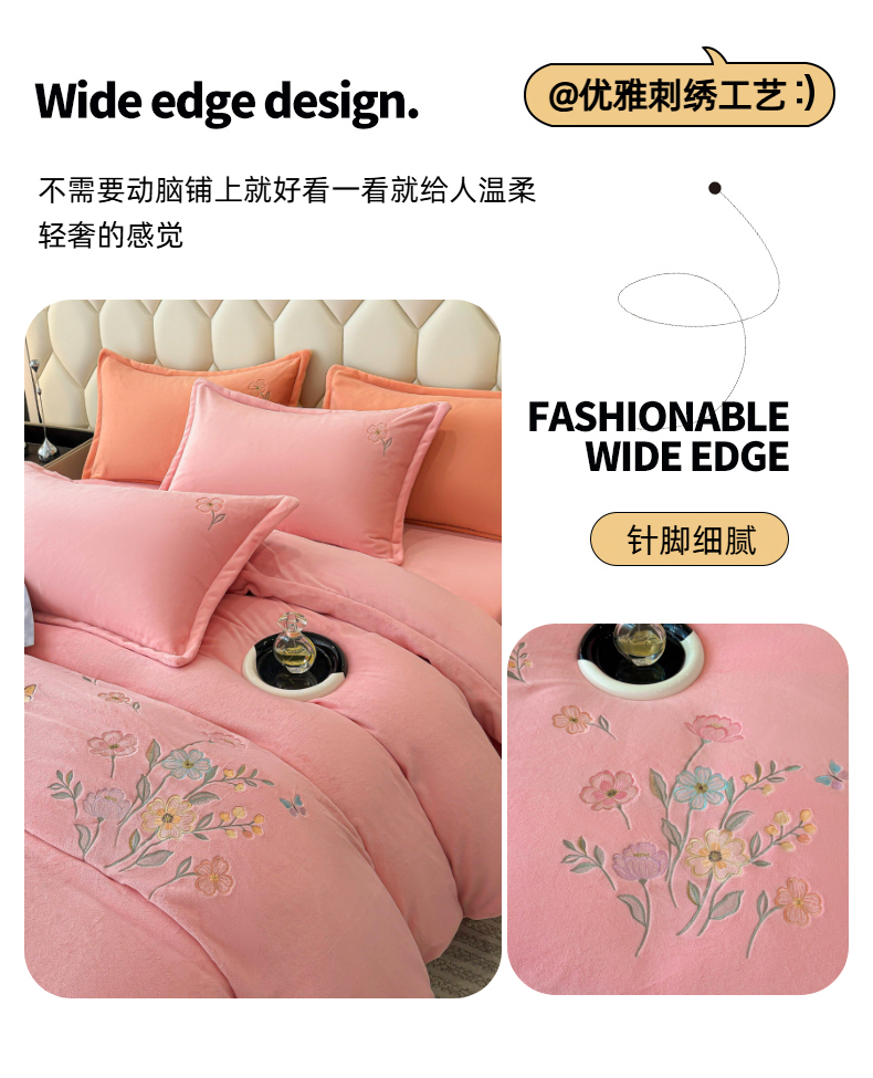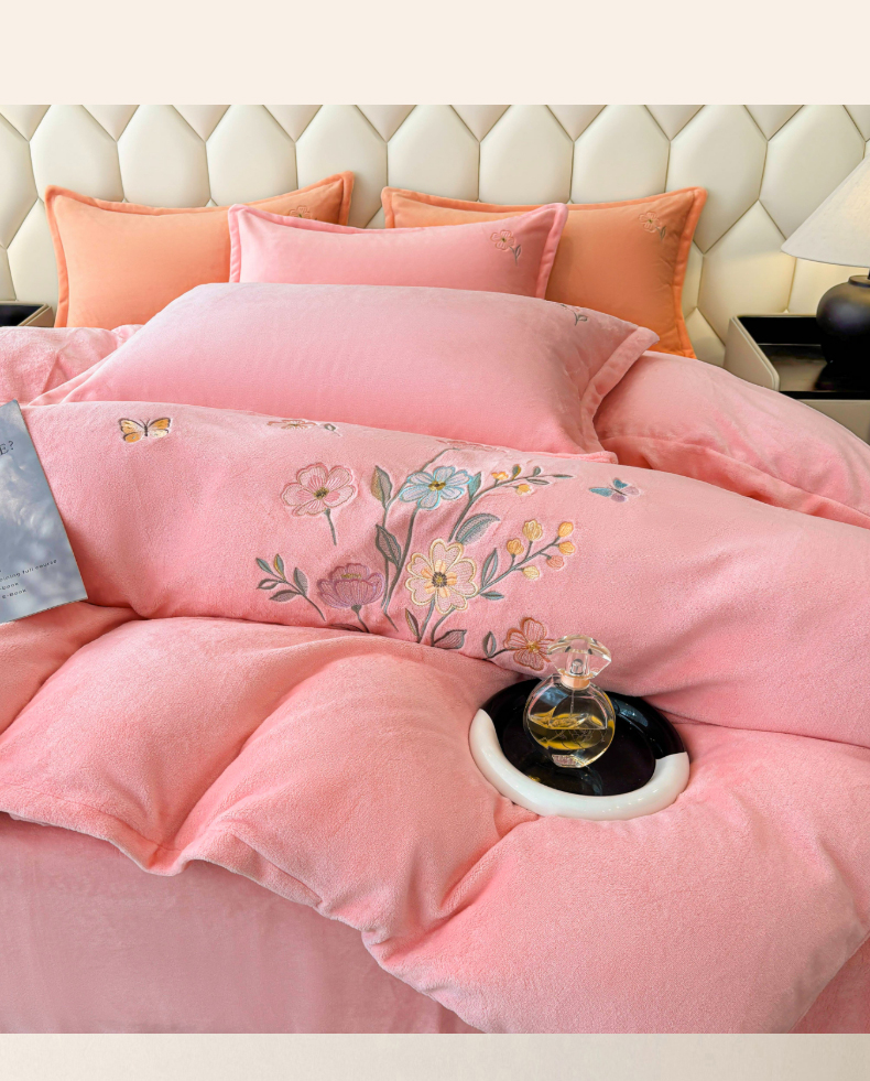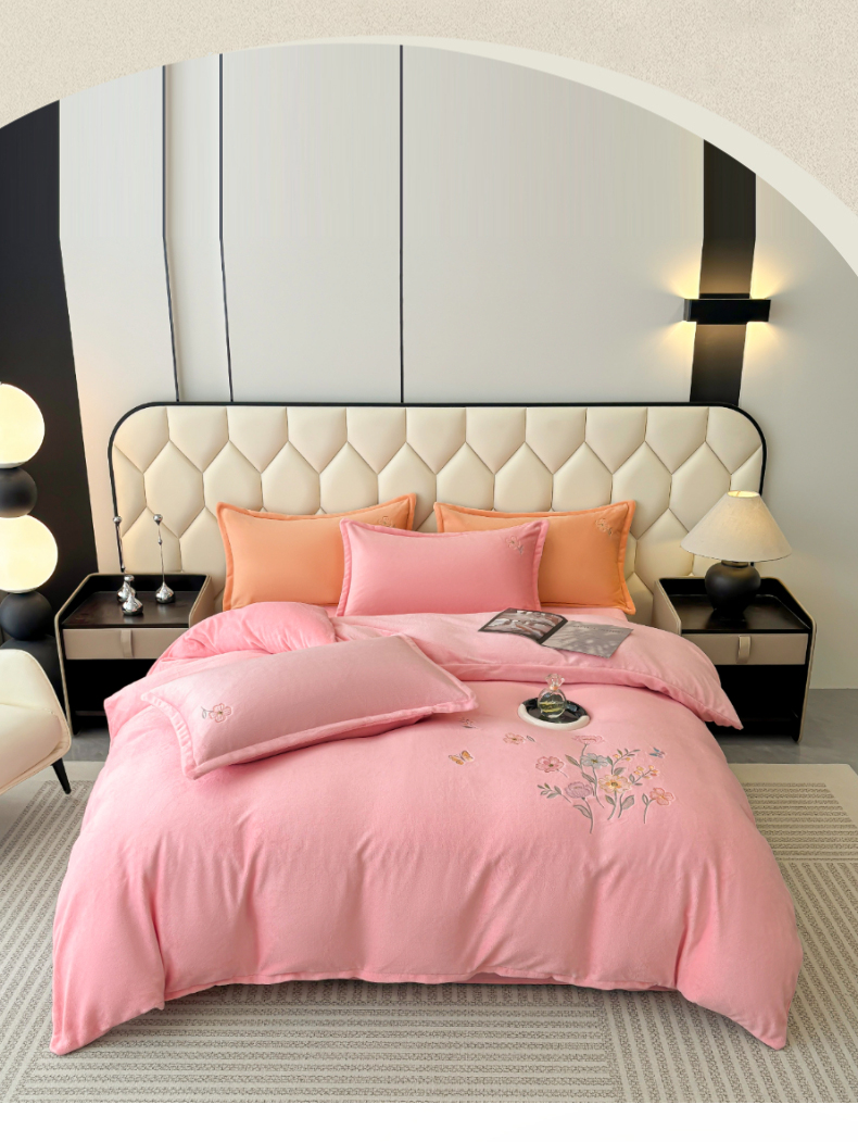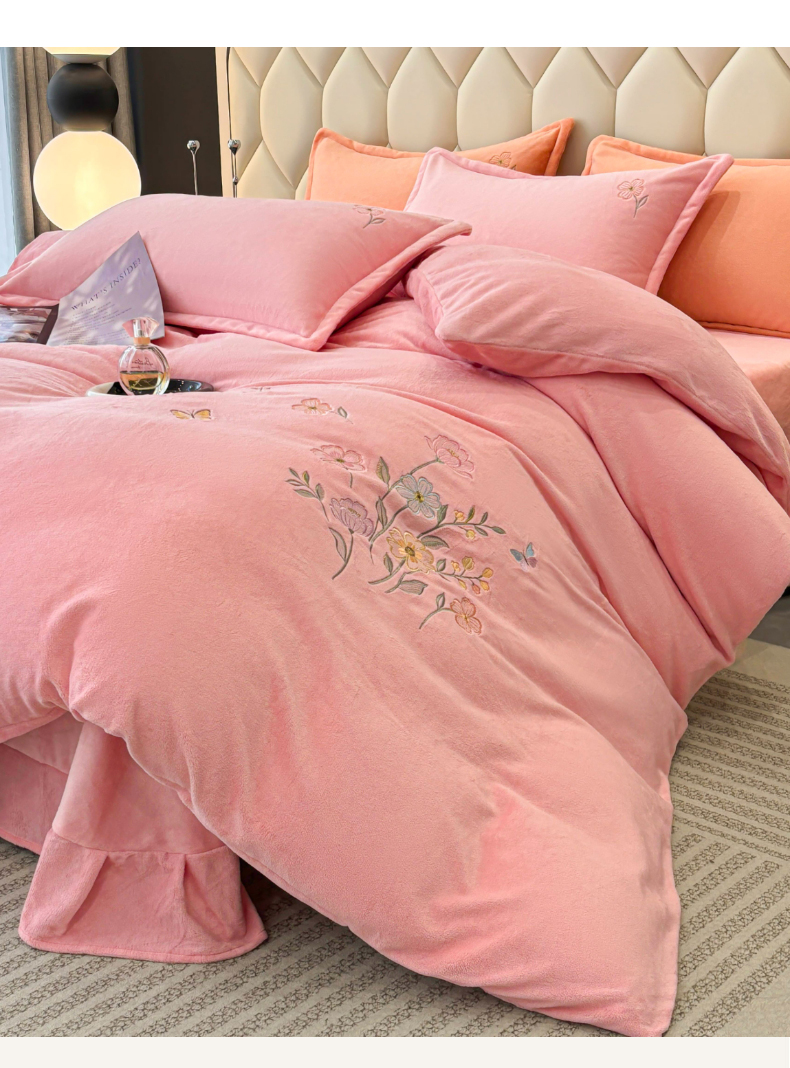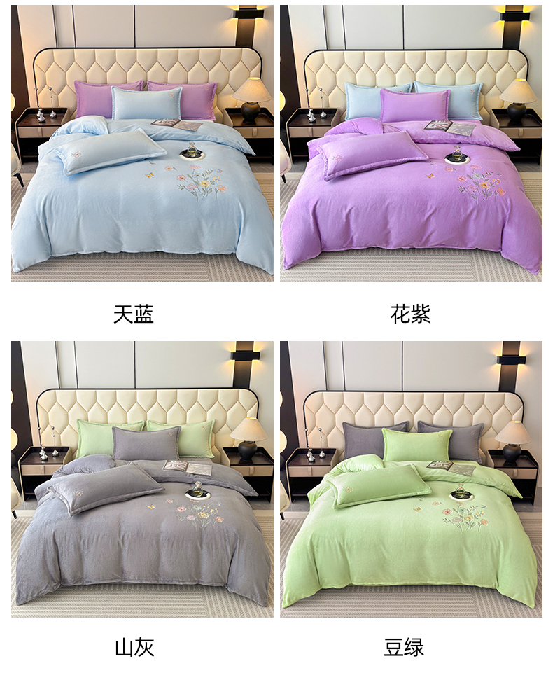 (总)织雅漫 2025新款牛奶绒绣花四件套,豆绿,山灰,橘橙,天蓝,桃粉,花紫