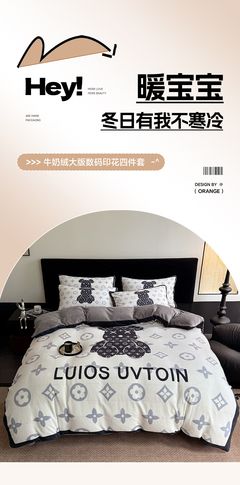 (总)摩卡(乐趣) 2025新款牛奶绒大版数码印花四件套,白香花,芬利熊,黑白V,灰迪,咔芬,卡布熊,可可熊,蓝白格,罗兰粉,萌迪,七彩熊,棋盘格公仔,山茶花,熊头白,熊仔白,熊仔咖
