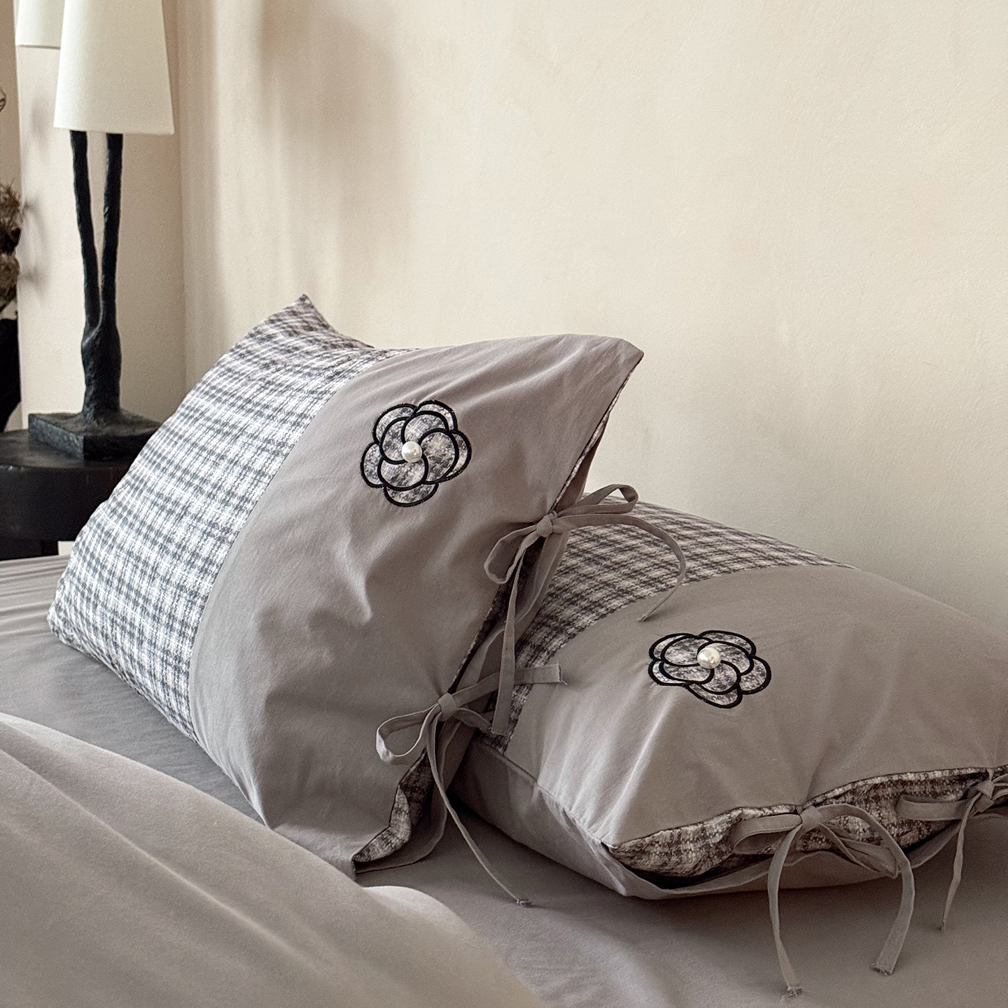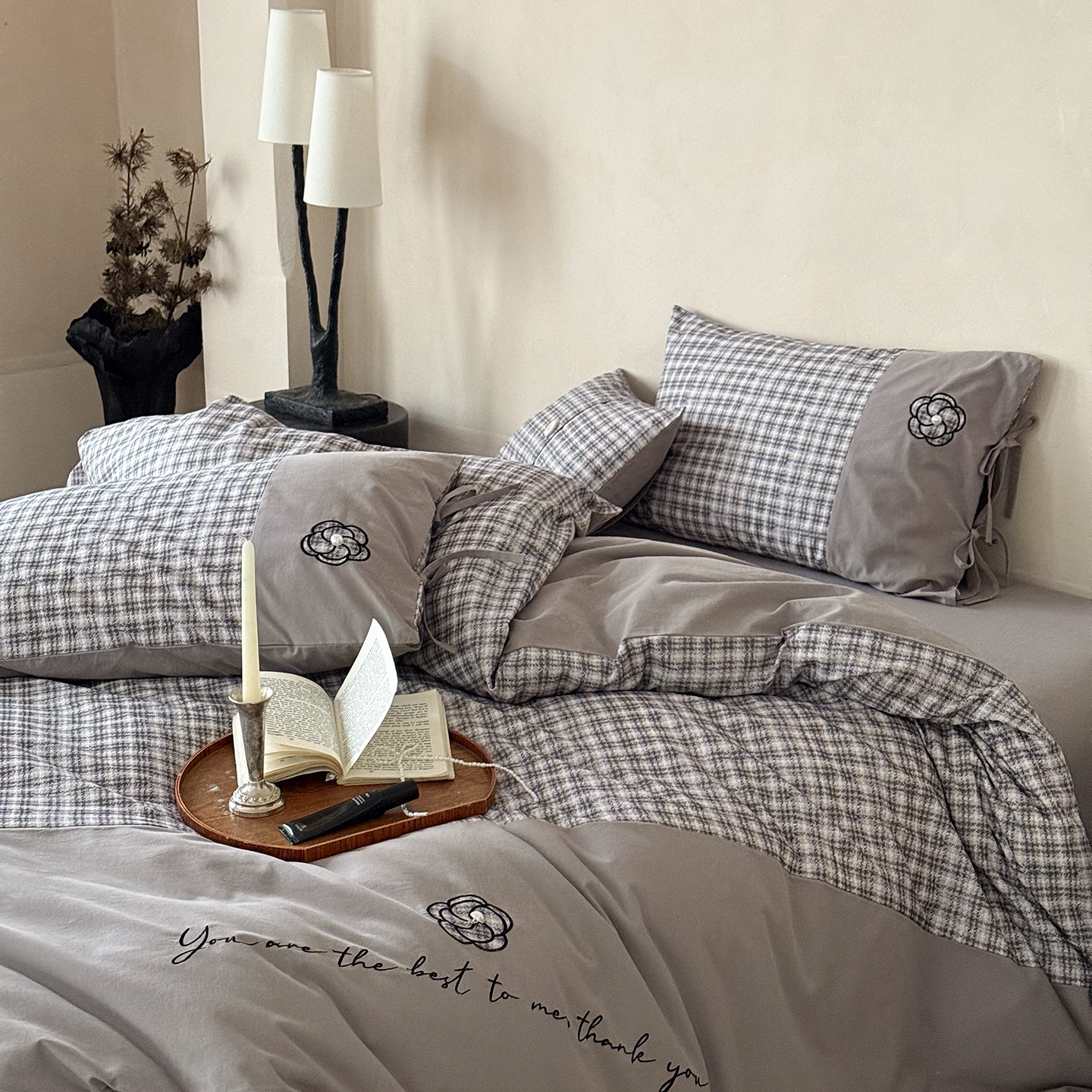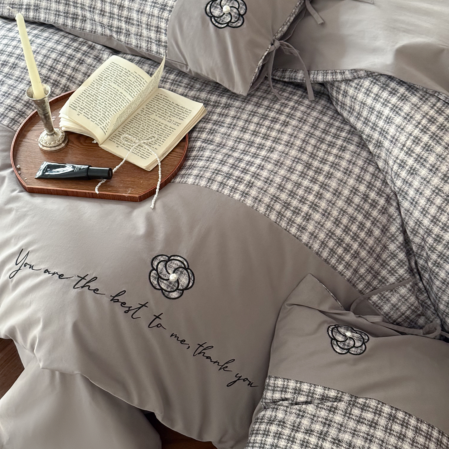 (总)优然居家纺 2025新款全棉磨毛法式小香风格纹贴布绣法式老钱风四件套-山茶花,山茶花-灰,山茶花-粉
