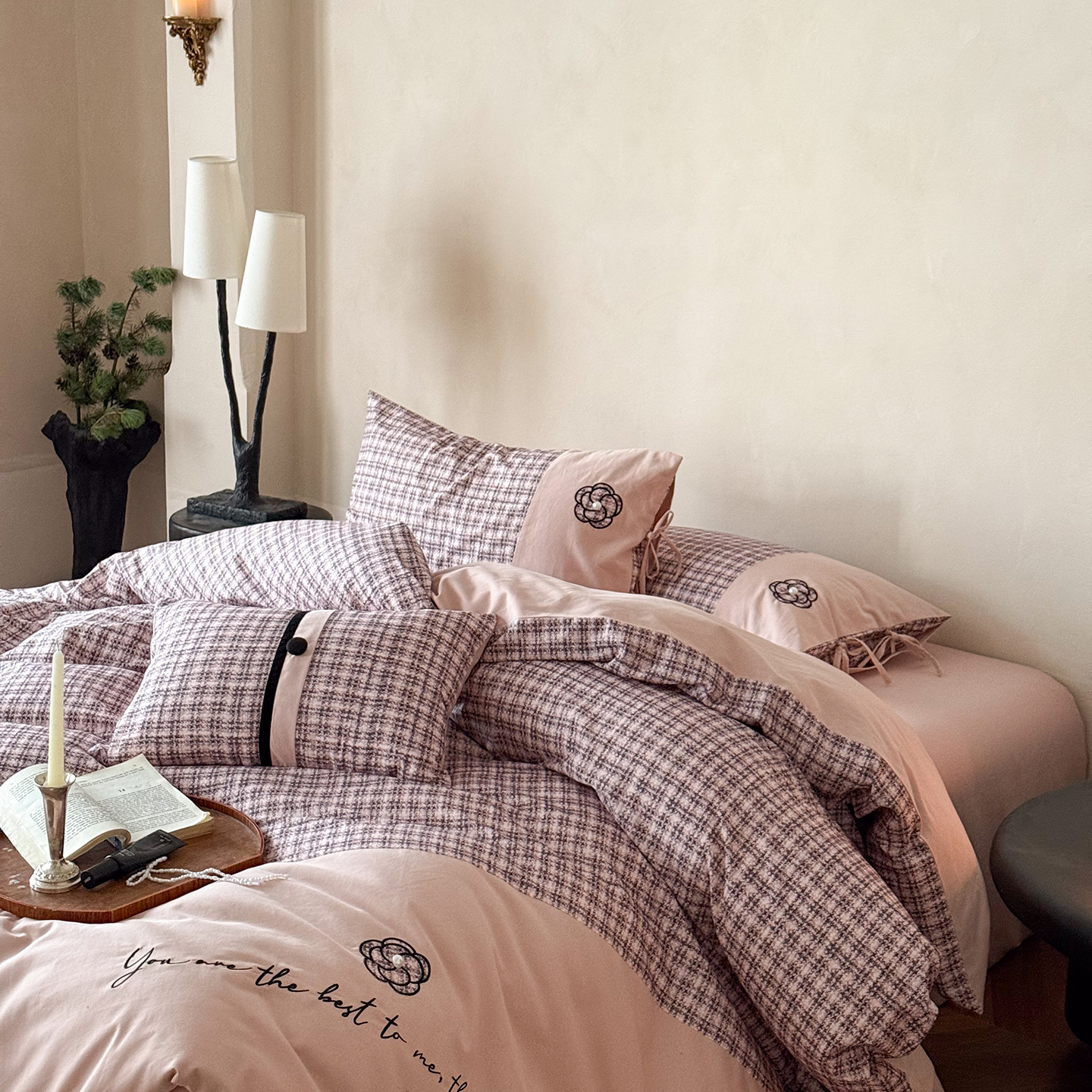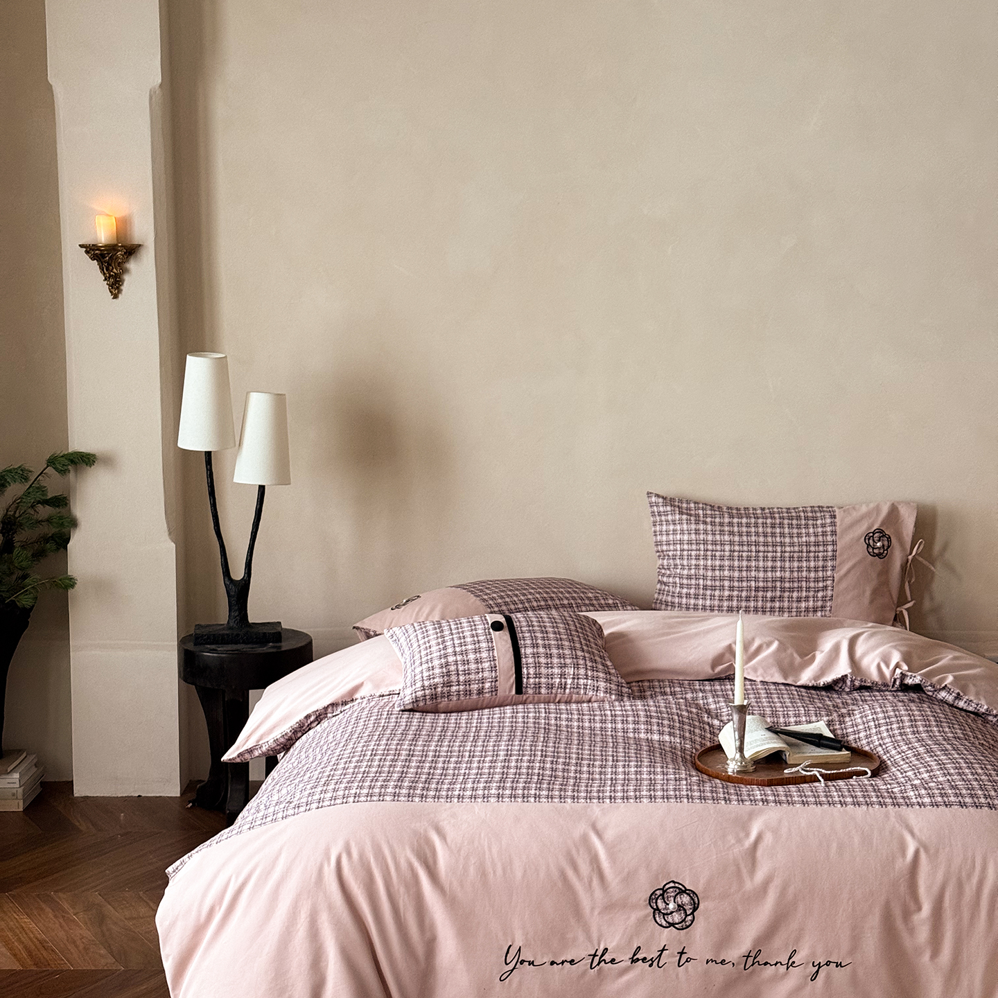 优然居家纺 2025新款全棉磨毛法式小香风格纹贴布绣法式老钱风四件套-山茶花 山茶花-粉