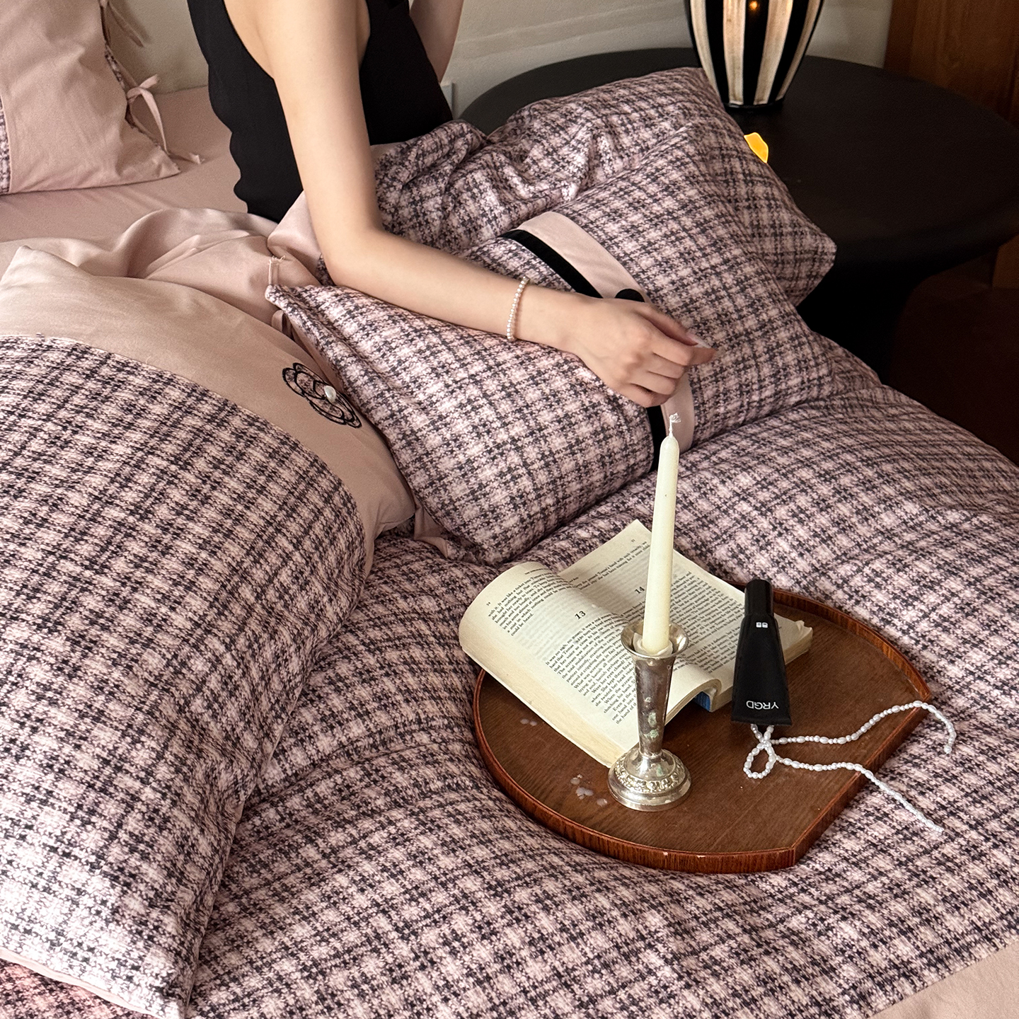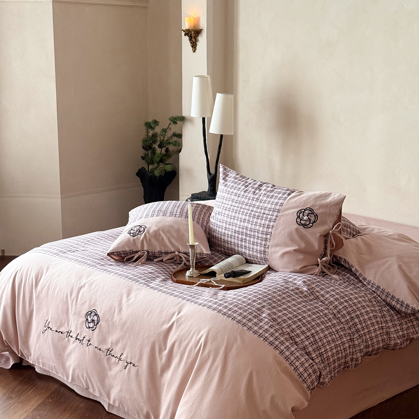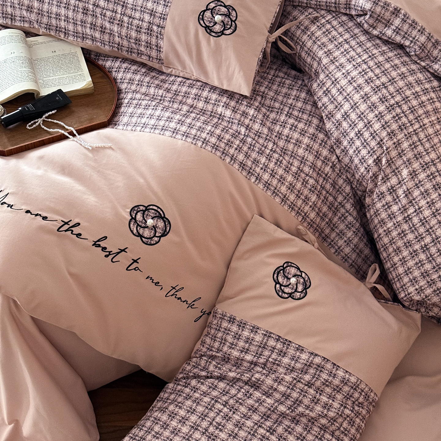 商品名称:优然居家纺 2025新款全棉磨毛法式小香风格纹贴布绣法式老钱风四件套-山茶花 山茶花-粉