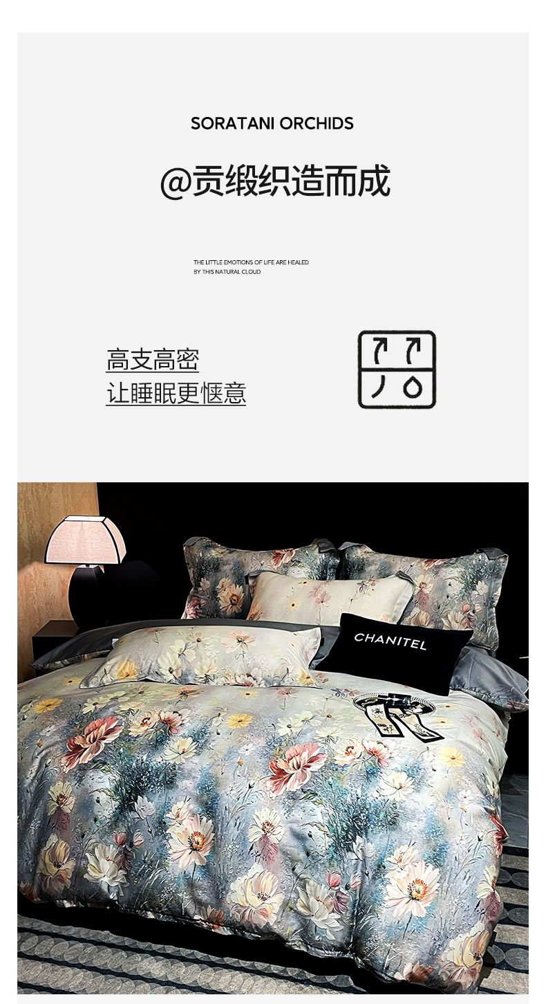 商品名称:大渔生活 2025新款贡缎长绒棉高品数码印花四件套 清梦花漪