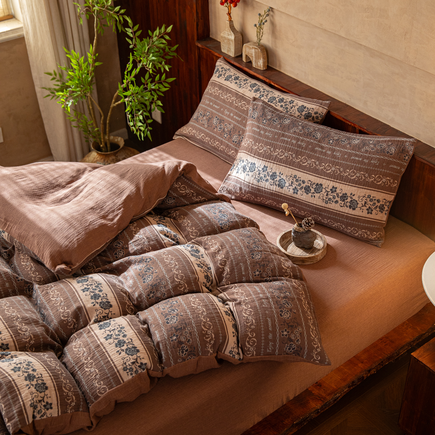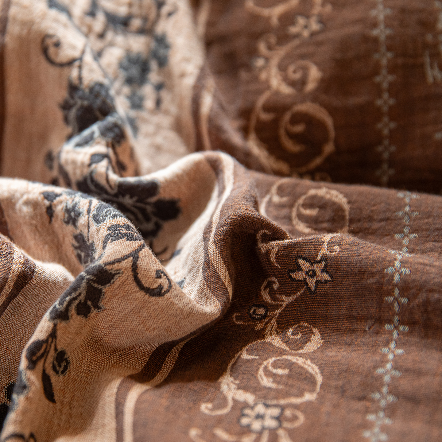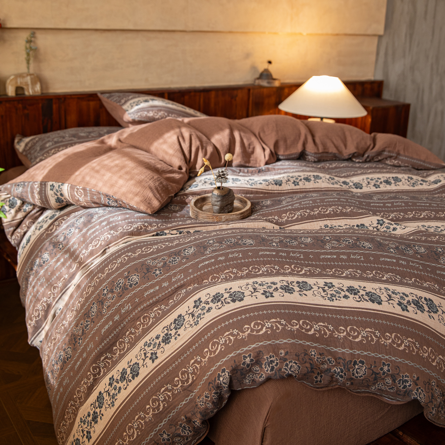 商品名称:(总)仰望棉麻双层纱供应链 2025新款全棉纯棉色织提花双层纱四件套-冬日繁花咖