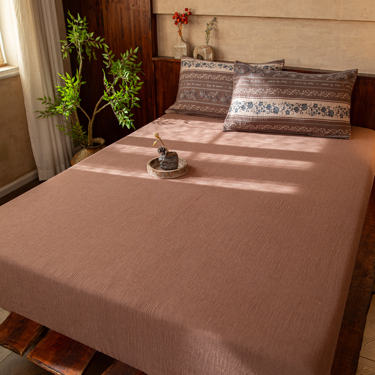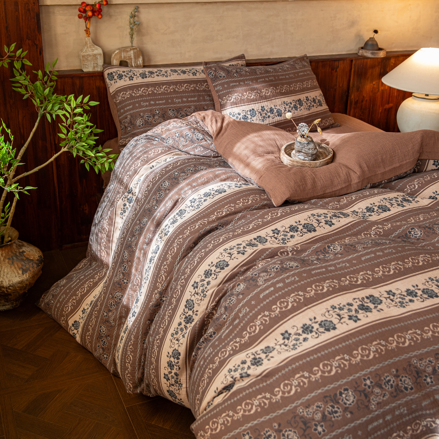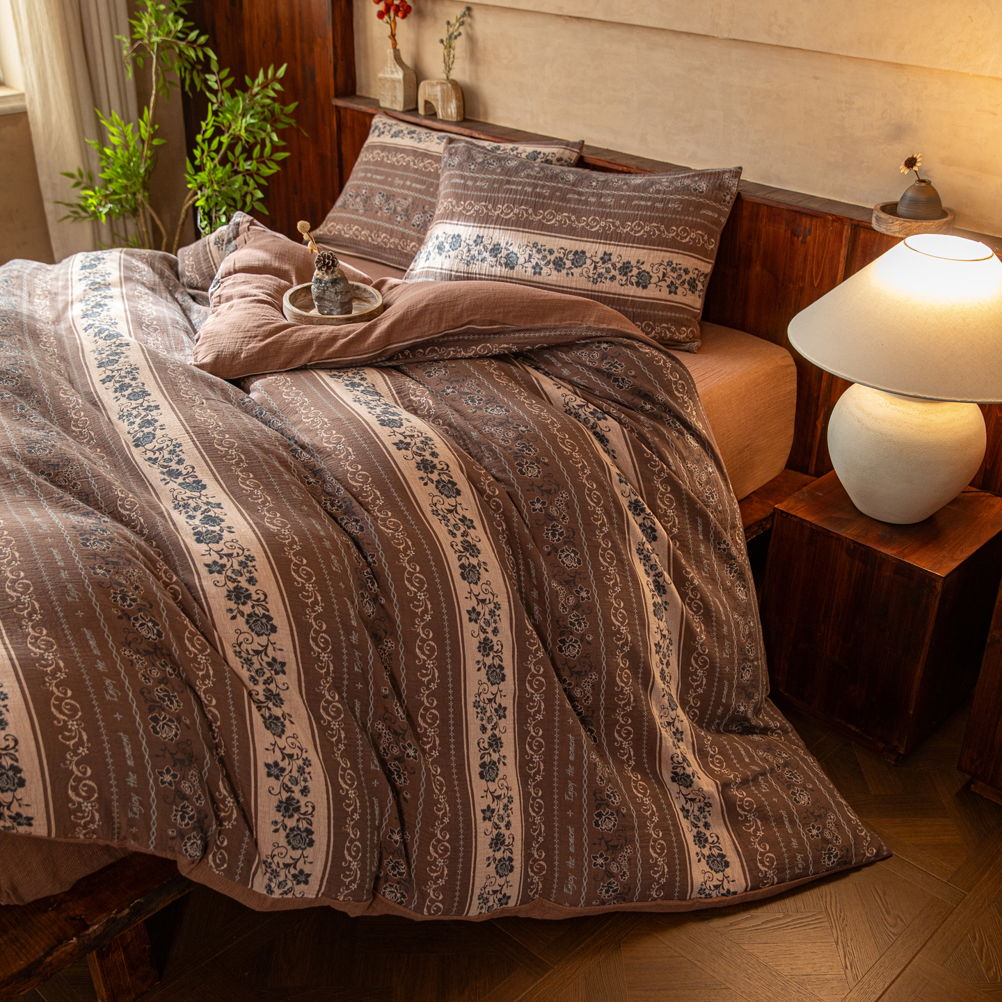 商品名称:(总)仰望棉麻双层纱供应链 2025新款全棉纯棉色织提花双层纱四件套-冬日繁花咖
