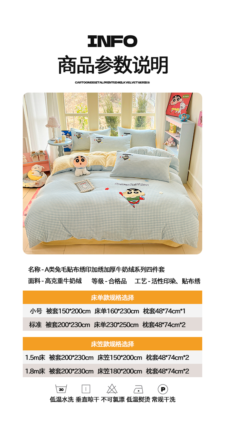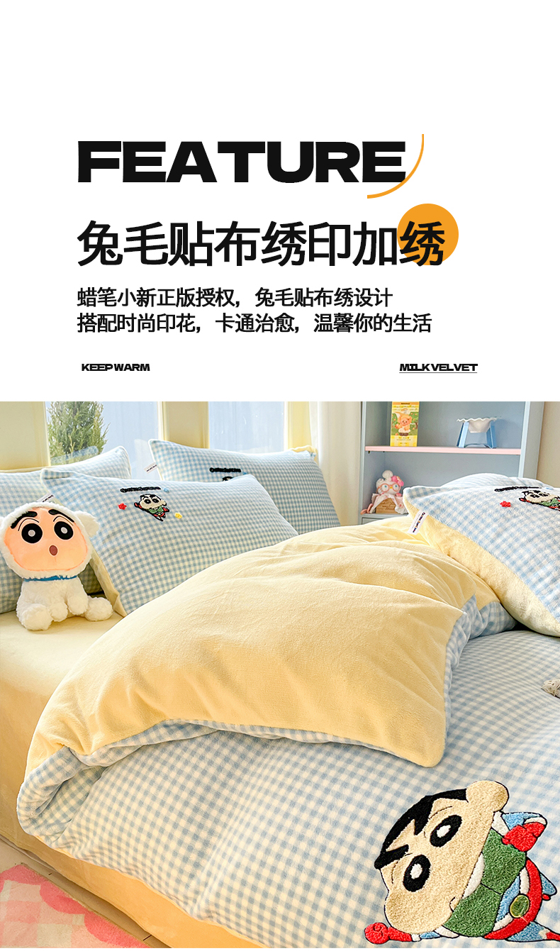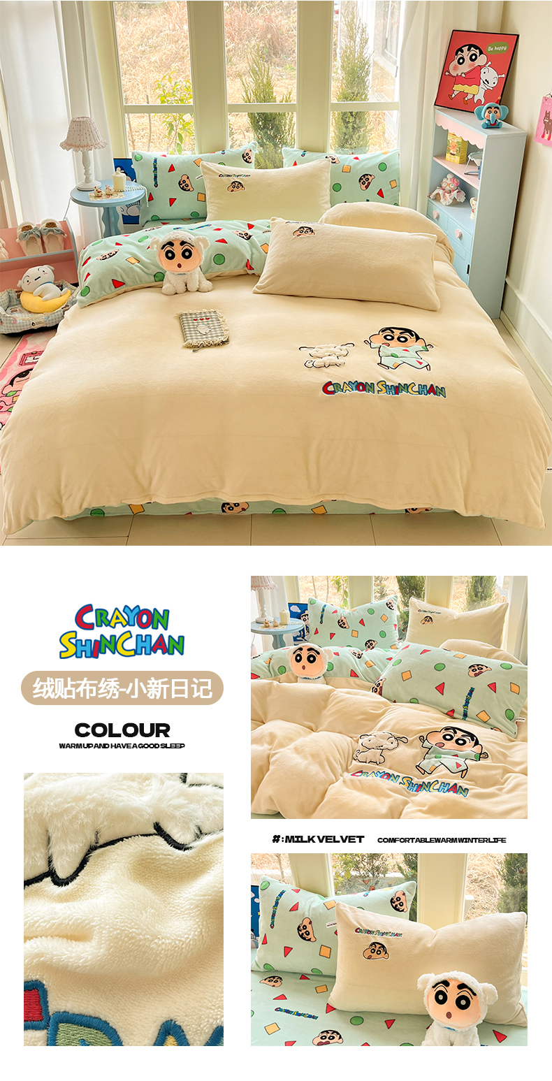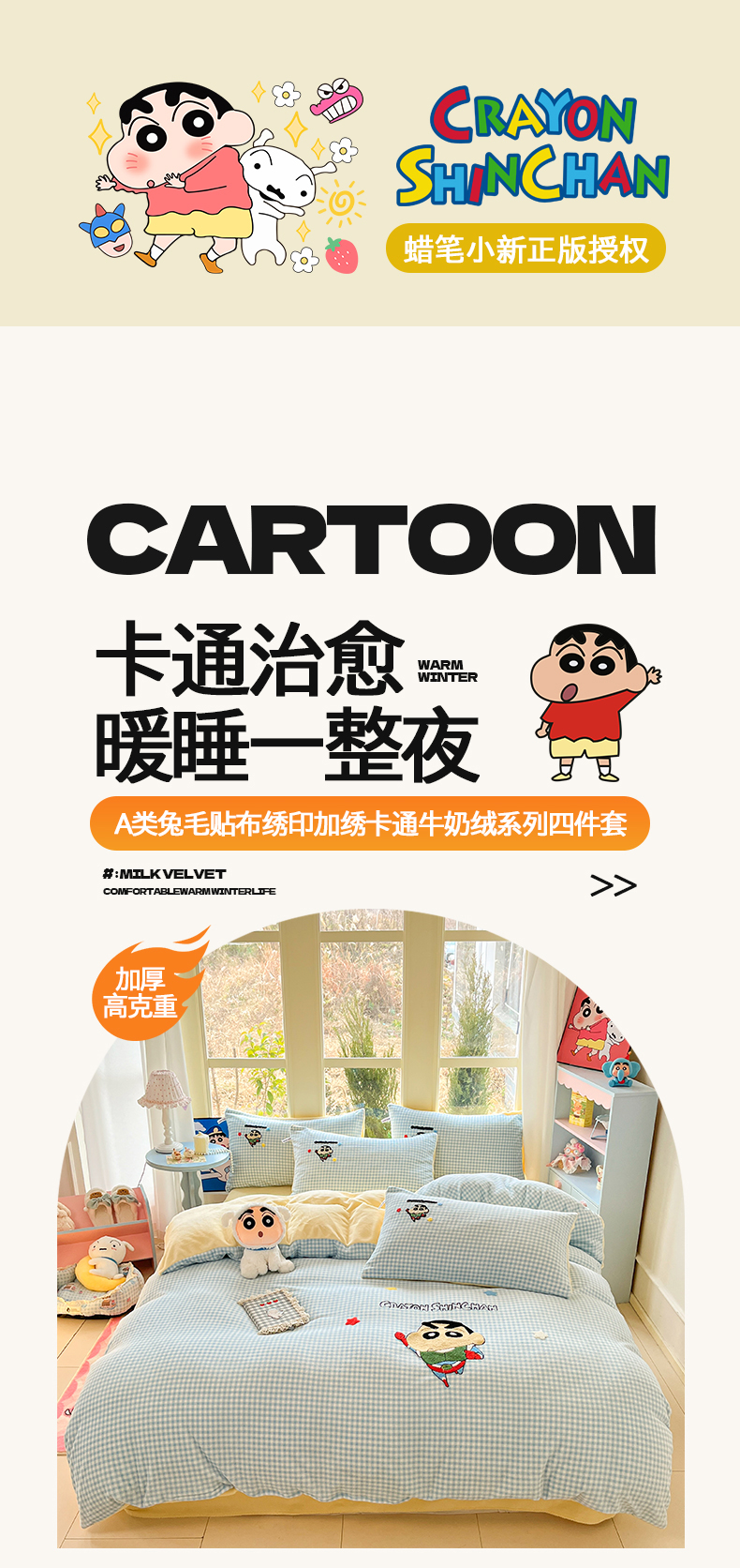 (总)桃子家居 2026新款A类蜡笔小新授权兔毛贴布绣毛巾绣印加绣卡通加厚牛奶绒系列四件套,绒贴布绣-小新日记,绒贴布绣-超人小新,绒贴布绣-快乐小新,绒贴布绣-贪睡小新,绒贴布绣-小新乐园